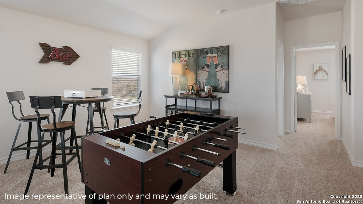 Step into The Landry, our largest two-story home at Riverstone at Westpointe in San Antonio, TX. is one of our larger floor plans. This layout features 5 bedrooms, 3.5 bathrooms and a 2-car garage. The Landry also offers 4 classic front exteriors and 2678 square feet of comfortable living. The Landry features classic designs and modern features that blend seamlessly to create the perfect space for you and your loved ones. The covered front patio (per plan) opens into a beautiful foyer and formal dining room with abundant natural light from multiple windows. The dining room leads into an open-concept kitchen with stainless steel appliances, quartz countertops, white subway tile backsplash, and an angled kitchen island that faces the spacious living room, perfect for entertaining! The private main bedroom suite is also located off the living room. Your bedroom area is spacious and you'll relax in style with large windows and quality carpet flooring. The ensuite bathroom features ceramic tile flooring, desirable double vanity sinks, separate garden tub and walk-in shower, a private water closet, and large walk-in closet with plenty of shelving. The second story of The Landry has so much to offer! A large loft area is waiting for you at the top of the stairs. Whether you use this space as a game room, office, or a media room, there is sure to be comfort. Your remaining 4 bedrooms are all located off the loft and include large windows, quality carpet flooring and spacious closets. You will also find 2 full bathrooms upstairs, complete with bath tub and shower combos and single vanity sinks. This floor plan even has a linen closet! Additional features include tall 9-foot ceilings, 2-inch faux wood blinds throughout the home, luxury vinyl plank flooring in the entry, family room, kitchen, and dining area, ceramic tile in the bathrooms and utility room, pre-plumb for water softener loop, and full yard landscaping and irrigation. You'll enjoy added security in your new home with our Home is Connected features. Using one central hub that talks to all the devices in your home, you can control the lights, thermostat and locks, all from your cellular device.