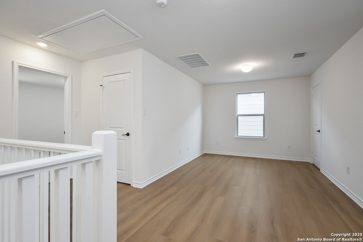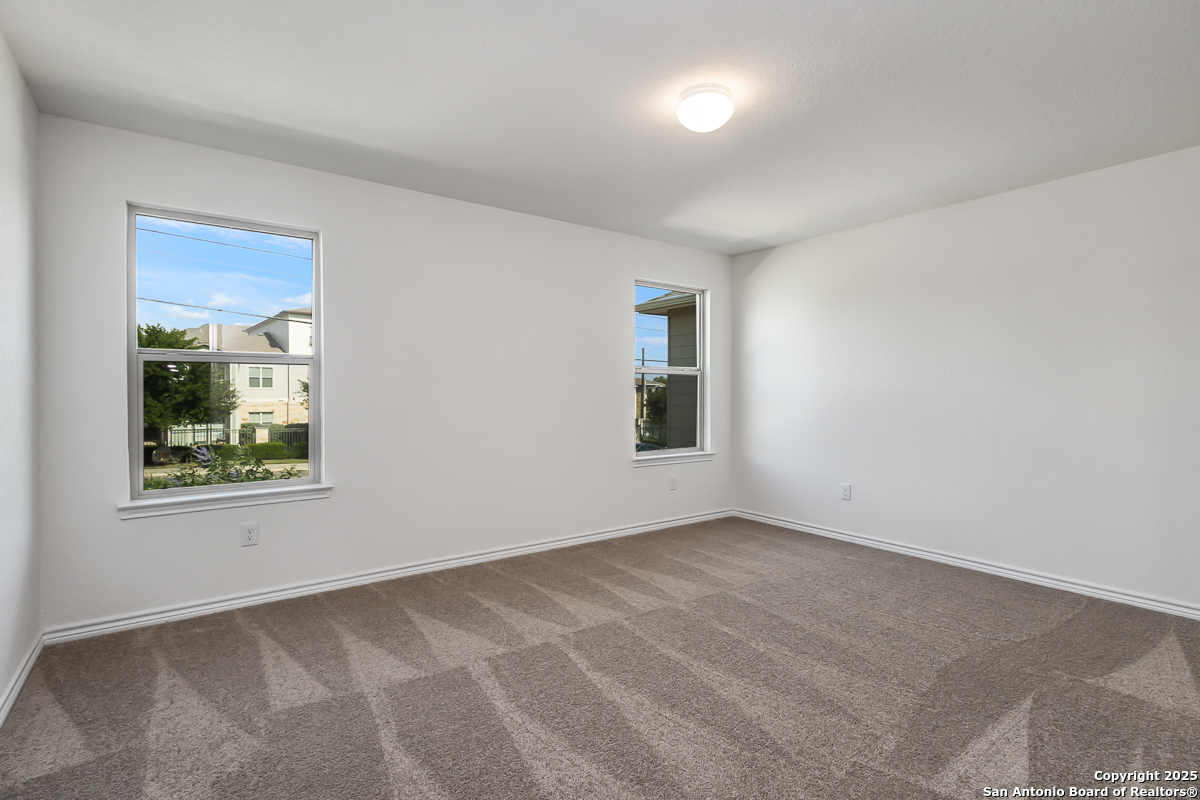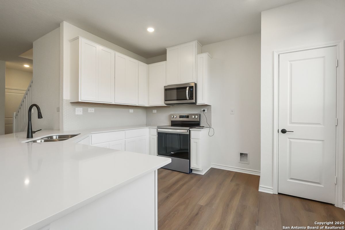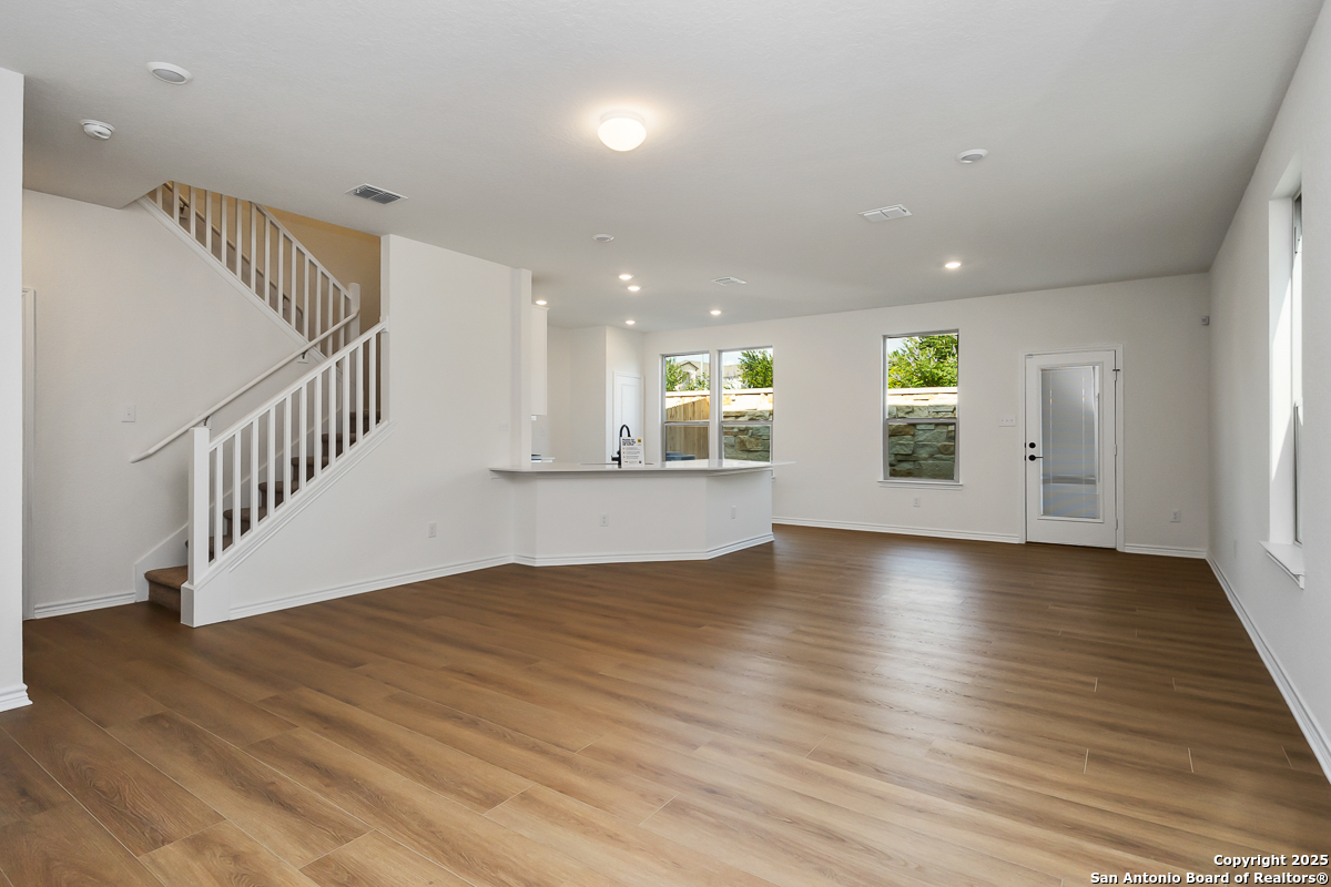 This thoughtfully designed home features 9-ft. first-floor ceilings for a spacious and airy feel. The modern kitchen boasts Whirlpool stainless steel appliances, Woodmont Dakota Shaker panel 42-in. upper cabinets, a Daltile tile backsplash, and an extended breakfast bar for added convenience. The primary bath offers a raised dual vanity, upgraded cabinets, and a luxurious 42-in. shower with a Daltile tile surround. Stylish details include a Carrara-style entry door, Kwikset Ladera interior door hardware, and durable vinyl plank flooring in the kitchen, bathrooms, and living room. Additional highlights include a soft water loop, a wireless security system, a full gutter system, an automatic sprinkler system, and a fully sodded yard for easy outdoor maintenance