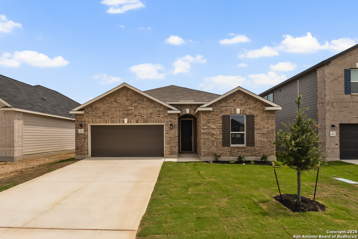 This beautifully designed home features 9-ft. first-floor ceilings, creating a bright and open atmosphere. The stylish kitchen boasts Whirlpool stainless steel appliances, Woodmont Cody 42-in. upper cabinets, an extended breakfast bar, and a sleek Moen high arc faucet. The primary bath offers upgraded cabinets and a relaxing 42-in. garden tub/shower with a Daltile tile surround. Elegant finishes include GenerationsTM lighting fixtures, a Carrara-style entry door, Kwikset Polo knob hardware, and durable Stella Vista ceramic tile flooring in the kitchen, bathrooms, and great room. Additional highlights include a wireless security system, an automatic sprinkler system, and a fully sodded yard for effortless outdoor beauty.