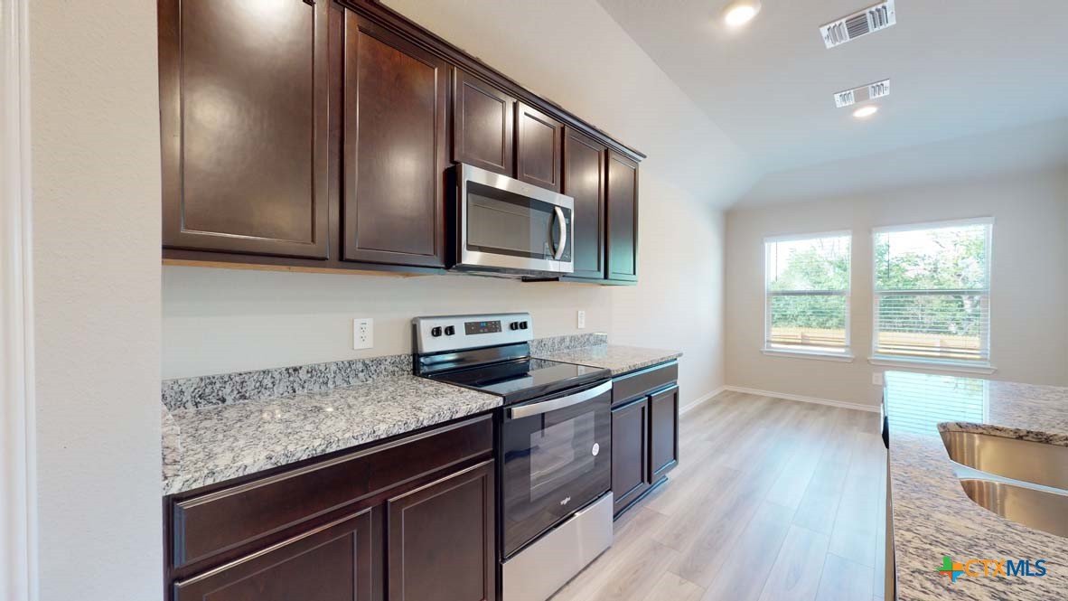 The Bellvue is a single-story, 3-bedroom, 2-bathroom home featuring approximately 1,415 square feet of living space. The foyer opens into the spacious family room, and open-concept kitchen and dining room. The kitchen includes a perfect island for entertaining and corner pantry. The main bedroom, bedroom 1, is perfectly sized and features an attractive bathroom with dual vanities and spacious walk-in closet. Additional finishes include granite countertops and stainless-steel appliances. You’ll enjoy added security in your new D.R. Horton home with our Home is Connected features. Using one central hub that talks to all the devices in your home, you can control the lights, thermostat, and locks, all from your cellular device. With D.R. Horton's simple buying process and ten-year limited warranty, there's no reason to wait! (Prices, plans, dimensions, specifications, features, incentives, and availability are subject to change without notice obligation)