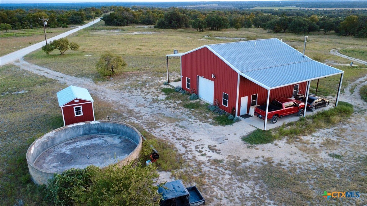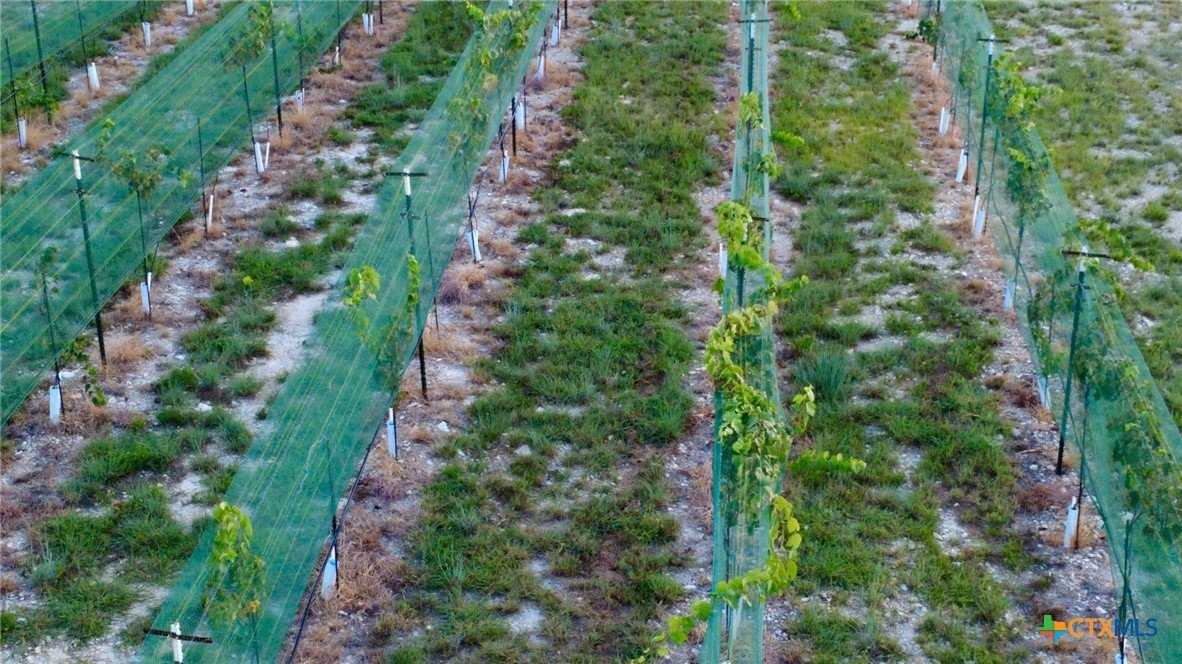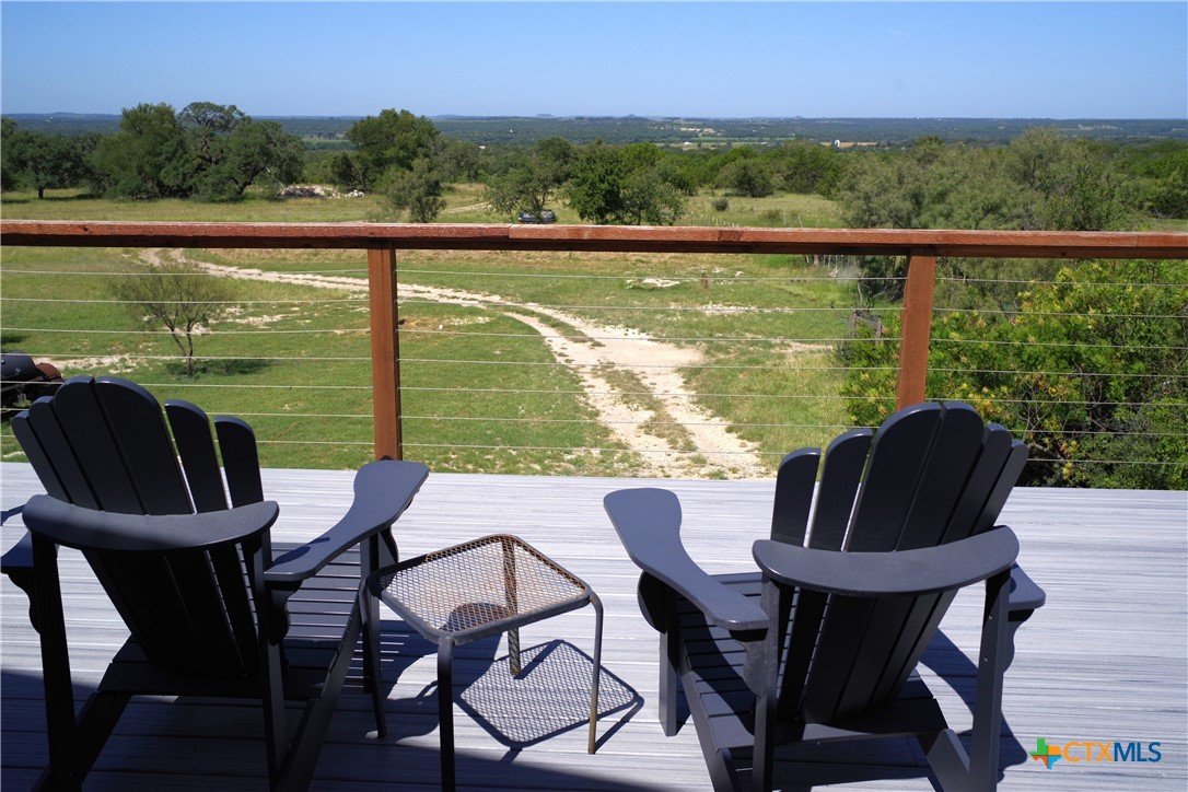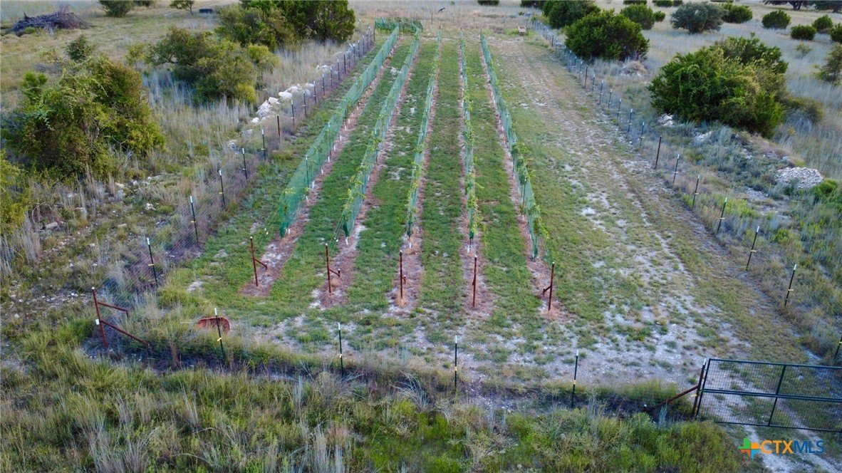 A 41 acre ranch with spectacular hill country views within an hour+ of Austin in a secluded, gated large lot community. Don’t miss a chance to live the ranch life away from the noise and traffic of the city. A total of 2400 sq ft of space including 1600 sq ft metal roof barndominium with an upstairs 800 sq ft fully built out living area furnished to satisfy those who enjoy cooking, including a Kucht 36” range, granite countertops, and beautiful cabinets designed for maximum utility and storage. The 14’ vaulted ceiling makes the space cool and airy. Delicious RO treated water is delivered directly to the refrigerators.. The whole space is insulated with closed cell foam insulation and is cooled and heated with efficient mini-splits plus also includes a fully working wood stove. A durable Trex deck with incredible long distance views lets you take in gorgeous sunsets and beautiful panoramas of Texas beauty. The downstairs is equipped with a full bath and a commercial 3 basin sink to handle larger entertainment settings. A commercial blodgett french door oven is negotiable. As if this was not enough, the property also includes a small gentleman’s vineyard of about 100 3 year old tempranillo vines in about ½ acre with automatic watering. A full water/electric/septic RV hookup is all ready for your vacationing friends. There are two wells on the land, one an old time wind driven well plus the currently hooked up well that is electric powered. The land is full of mature oaks and elms with plenty of hunting opportunities. A food plot of about an acre has been cleared and planted for several years, attracting both whitetail deer and axis. A wet weather pond of about ½ acre collects and retains water for the wildlife. A simple road association maintains the road running through the whole community. Large tracts like this are uncommon, and even less common are large higher elevation parcels with exceptional hill country views.