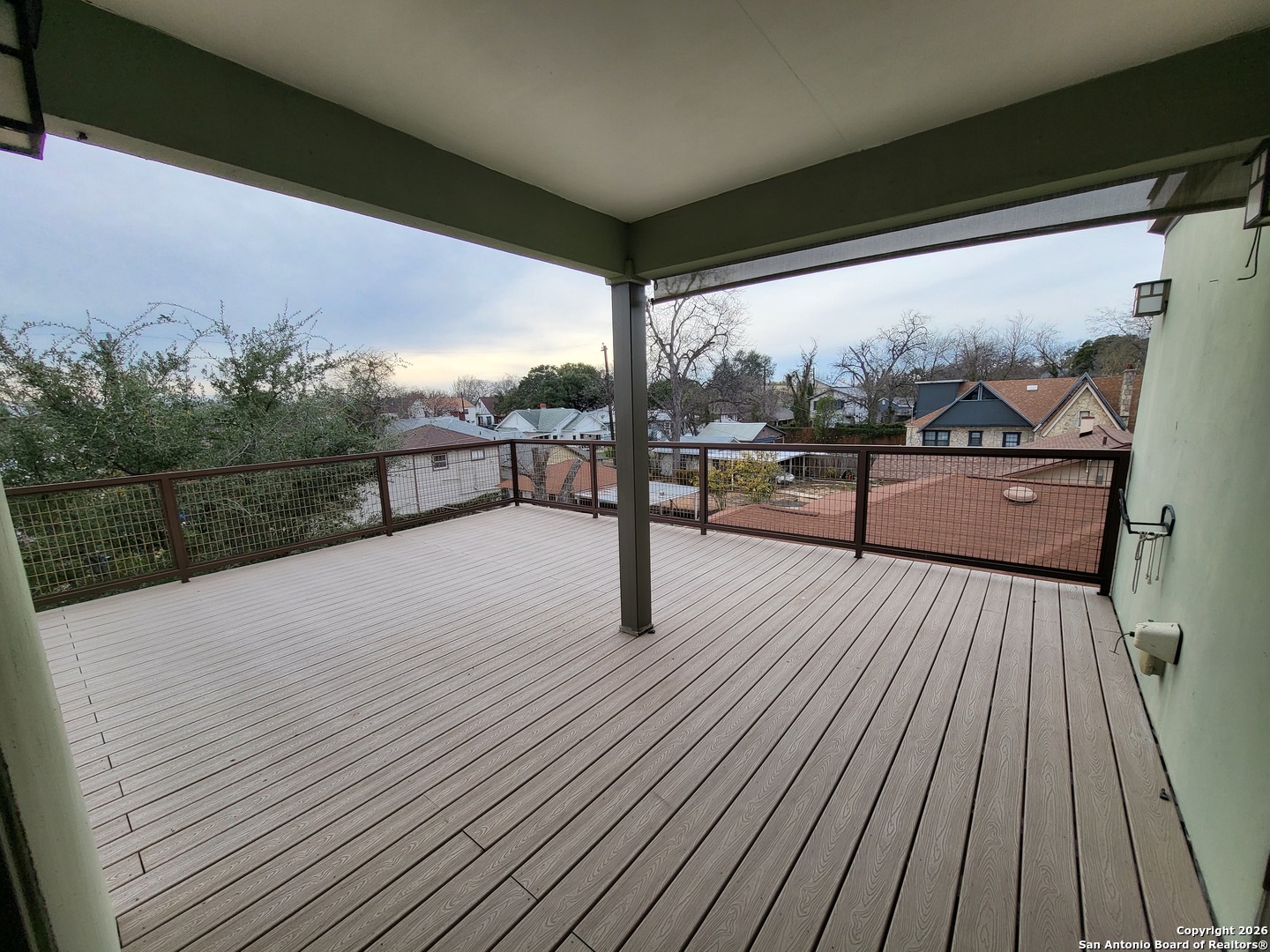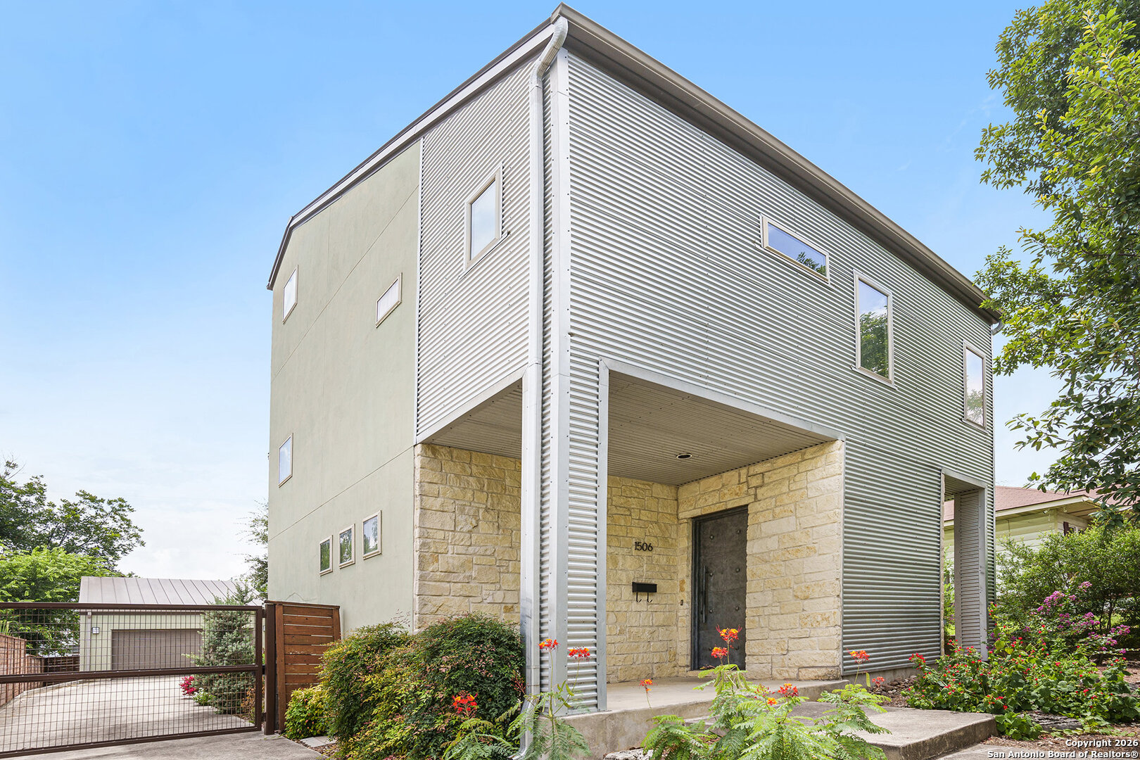Contemporary Home in Woodlawn Terrace Property Overview Discover this custom-built contemporary home located in the charming Woodlawn Terrace neighborhood. Constructed in 2009, this stylish residence showcases modern architectural elements and thoughtful design features throughout. Exterior Features The home boasts a durable metal roof and a custom metal front door, providing both security and unique curb appeal. Additional exterior highlights include an automatic gate for convenient access, privacy fencing for seclusion, and easy-care xeriscape landscaping that enhances the property's aesthetic while minimizing maintenance. Interior Details Step inside to an open layout that creates a welcoming atmosphere. The main level features sleek concrete floors, while the upper level is adorned with elegant bamboo wood, adding warmth and character. The gourmet kitchen is equipped with granite countertops and maple cabinets, ideal for cooking and entertaining. Modern Amenities This well-maintained home is outfitted with a water softener for improved water quality and comfort. The HVAC system is efficient ensuring reliable climate control. A pass-through outlet for a generator is conveniently located on the patio, providing peace of mind during power outages. Primary Suite The spacious primary suite features a large walk-in closet for ample storage and an oversized shower for a luxurious bathing experience. Outdoor Living Relax or entertain guests on the covered patio or the expansive trek deck, both offering beautiful views of downtown San Antonio. These outdoor spaces are perfect for enjoying the serene surroundings or hosting gatherings. Additional Features Completing this modern retreat is a detached oversized two-car garage, providing plenty of space for vehicles and storage. The property is ideally situated just minutes from Woodlawn Lake Park, allowing easy access to recreational activities and natural beauty.