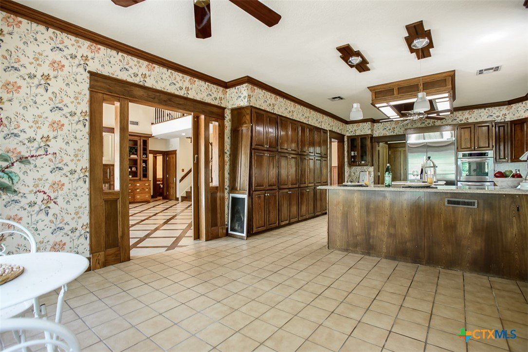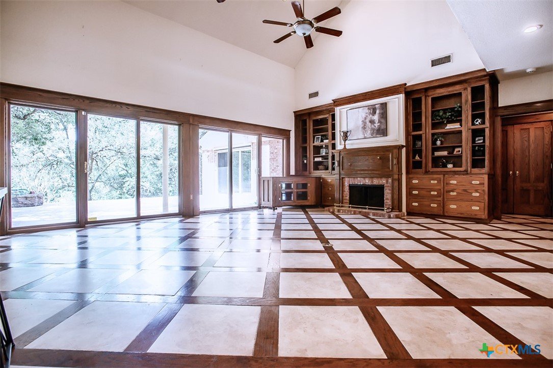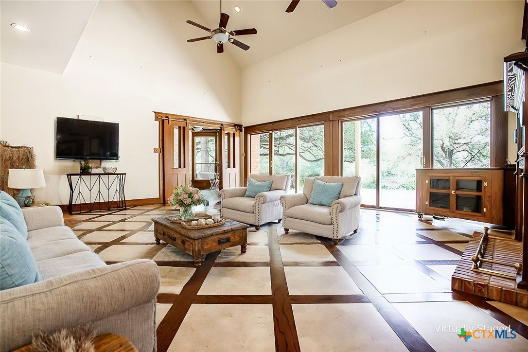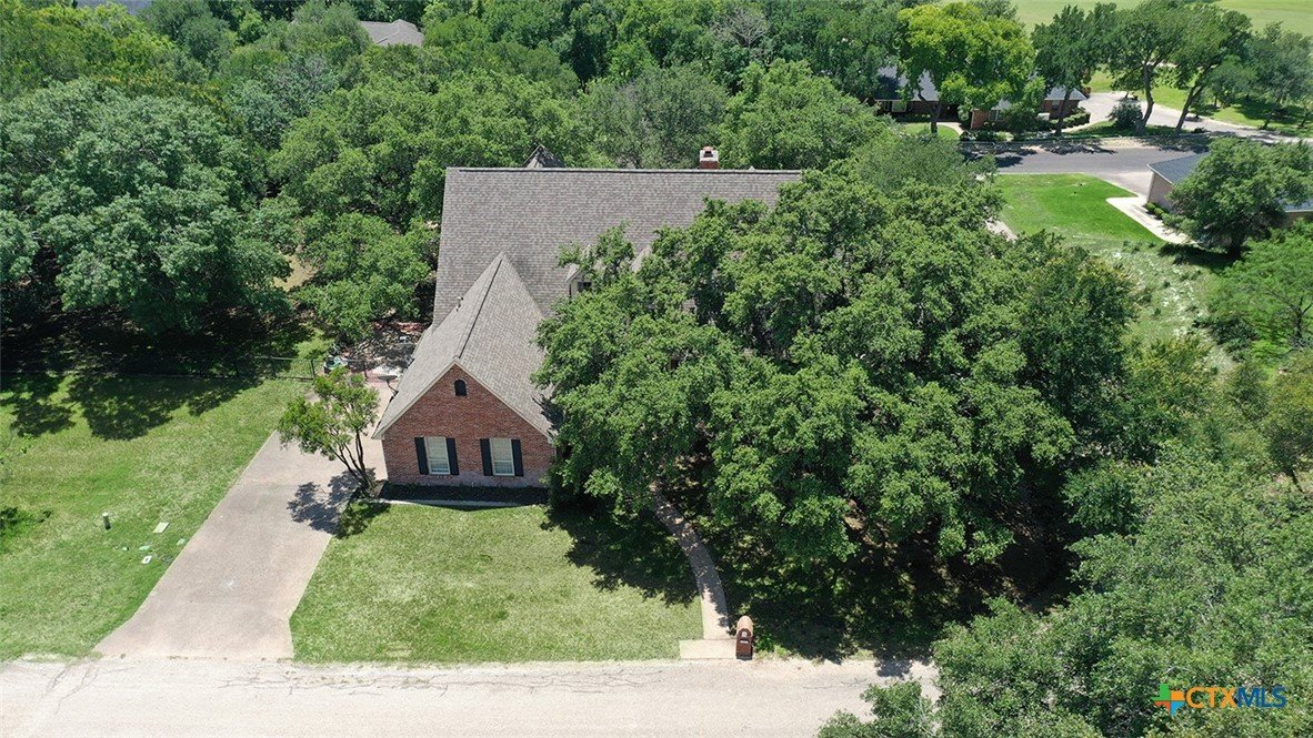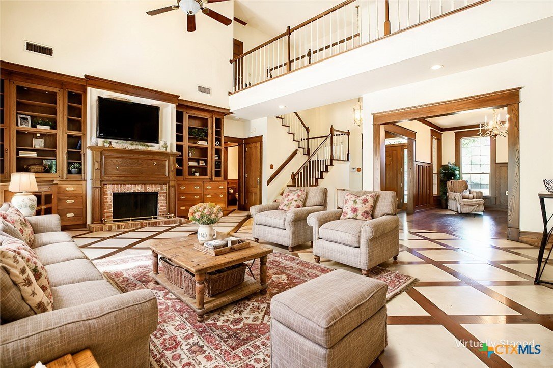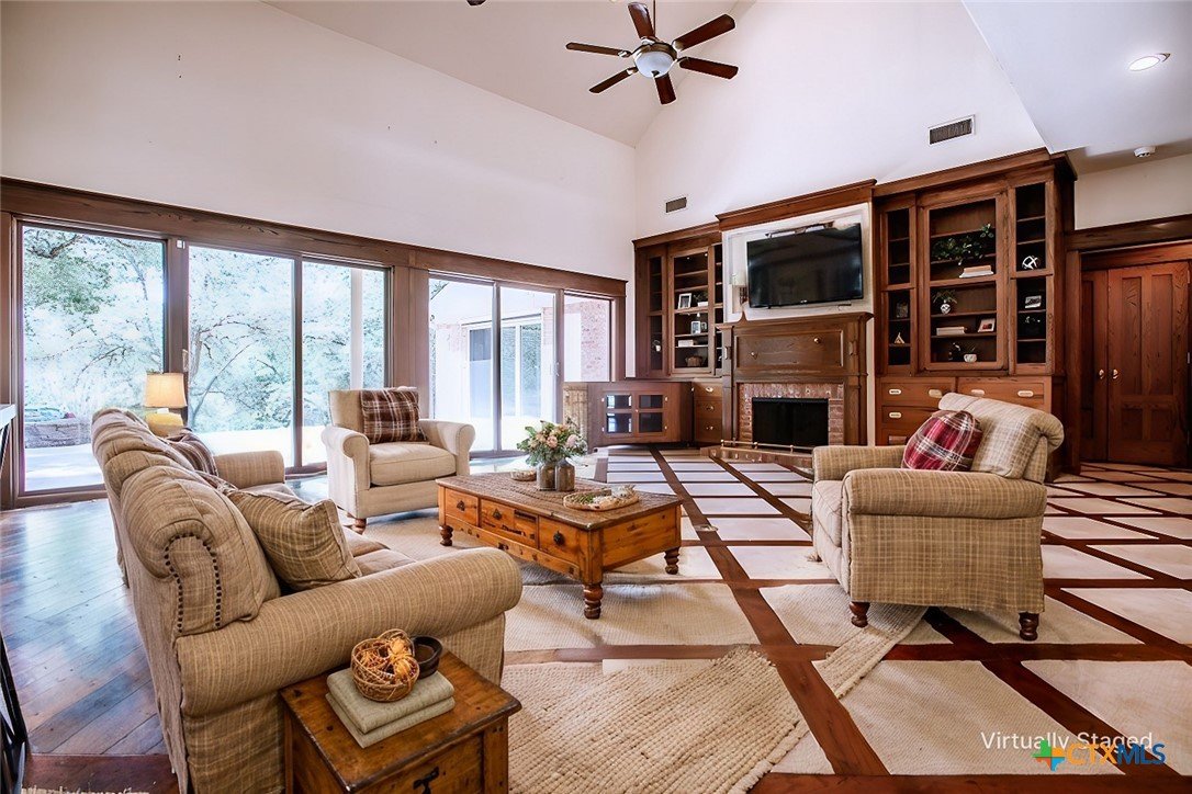 Ideally located within a secluded cul-de-sac, this exceptional residence unveils a lifestyle of unparalleled tranquility and luxury. Poised atop a gentle hill, this double-lot sanctuary offers a panoramic view, with the lush green expanse of a golf course below. Step inside to discover an interior that seamlessly marries elegance with versatility. A grand entrance beckons you into a sprawling floorplan, where every detail has been meticulously crafted to elevate your living experience. Towering ceilings greet you in the expansive family room, where a dramatic two-story expanse opens up, drawing in natural light through a wall of sliding glass doors. Here, a majestic fireplace, ensconced within custom built-ins, stands as the focal point of cozy gatherings, while stunning floors, adorned with a unique blend of tile and criss-crossing wood, imbue the space with warmth and character. Entertain in style in the formal dining room, where rich wood wainscotting lends an air of sophistication to every meal. The sprawling island kitchen beckons culinary adventures, with an attached breakfast area providing the perfect setting to savor morning moments. Retreat to the owner's suite, where an attached flex room offers boundless possibilities, including a discreet storage room secured behind a safe vault door. Upstairs, a versatile flex room awaits, lined with built-ins to accommodate your every need. Two secondary bedrooms, connected by a Jack & Jill bathroom, offer comfort and convenience, complete with an additional washer and dryer for added ease. Outside, an open patio invites al fresco gatherings, overlooking an expansive backyard dotted with mature trees and a storage building. Other notable features include a whole house generator for peace of mind, attic stairs leading to the top of the living room for effortless maintenance, a new AC system installed in 2022, and a convenient sink in the garage for added functionality.