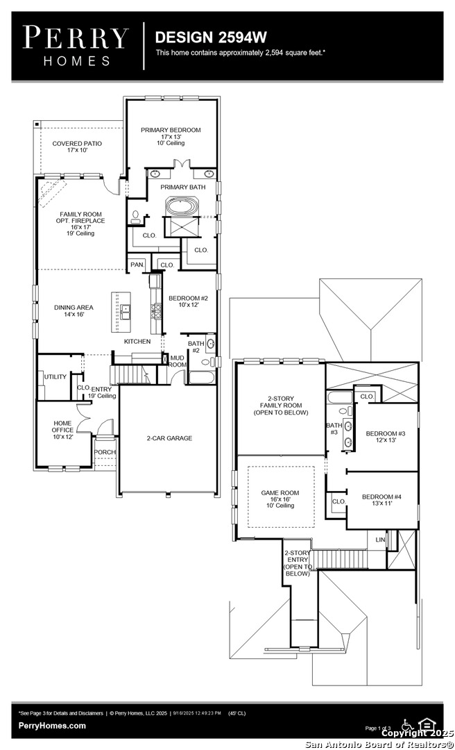 Home office with French doors set at two-story entry. Dining area opens to kitchen and adjacent two-story family room. Kitchen features walk-in pantry, 5-burner gas cooktop and generous island with built-in seating space. Family room features wall of windows. First-floor primary suite includes primary bath with dual vanity, garden tub, separate glass-enclosed shower and two walk-in closets. An additional bedroom is downstairs. A game room and two secondary bedrooms are upstairs. Covered backyard patio and 5-zone sprinkler system. Mud room off two-car garage.