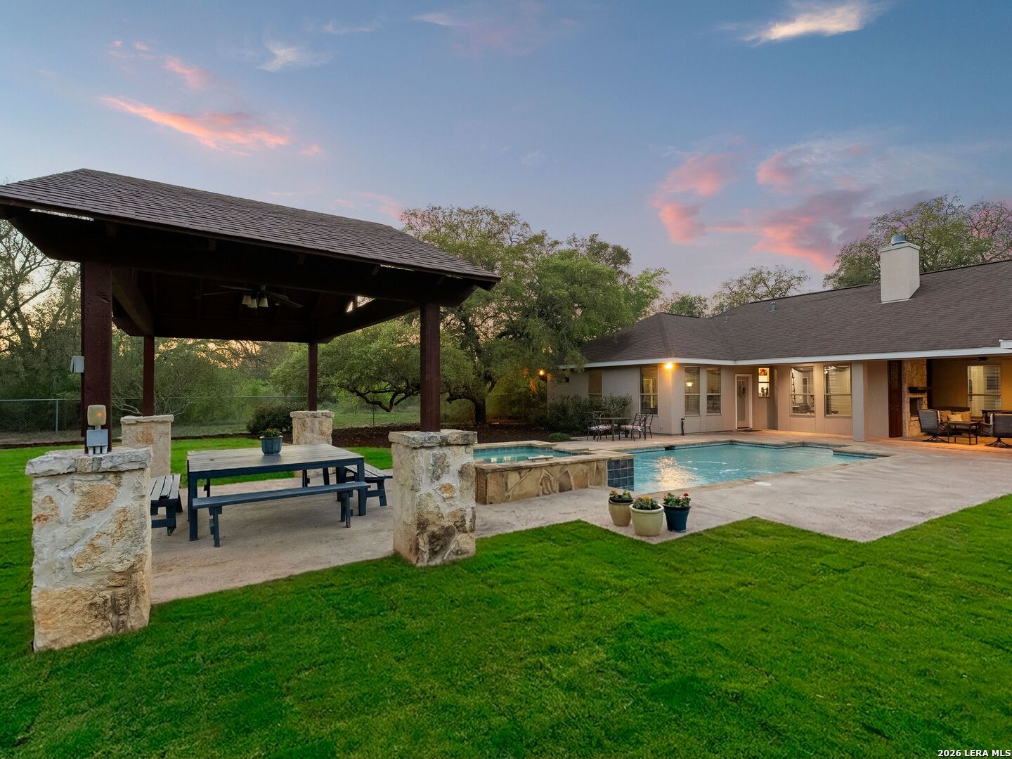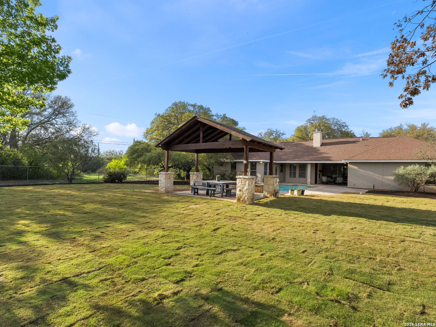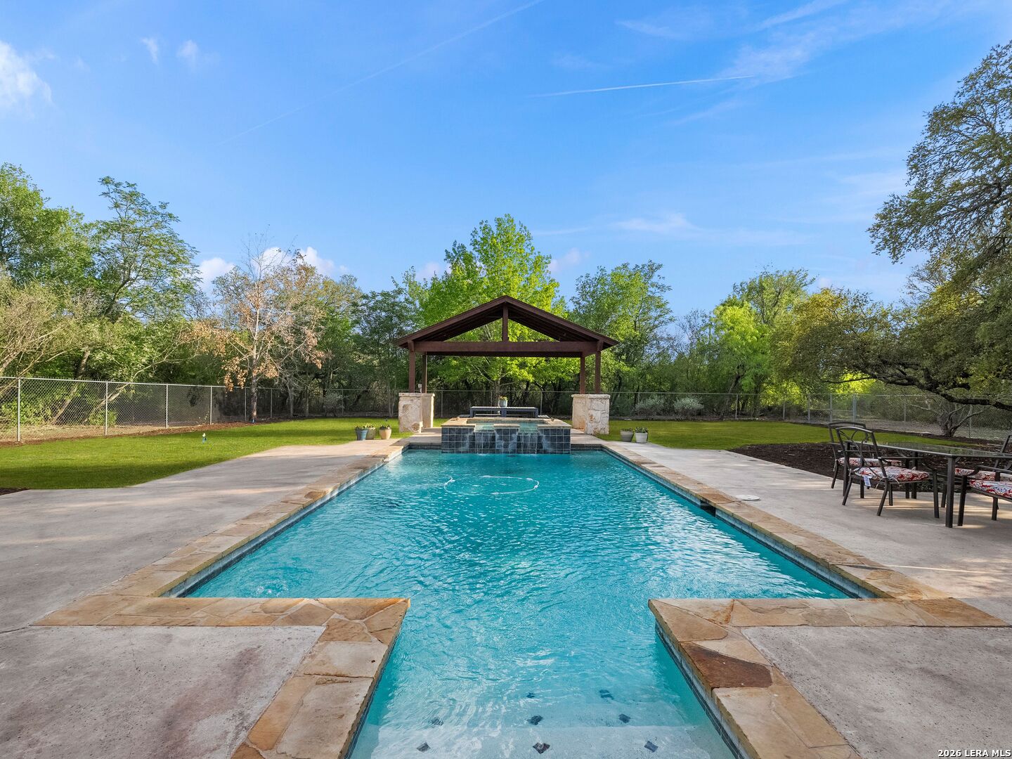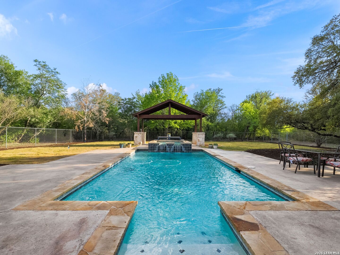 Set on a beautiful 2-acre lot backing to a peaceful greenbelt, this freshly painted custom-built one-story home offers privacy, space, and thoughtful design in a highly sought-after area with excellent schools. Surrounded by mature trees and a large private yard, the property provides a quiet setting while still being convenient to nearby amenities. With 2,776 square feet, the home features 3 bedrooms and 2.5 bathrooms and includes ADA-compliant design elements for comfort and accessibility. The well-designed floor plan offers multiple spaces for gathering and entertaining, including an oversized family room, formal dining room, and a formal living area. The expansive family room provides plenty of space for a billiards table, creating a flexible entertaining environment. Custom built-ins throughout the home add both character and functional storage. The kitchen is designed for everyday living and hosting with a few modern updates and includes a new water filtration system, large walk-in pantry and an island for additional workspace. Step outside to enjoy the recently updated landscape, sprinkler system and covered patio with an outdoor fireplace, overlooking the swimming pool/spa and expansive backyard with covered gazebo and framed by towering mature trees and backing to your extended lot and greenbelt for added privacy. Additional highlights include a drive-through garage, two-car garage parking, and the rare opportunity to enjoy two acres in one of the area's most convenient and desirable locations with restaurants, entertainment, retail and parks close by.