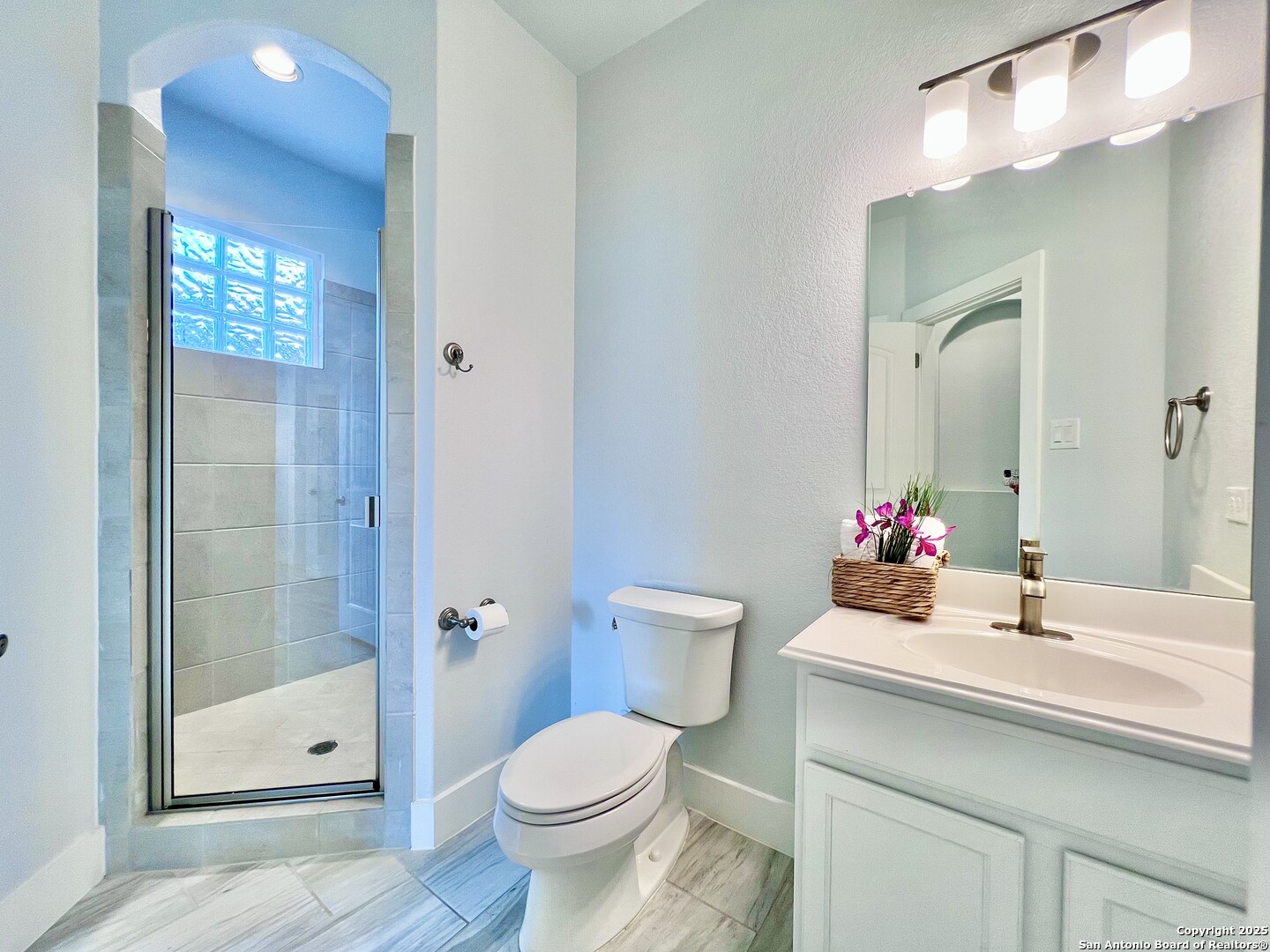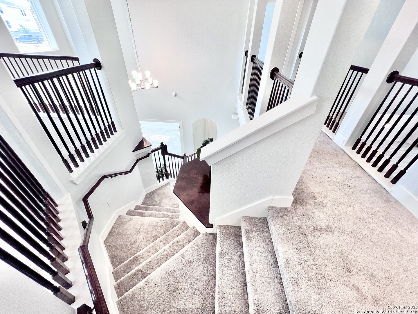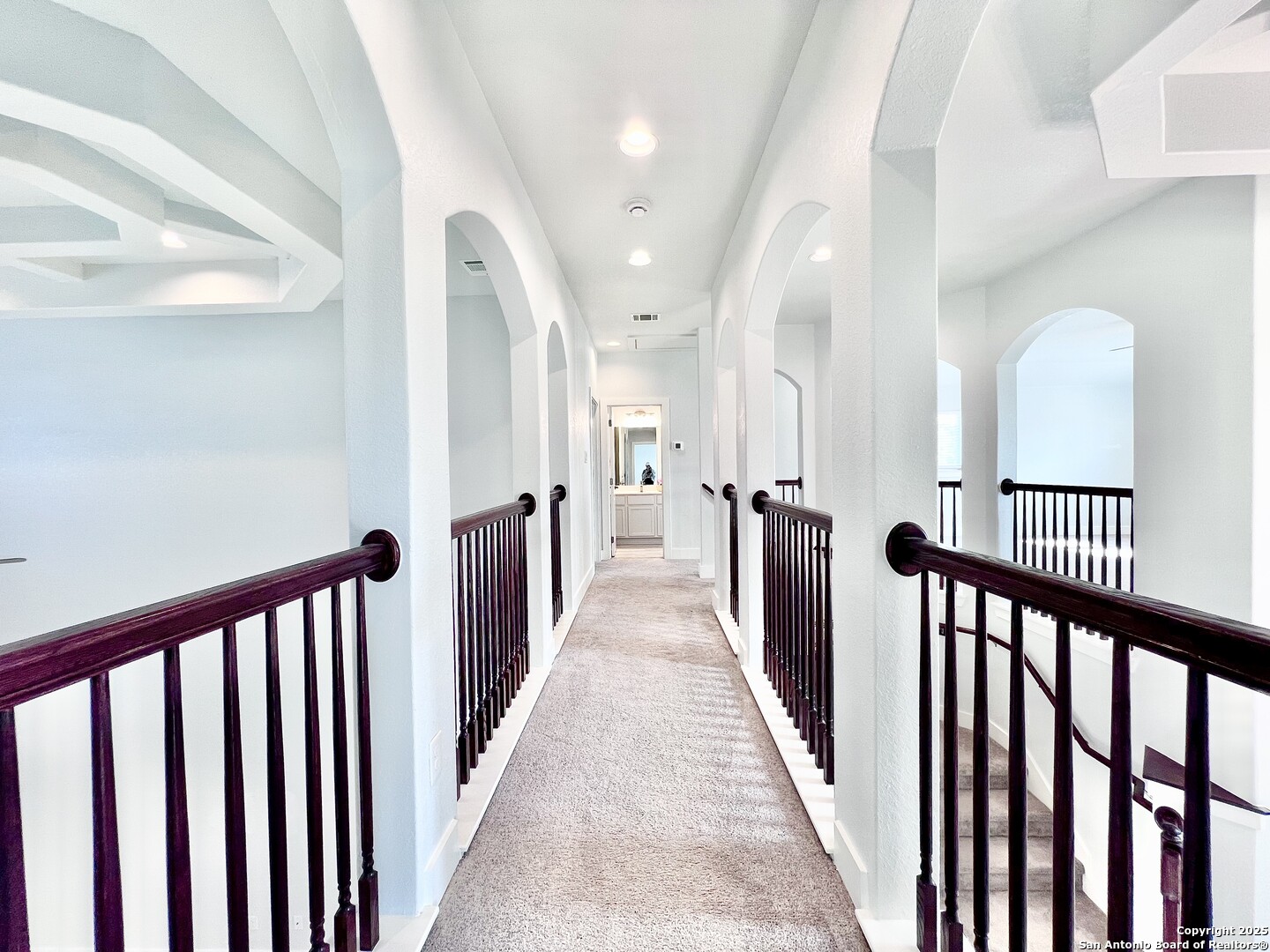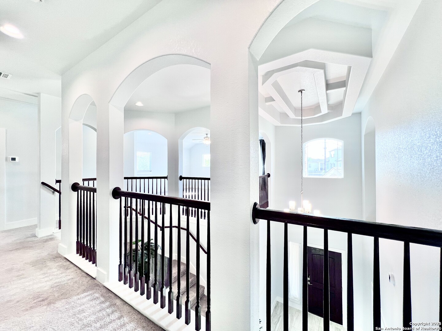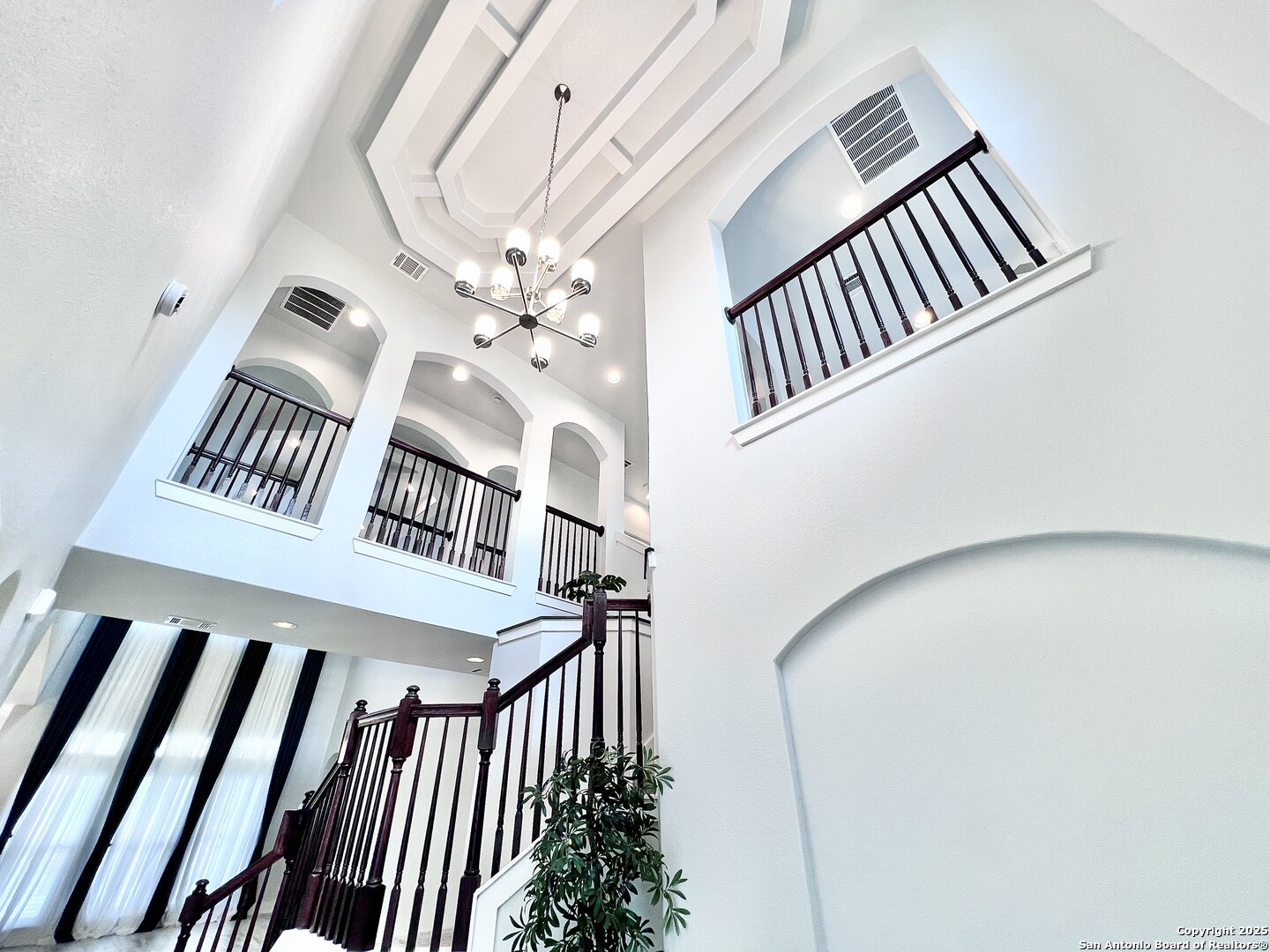 OPEN HOUSE SATURDAY 09/27 FROM 11AM - 2PM. Welcome to this exquisite 4-bedroom, 4-bathroom home with a 3-car garage, premium upgrades, and a thoughtful layout in the desirable Comanche Ridge community. Offering over 3,103 sq. ft. on one of the largest lots in the neighborhood (.246 acre), this property provides privacy, space, and comfort. Step inside to soaring ceilings, abundant natural light, and elegant architectural details including decorative niches, arches, and alcoves throughout. The open floor plan showcases a breathtaking staircase, versatile loft, and multiple living areas, perfect for both entertaining and everyday living. The chef's kitchen is a true centerpiece with granite countertops, stainless steel appliances, electric cooking, custom island, upgraded backsplash, and pendant lighting. The downstairs primary suite features bay windows, dual vanities, and a walk-in shower with detailed tilework. A secondary downstairs bedroom with direct access to a full bath works perfectly as a private guest suite or home office. Upstairs offers two additional bedrooms, two full baths, and a spacious game room. Additional highlights include dual primary bedrooms, a covered front porch, extended back patio, marble-look tile flooring, folding station in the laundry room, custom window curtains, owned water softener, tankless water heater, and irrigation system. Conveniently located near Loop 1604 and I-35 with quick access to Randolph AFB, Fort Sam Houston, shopping, dining, and more. Schedule your showing today-you will love it!