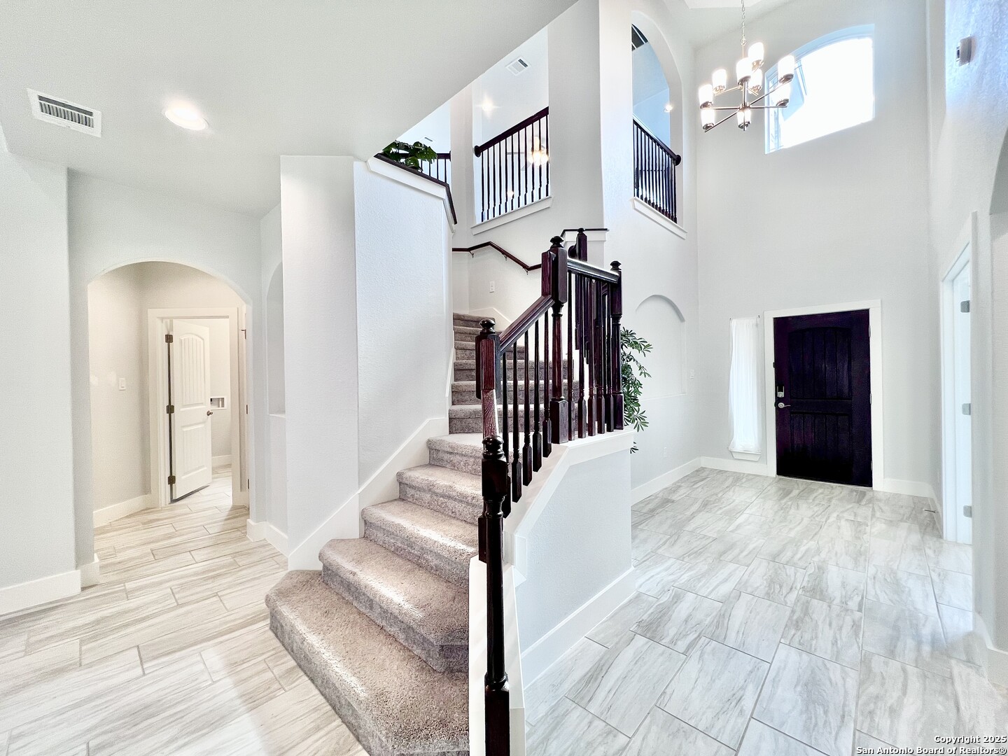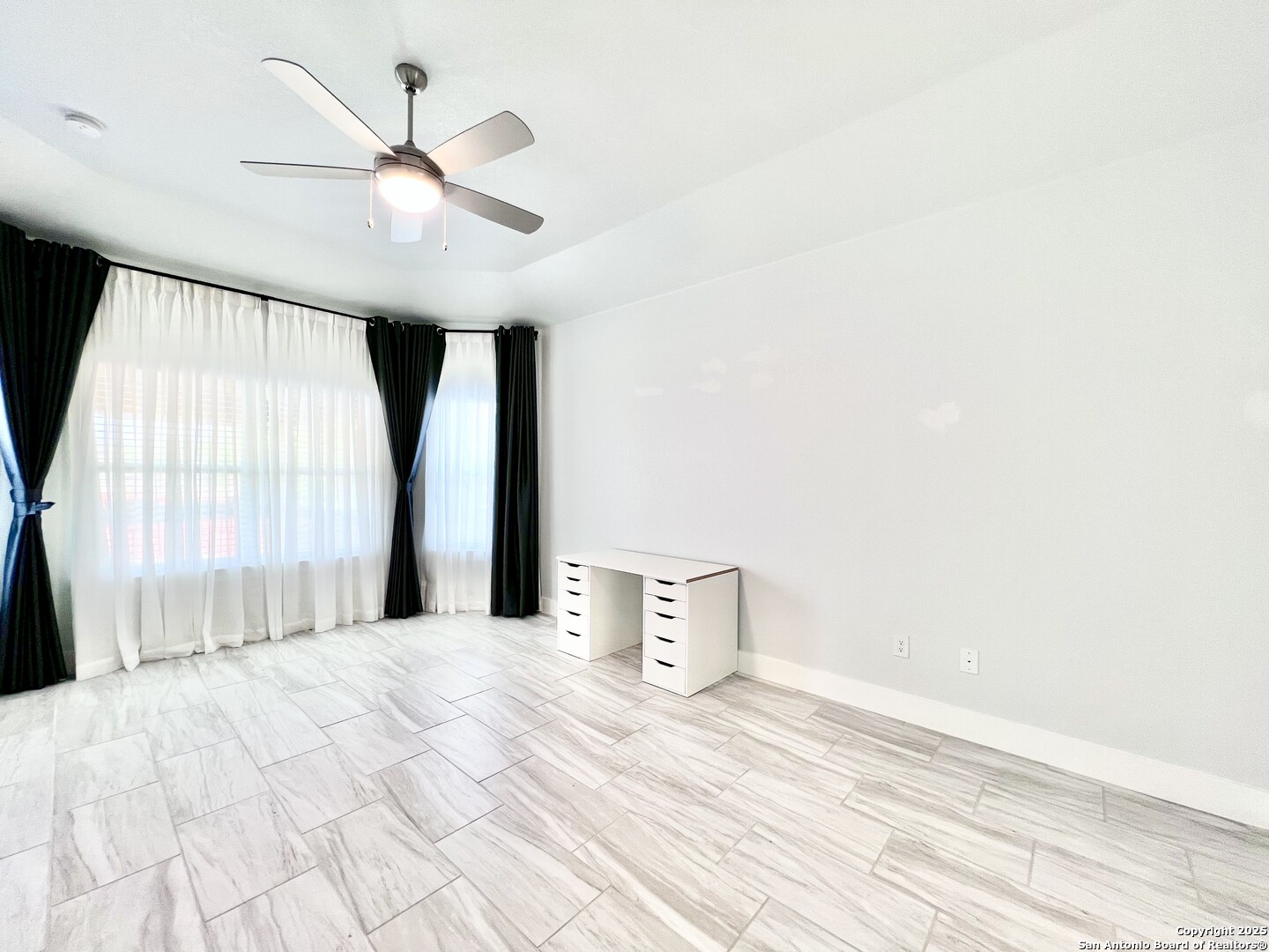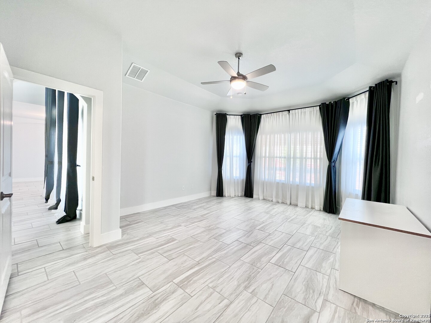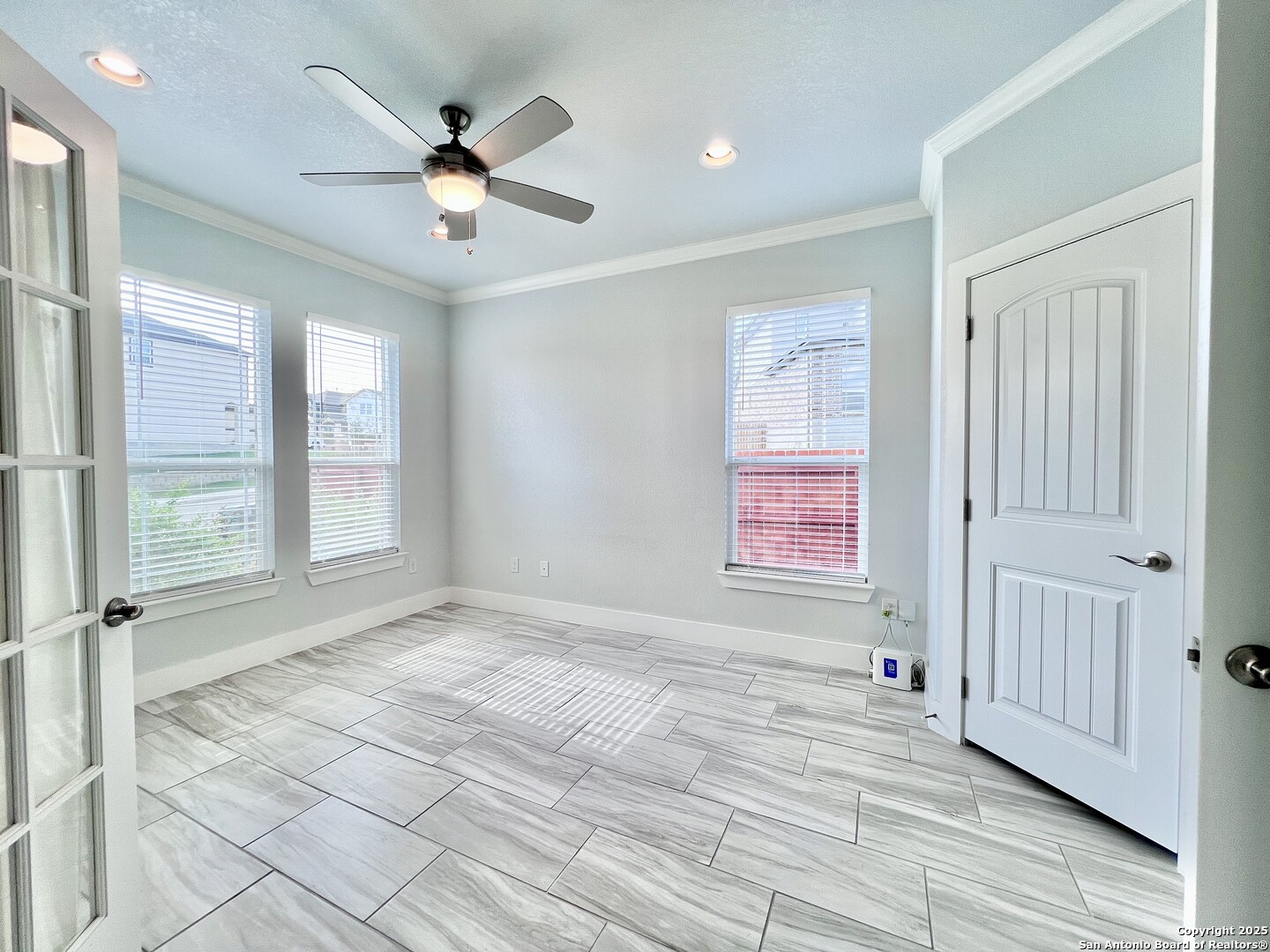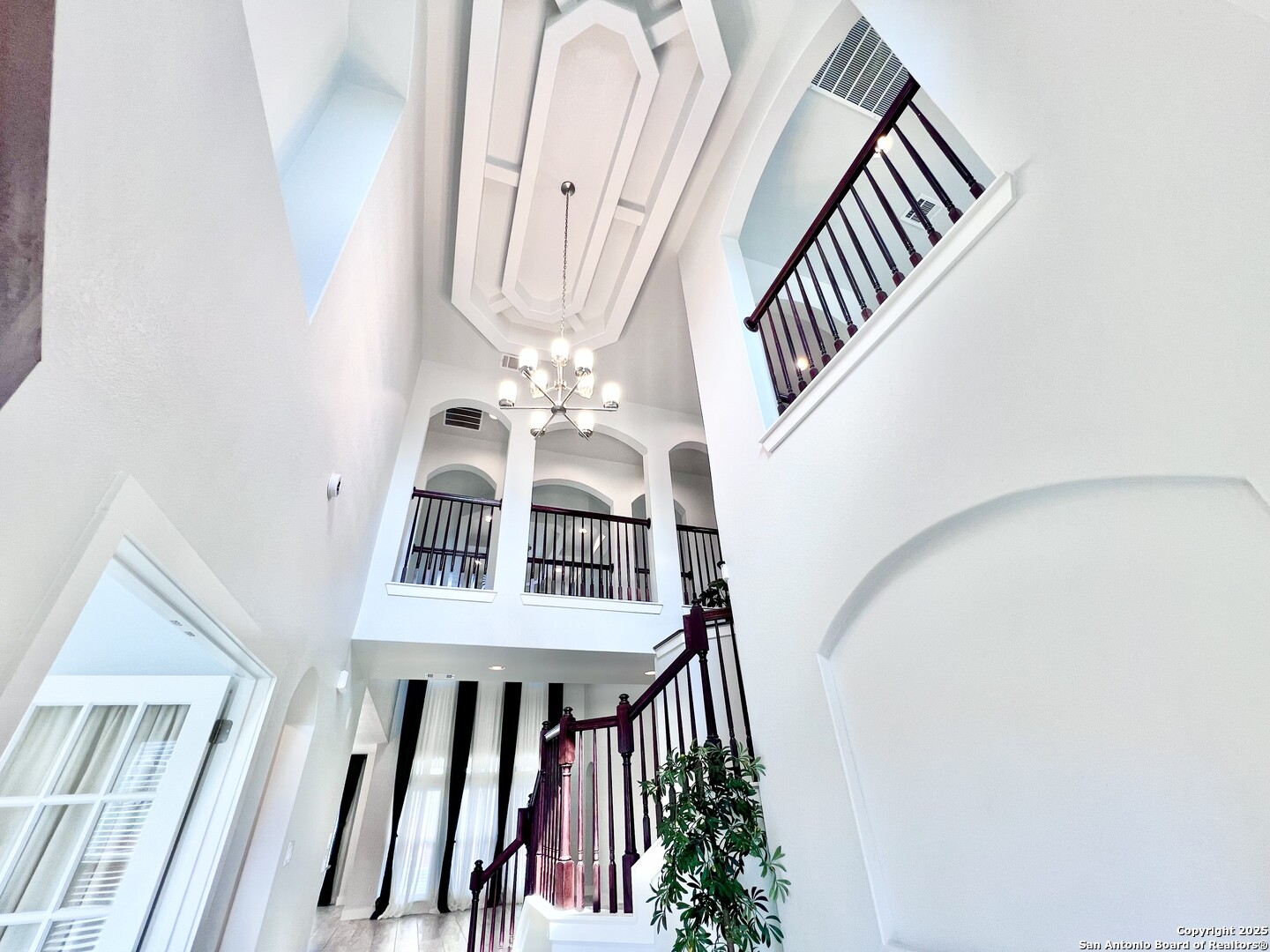 OPEN HOUSE SATURDAY 09/27 FROM 11AM - 2PM. Welcome to this exquisite 4-bedroom, 4-bathroom home with a 3-car garage, premium upgrades, and a thoughtful layout in the desirable Comanche Ridge community. Offering over 3,103 sq. ft. on one of the largest lots in the neighborhood (.246 acre), this property provides privacy, space, and comfort. Step inside to soaring ceilings, abundant natural light, and elegant architectural details including decorative niches, arches, and alcoves throughout. The open floor plan showcases a breathtaking staircase, versatile loft, and multiple living areas, perfect for both entertaining and everyday living. The chef's kitchen is a true centerpiece with granite countertops, stainless steel appliances, electric cooking, custom island, upgraded backsplash, and pendant lighting. The downstairs primary suite features bay windows, dual vanities, and a walk-in shower with detailed tilework. A secondary downstairs bedroom with direct access to a full bath works perfectly as a private guest suite or home office. Upstairs offers two additional bedrooms, two full baths, and a spacious game room. Additional highlights include dual primary bedrooms, a covered front porch, extended back patio, marble-look tile flooring, folding station in the laundry room, custom window curtains, owned water softener, tankless water heater, and irrigation system. Conveniently located near Loop 1604 and I-35 with quick access to Randolph AFB, Fort Sam Houston, shopping, dining, and more. Schedule your showing today-you will love it!