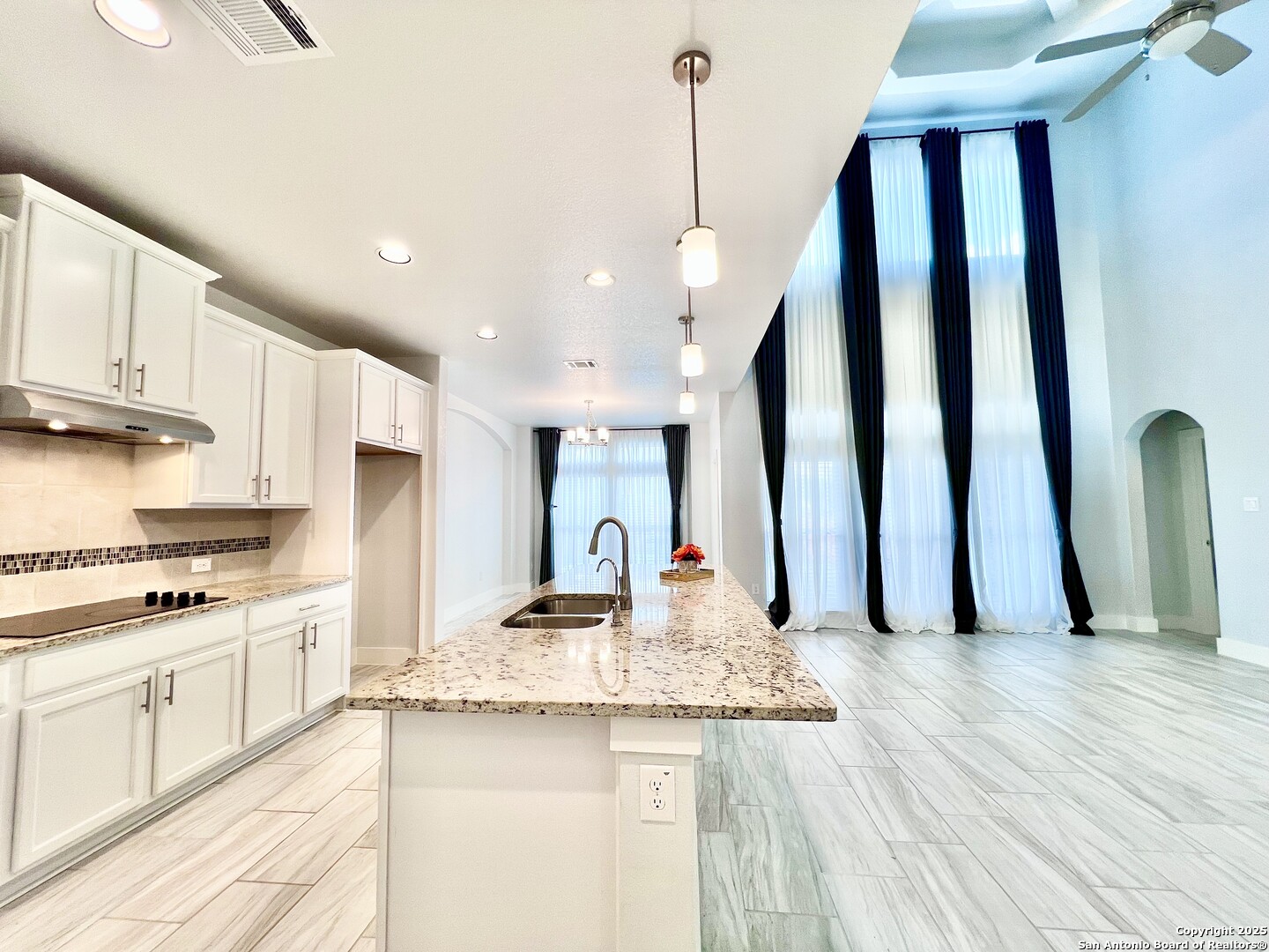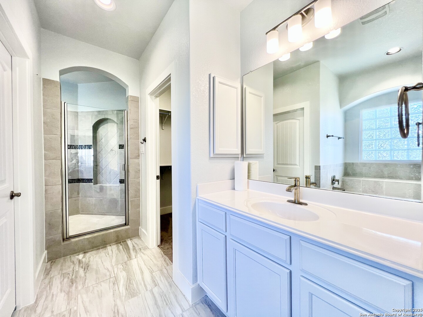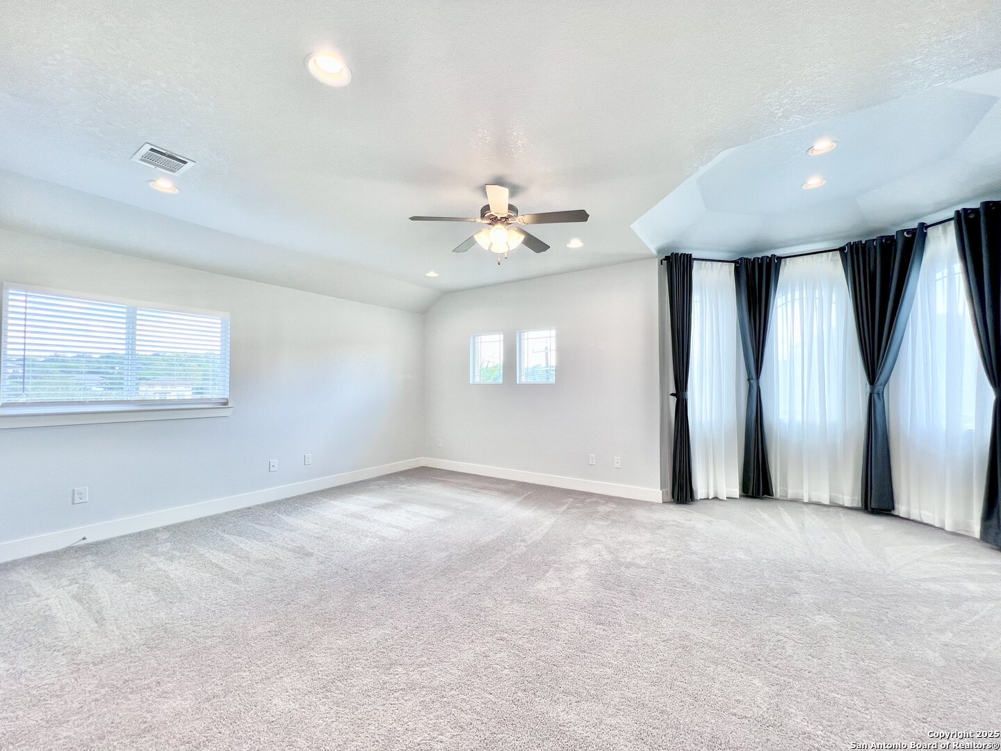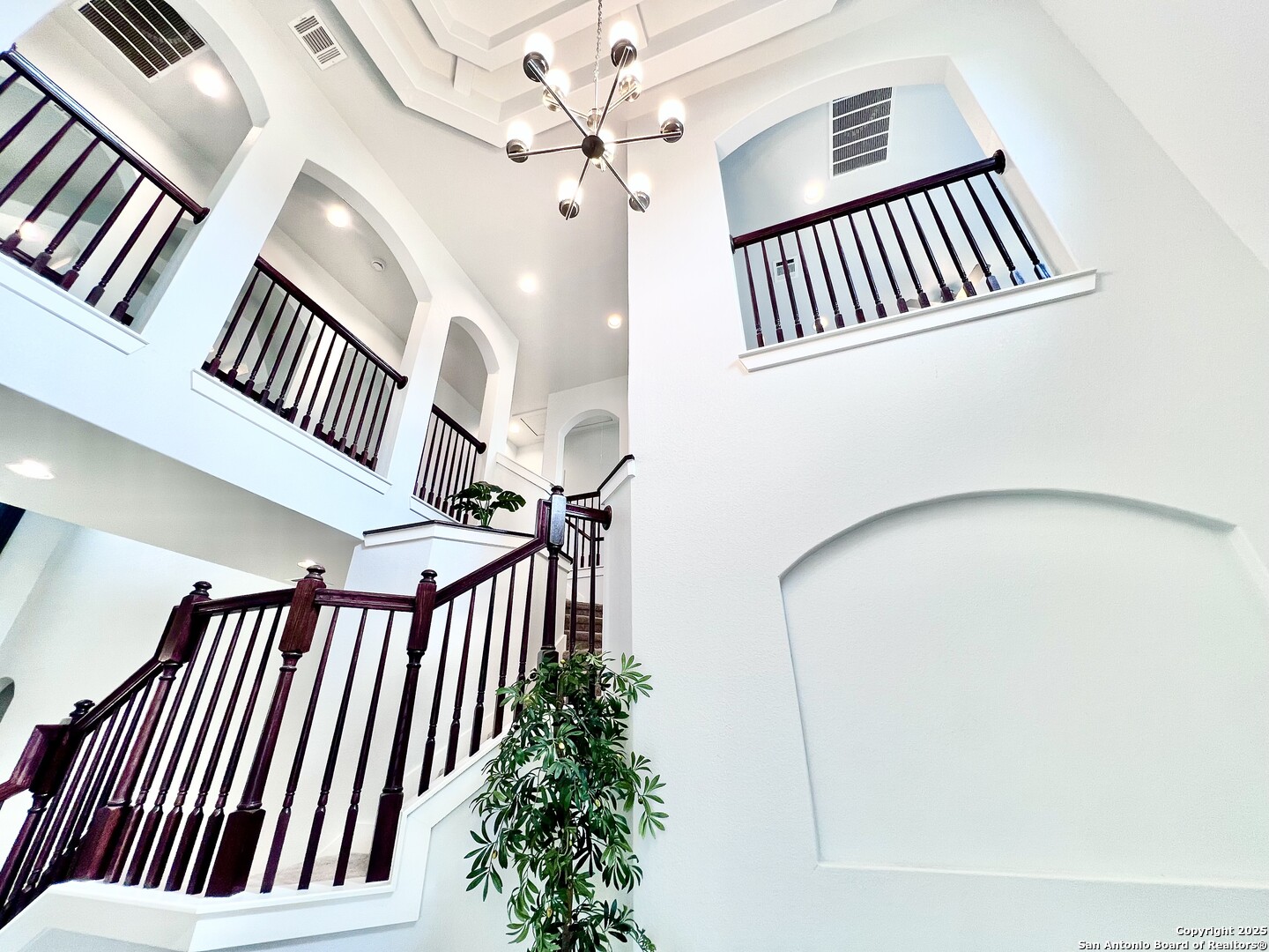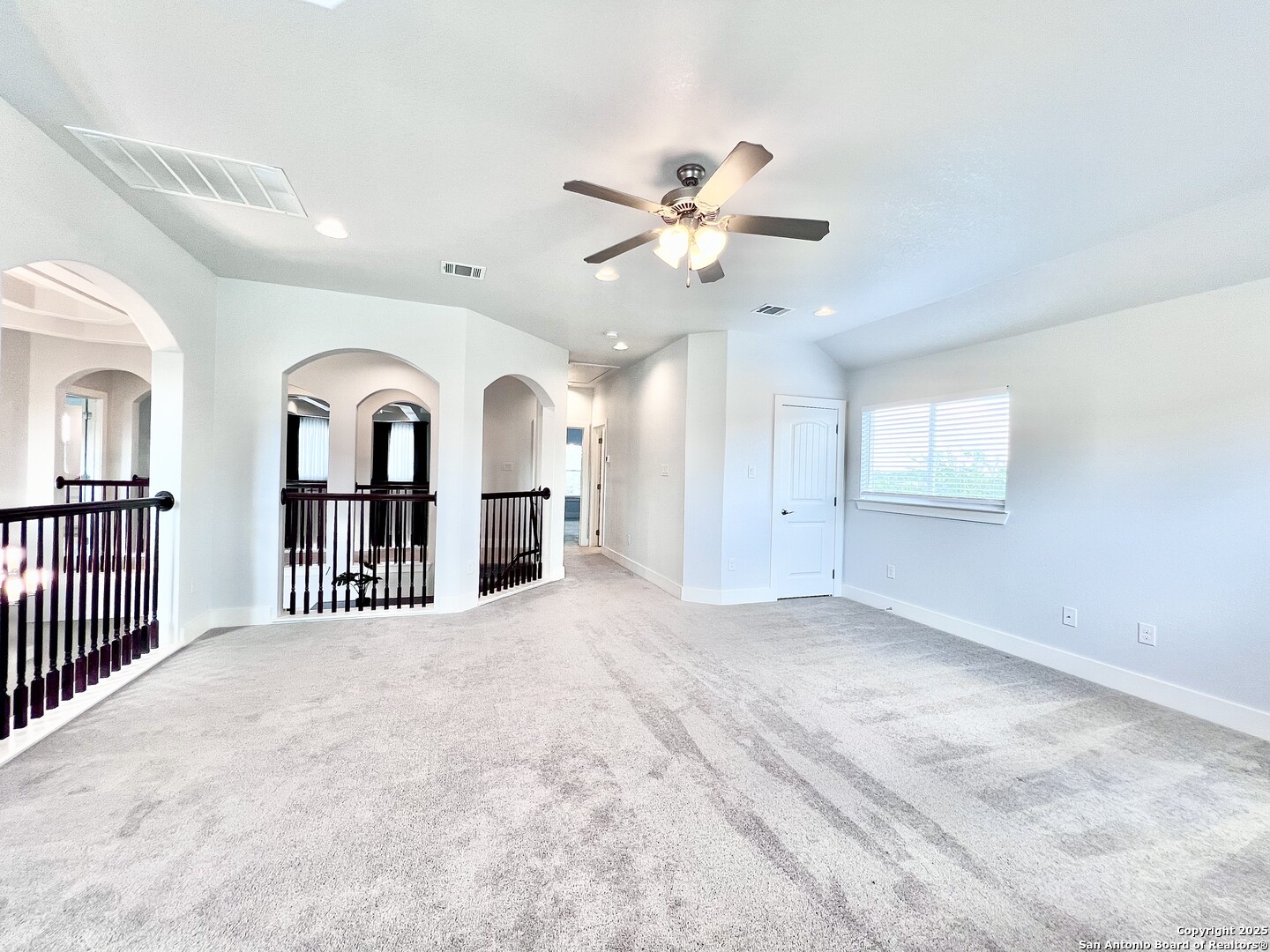 OPEN HOUSE SATURDAY 09/27 FROM 11AM - 2PM. Welcome to this exquisite 4-bedroom, 4-bathroom home with a 3-car garage, premium upgrades, and a thoughtful layout in the desirable Comanche Ridge community. Offering over 3,103 sq. ft. on one of the largest lots in the neighborhood (.246 acre), this property provides privacy, space, and comfort. Step inside to soaring ceilings, abundant natural light, and elegant architectural details including decorative niches, arches, and alcoves throughout. The open floor plan showcases a breathtaking staircase, versatile loft, and multiple living areas, perfect for both entertaining and everyday living. The chef's kitchen is a true centerpiece with granite countertops, stainless steel appliances, electric cooking, custom island, upgraded backsplash, and pendant lighting. The downstairs primary suite features bay windows, dual vanities, and a walk-in shower with detailed tilework. A secondary downstairs bedroom with direct access to a full bath works perfectly as a private guest suite or home office. Upstairs offers two additional bedrooms, two full baths, and a spacious game room. Additional highlights include dual primary bedrooms, a covered front porch, extended back patio, marble-look tile flooring, folding station in the laundry room, custom window curtains, owned water softener, tankless water heater, and irrigation system. Conveniently located near Loop 1604 and I-35 with quick access to Randolph AFB, Fort Sam Houston, shopping, dining, and more. Schedule your showing today-you will love it!