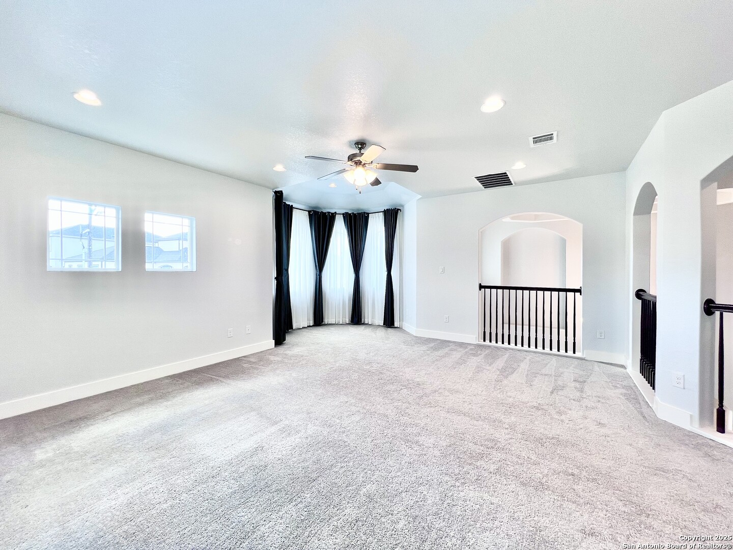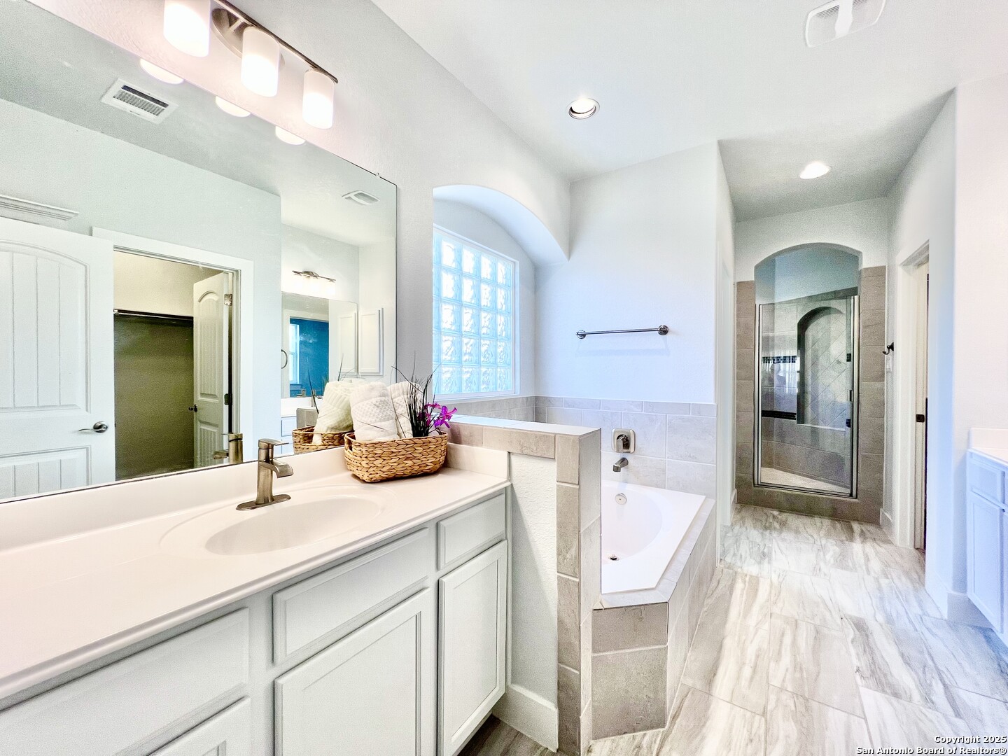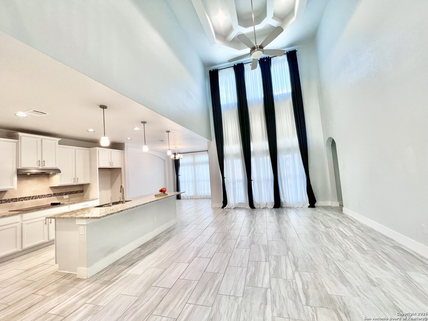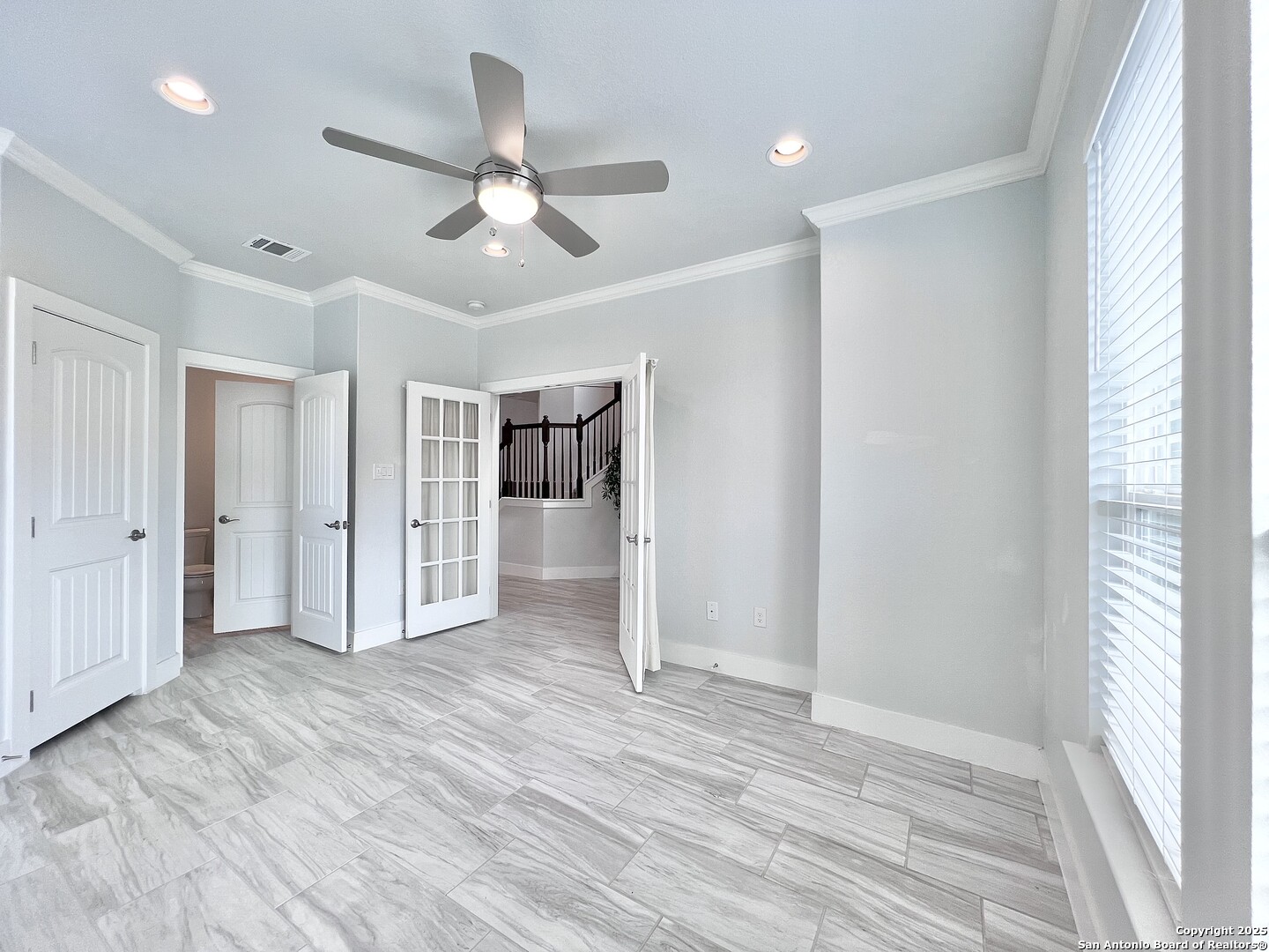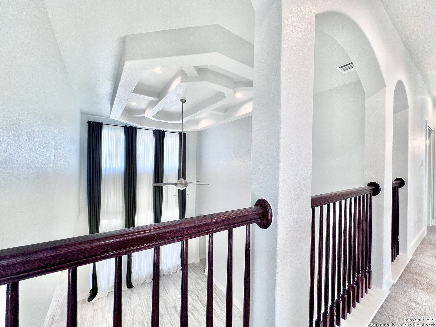 OPEN HOUSE SATURDAY 09/27 FROM 11AM - 2PM. Welcome to this exquisite 4-bedroom, 4-bathroom home with a 3-car garage, premium upgrades, and a thoughtful layout in the desirable Comanche Ridge community. Offering over 3,103 sq. ft. on one of the largest lots in the neighborhood (.246 acre), this property provides privacy, space, and comfort. Step inside to soaring ceilings, abundant natural light, and elegant architectural details including decorative niches, arches, and alcoves throughout. The open floor plan showcases a breathtaking staircase, versatile loft, and multiple living areas, perfect for both entertaining and everyday living. The chef's kitchen is a true centerpiece with granite countertops, stainless steel appliances, electric cooking, custom island, upgraded backsplash, and pendant lighting. The downstairs primary suite features bay windows, dual vanities, and a walk-in shower with detailed tilework. A secondary downstairs bedroom with direct access to a full bath works perfectly as a private guest suite or home office. Upstairs offers two additional bedrooms, two full baths, and a spacious game room. Additional highlights include dual primary bedrooms, a covered front porch, extended back patio, marble-look tile flooring, folding station in the laundry room, custom window curtains, owned water softener, tankless water heater, and irrigation system. Conveniently located near Loop 1604 and I-35 with quick access to Randolph AFB, Fort Sam Houston, shopping, dining, and more. Schedule your showing today-you will love it!