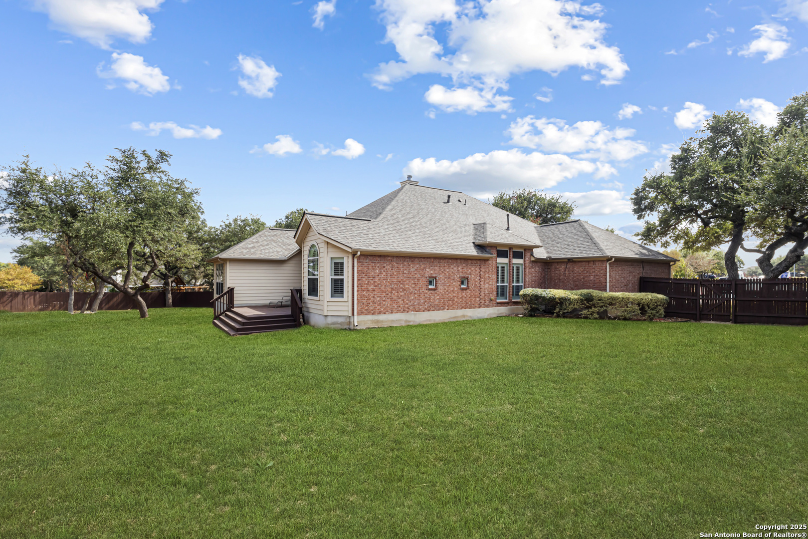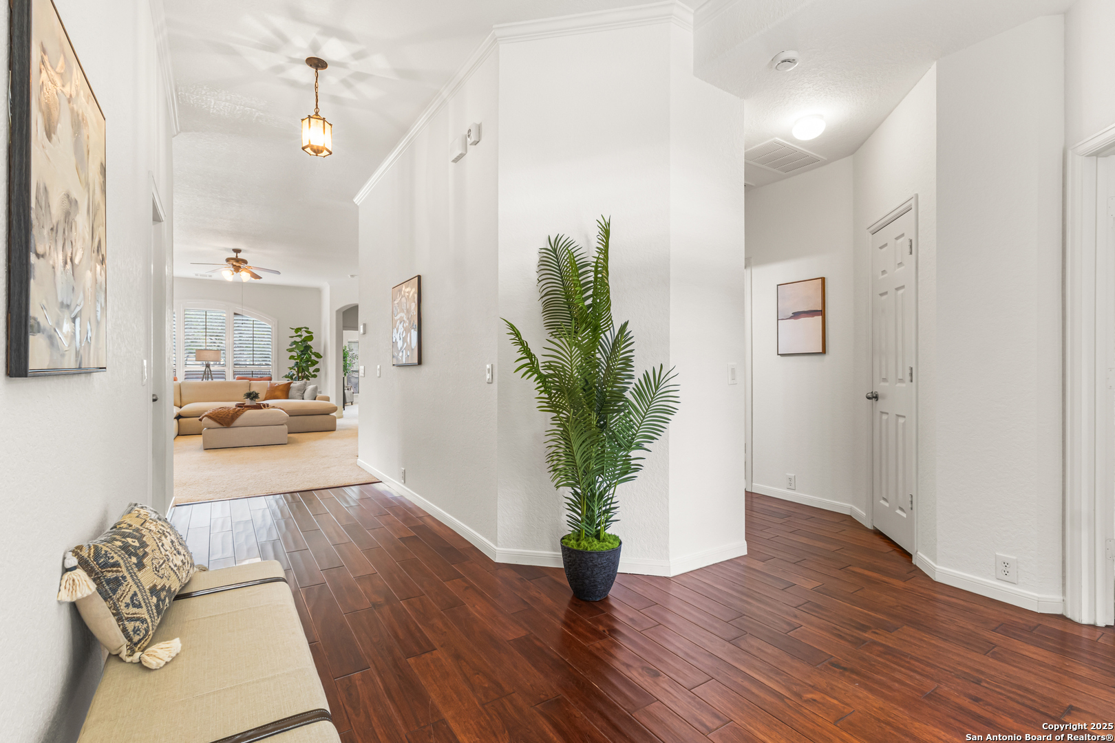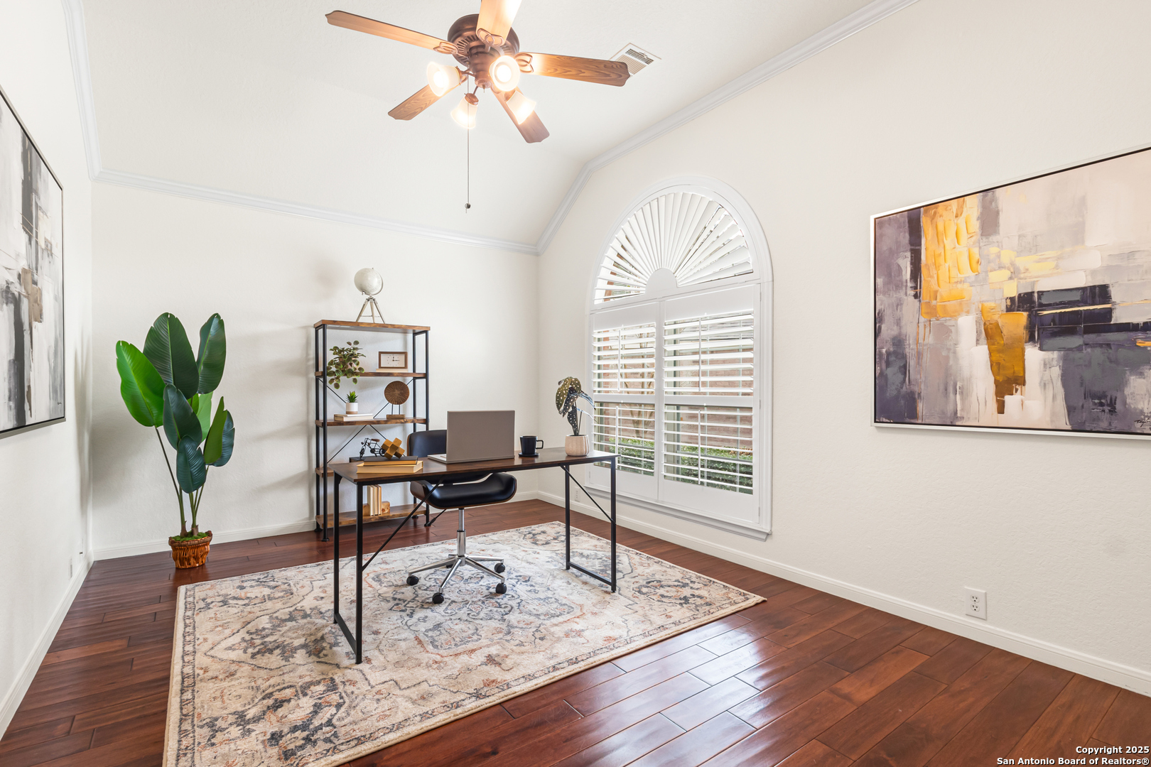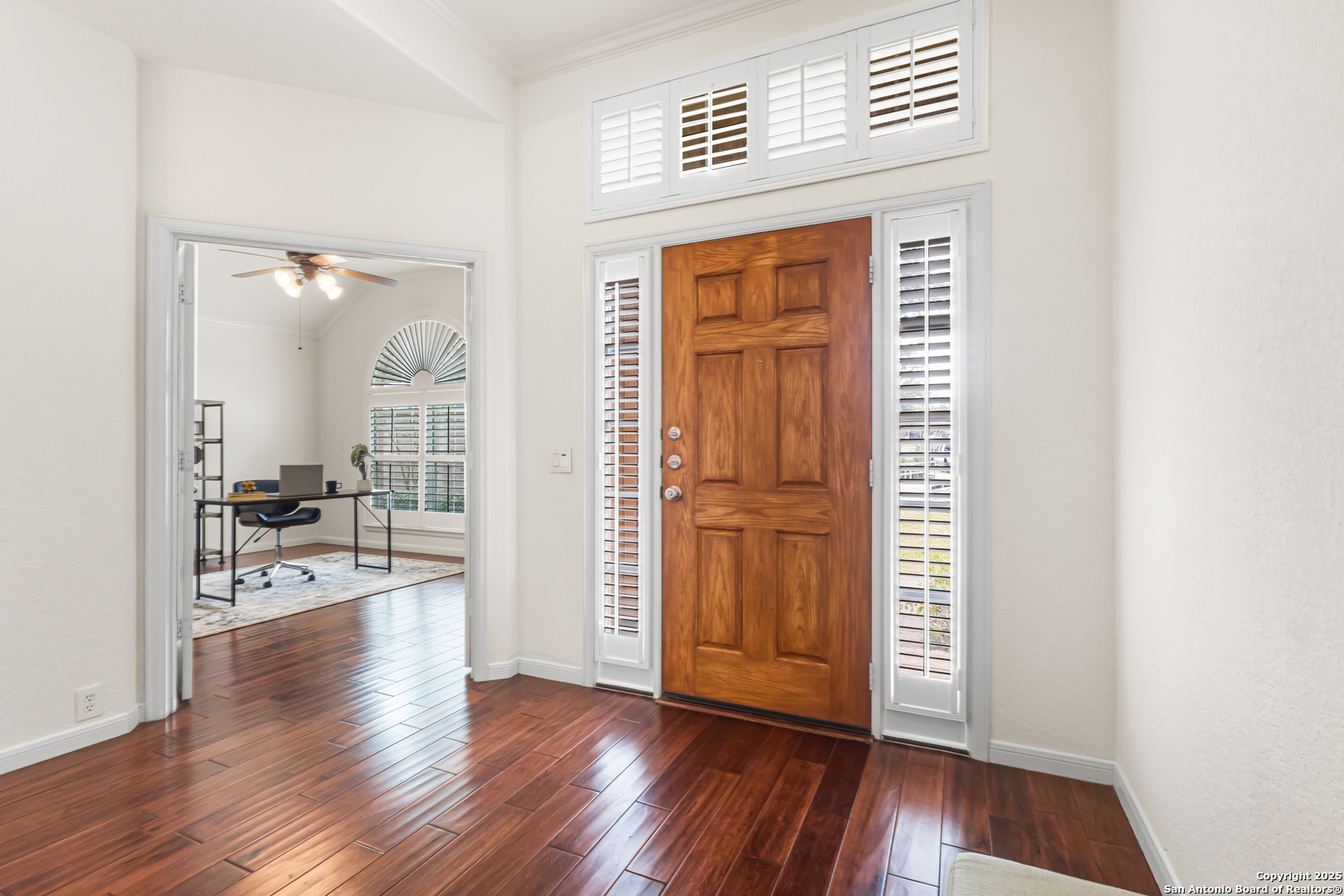 Meet the newest house in the exclusive gated community of The Crossing at Lookout Canyon. This home sits on .38 acres of land tucked away in a cul-de-sac making it the largest property in the neighborhood. Upon entry you are greeted by Patagonia hardwood floors which leads into a spacious open floor plan living area that opens to a formal dining area making it the perfect space to entertain. The kitchen overlooks the living space and features quartz countertops, tile backsplash, a built-in wine rack, and custom cabinetry with under mount lighting. A well-designed layout separates the master bedroom from the office and secondary bedrooms for ultimate privacy, while the details from the crown molding to plantation shutters in all major living areas makes this house stand out amongst the rest. The expansive backyard is the perfect space to add a pool and a sports court, and storage won't be a problem with your oversized three car garage. This property combines quiet, suburban living with close convenience to San Antonio amenities. Whether you're hosting guests or enjoying a quiet evening on the patio, you'll have the space and comfort you've been seeking. This is your chance to own a move-in ready home that delivers size, serenity and strong value in one of San Antonio's most desirable areas. Book your showing today!