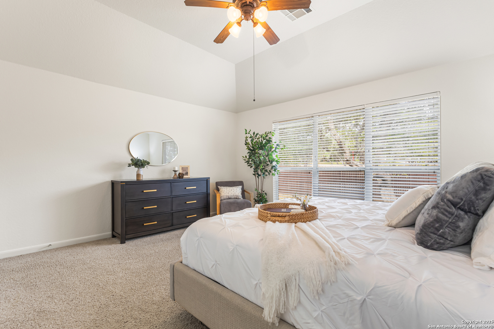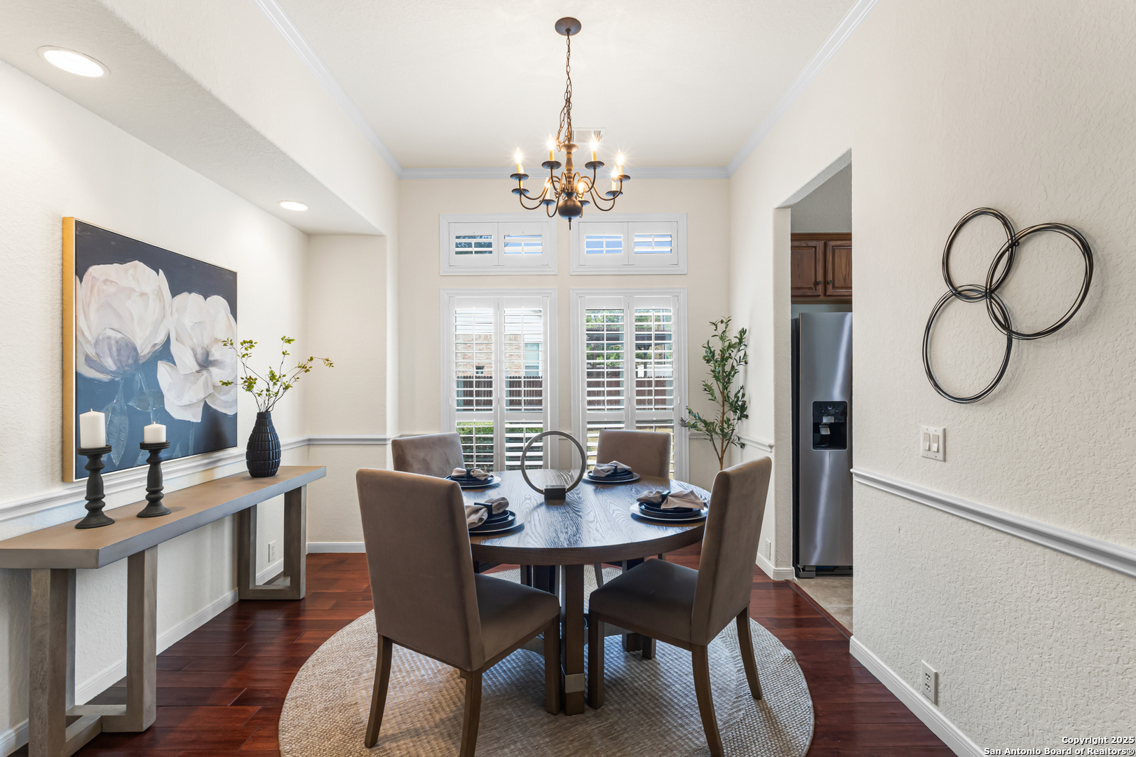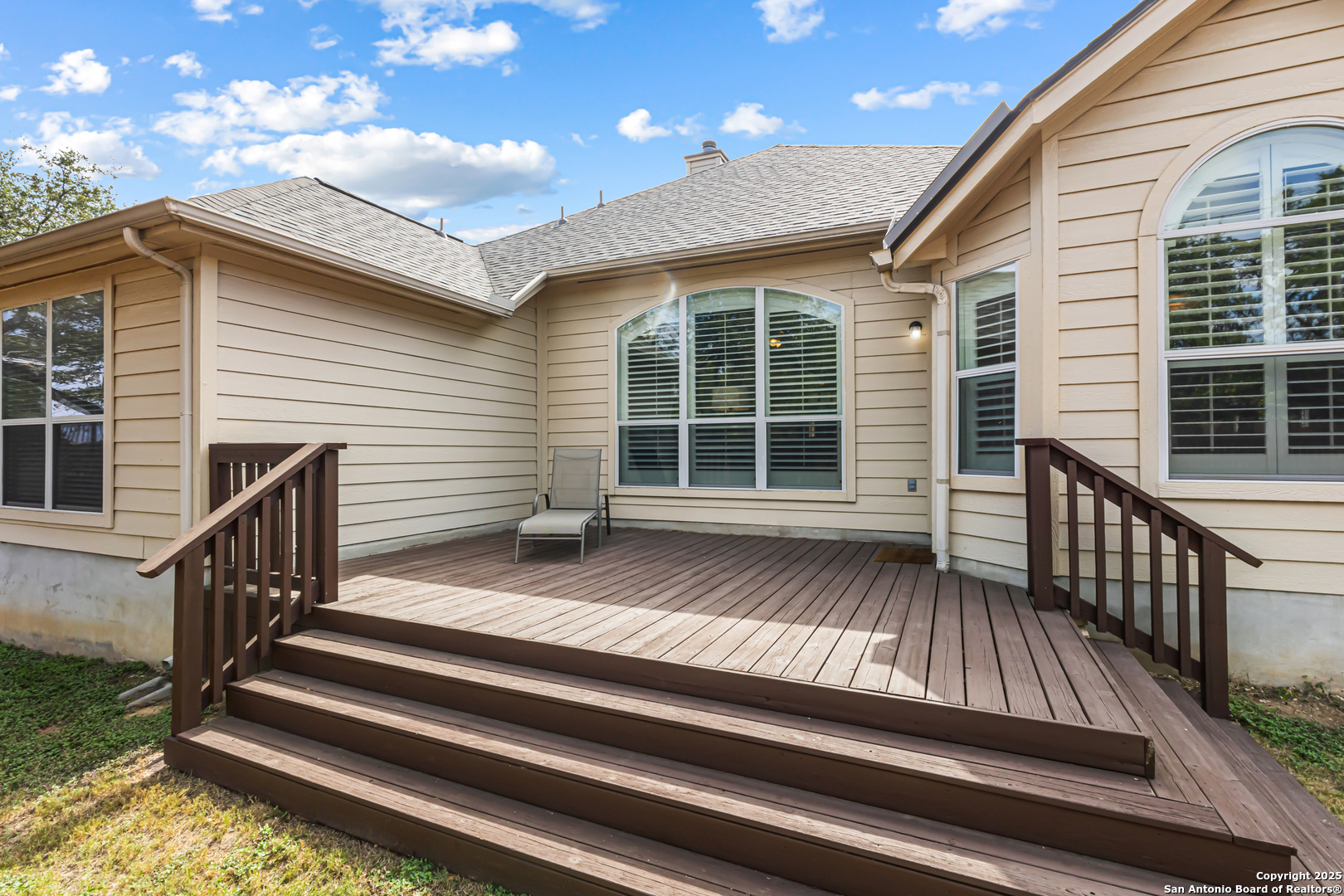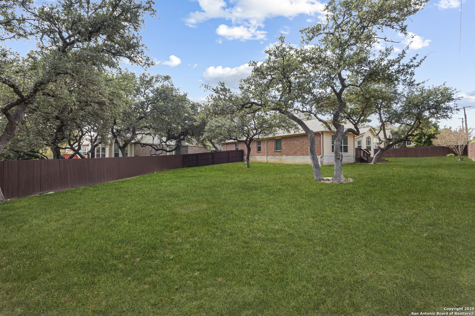 Meet the newest house in the exclusive gated community of The Crossing at Lookout Canyon. This home sits on .38 acres of land tucked away in a cul-de-sac making it the largest property in the neighborhood. Upon entry you are greeted by Patagonia hardwood floors which leads into a spacious open floor plan living area that opens to a formal dining area making it the perfect space to entertain. The kitchen overlooks the living space and features quartz countertops, tile backsplash, a built-in wine rack, and custom cabinetry with under mount lighting. A well-designed layout separates the master bedroom from the office and secondary bedrooms for ultimate privacy, while the details from the crown molding to plantation shutters in all major living areas makes this house stand out amongst the rest. The expansive backyard is the perfect space to add a pool and a sports court, and storage won't be a problem with your oversized three car garage. This property combines quiet, suburban living with close convenience to San Antonio amenities. Whether you're hosting guests or enjoying a quiet evening on the patio, you'll have the space and comfort you've been seeking. This is your chance to own a move-in ready home that delivers size, serenity and strong value in one of San Antonio's most desirable areas. Book your showing today!