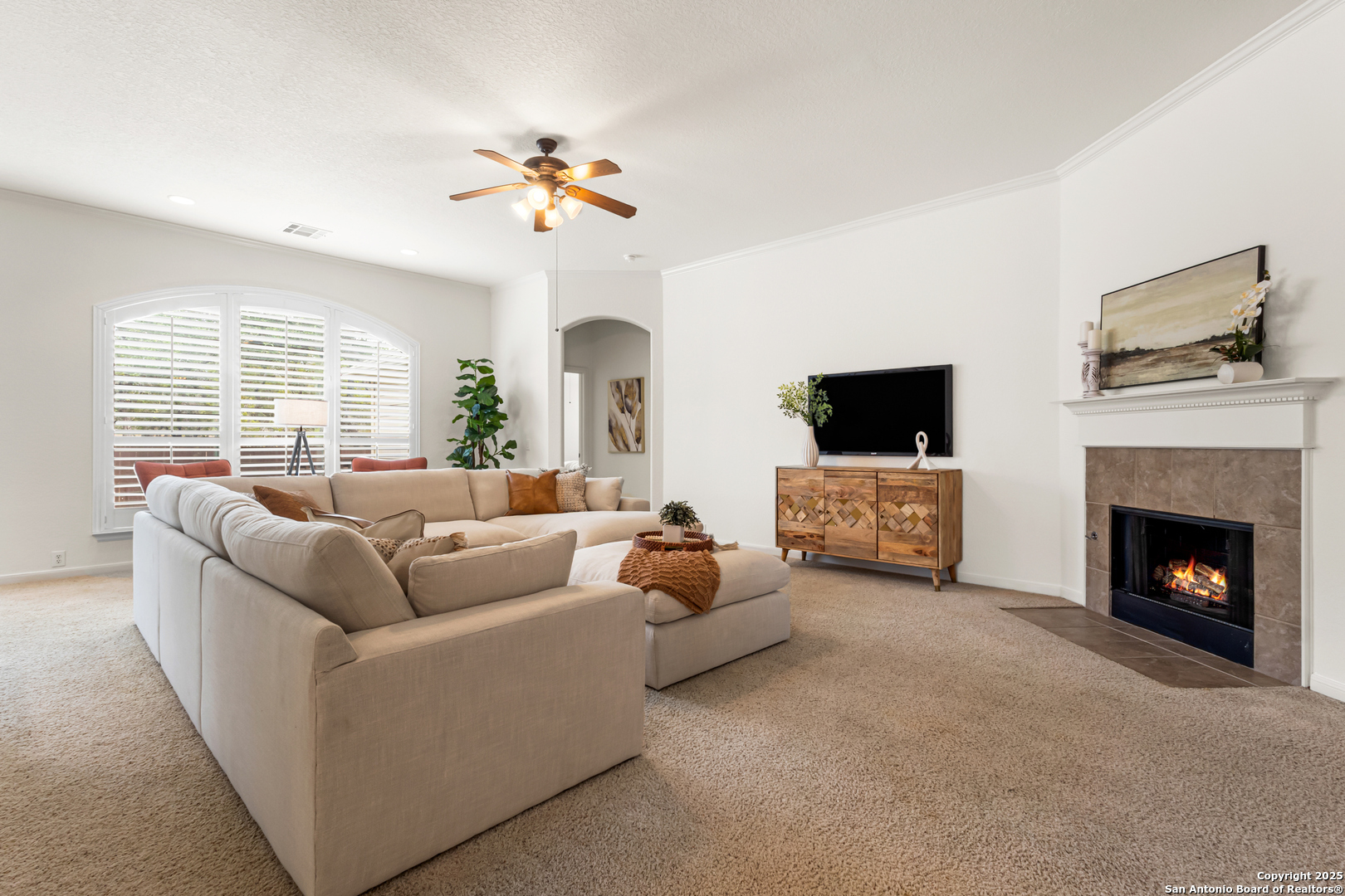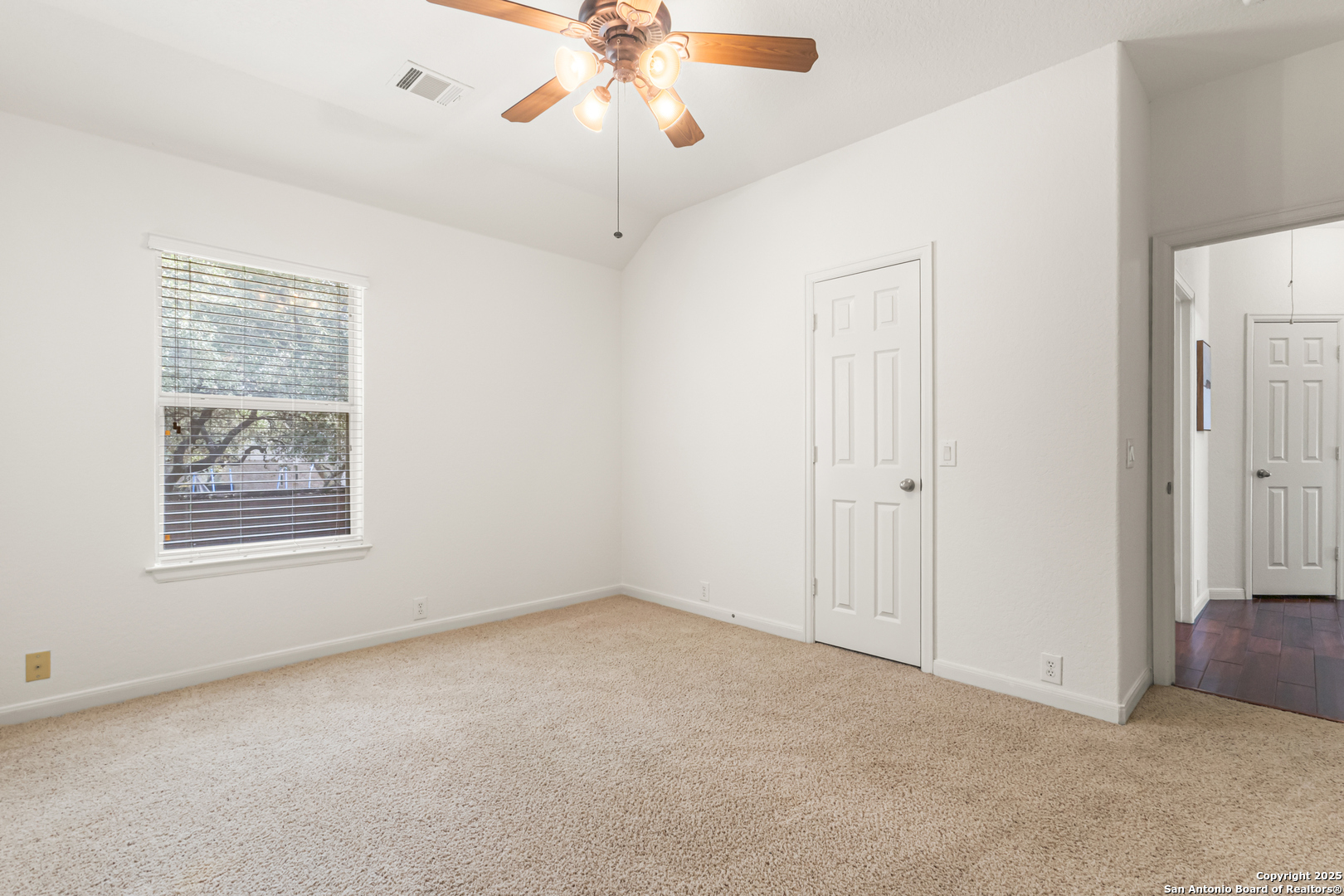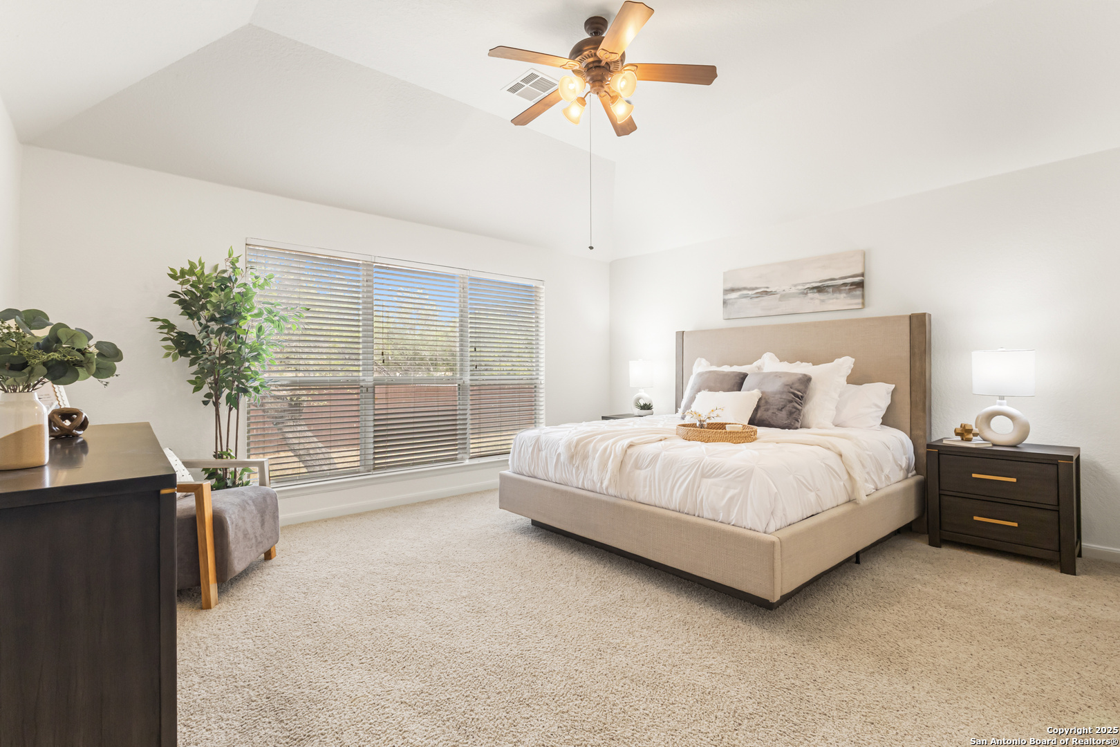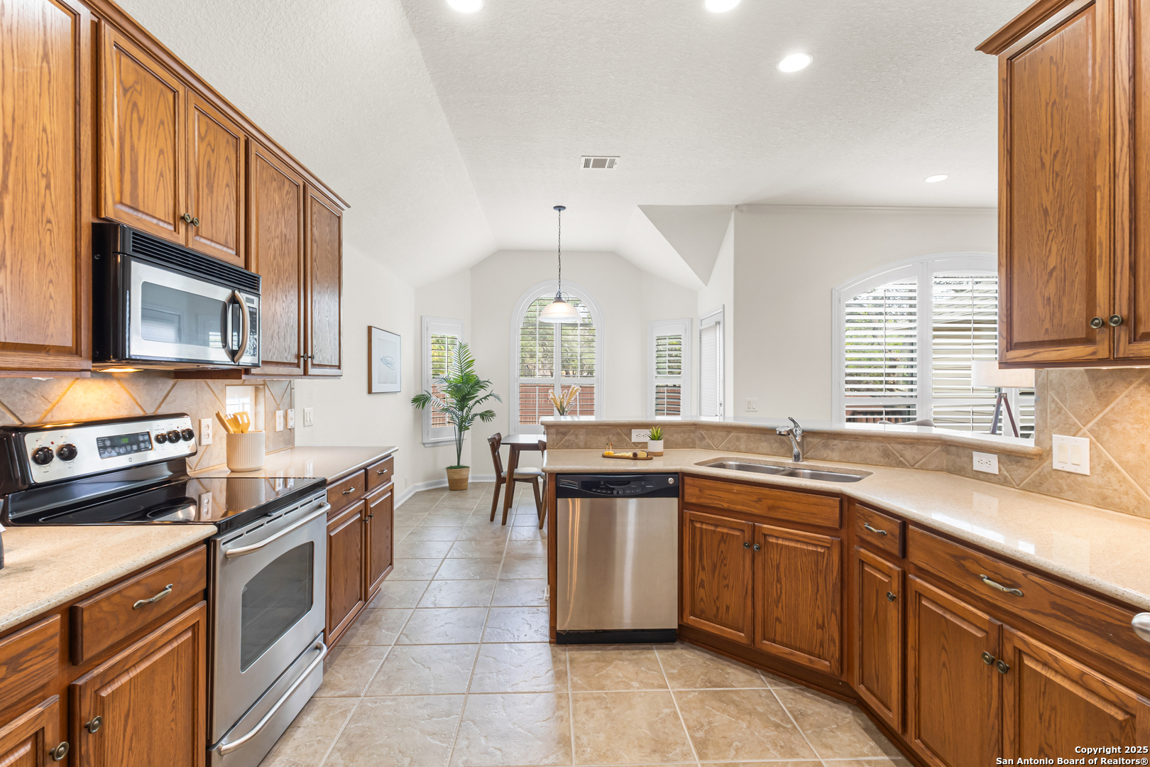 Meet the newest house in the exclusive gated community of The Crossing at Lookout Canyon. This home sits on .38 acres of land tucked away in a cul-de-sac making it the largest property in the neighborhood. Upon entry you are greeted by Patagonia hardwood floors which leads into a spacious open floor plan living area that opens to a formal dining area making it the perfect space to entertain. The kitchen overlooks the living space and features quartz countertops, tile backsplash, a built-in wine rack, and custom cabinetry with under mount lighting. A well-designed layout separates the master bedroom from the office and secondary bedrooms for ultimate privacy, while the details from the crown molding to plantation shutters in all major living areas makes this house stand out amongst the rest. The expansive backyard is the perfect space to add a pool and a sports court, and storage won't be a problem with your oversized three car garage. This property combines quiet, suburban living with close convenience to San Antonio amenities. Whether you're hosting guests or enjoying a quiet evening on the patio, you'll have the space and comfort you've been seeking. This is your chance to own a move-in ready home that delivers size, serenity and strong value in one of San Antonio's most desirable areas. Book your showing today!