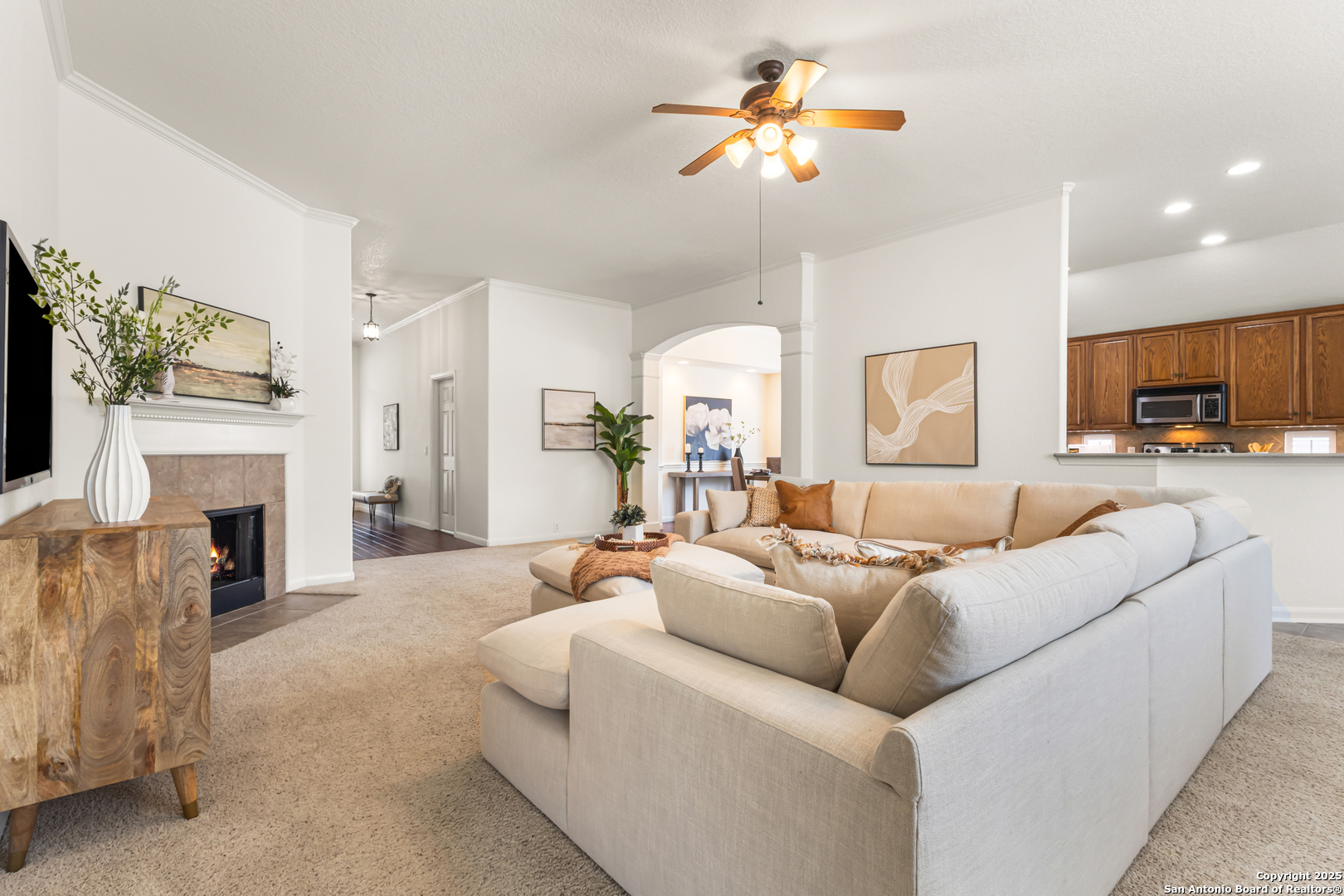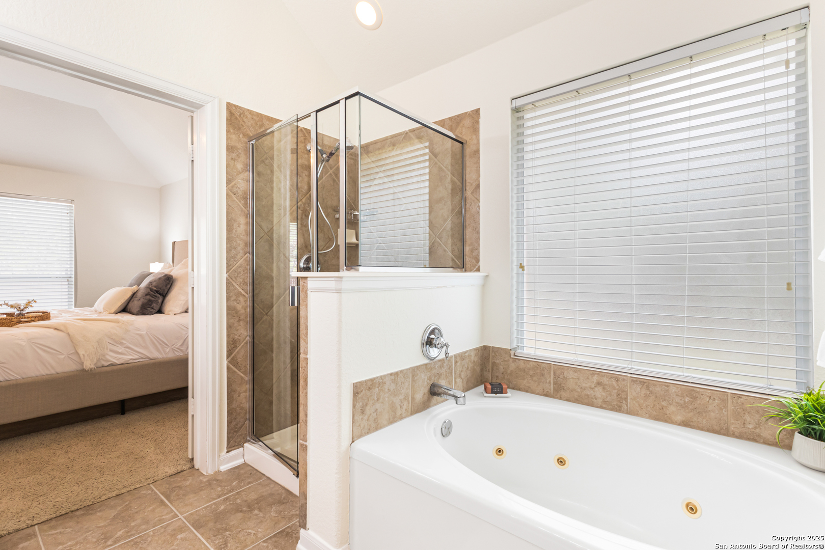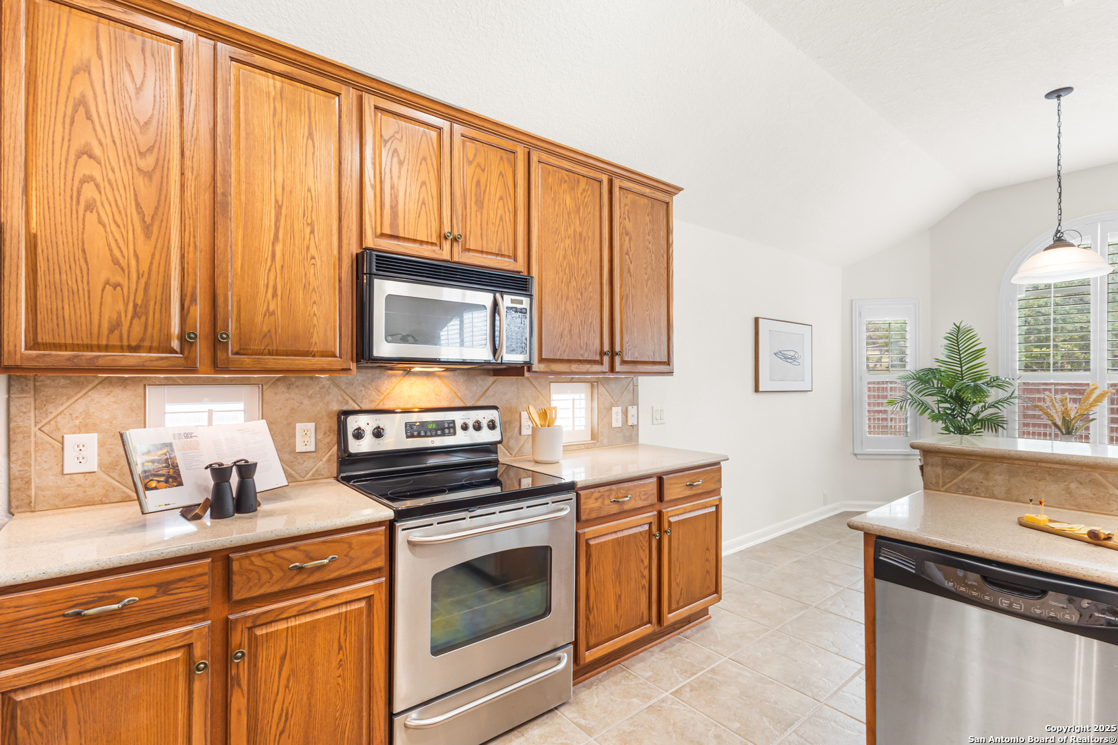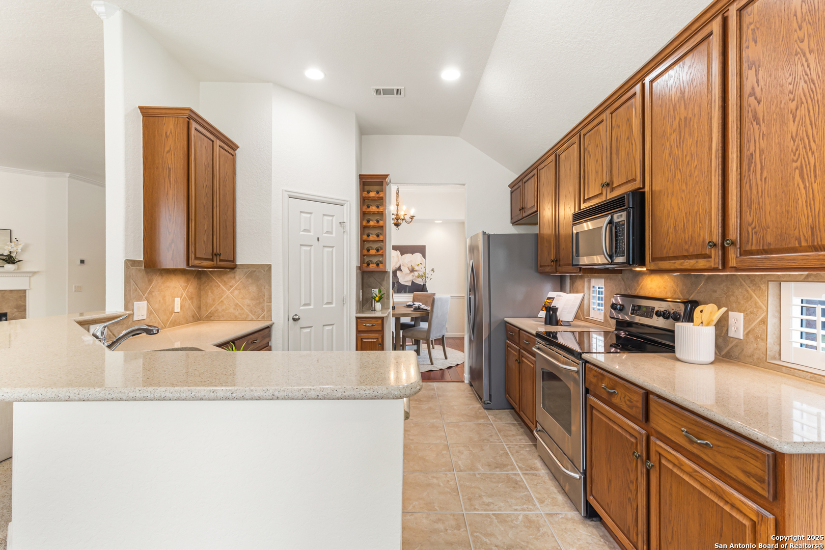 Meet the newest house in the exclusive gated community of The Crossing at Lookout Canyon. This home sits on .38 acres of land tucked away in a cul-de-sac making it the largest property in the neighborhood. Upon entry you are greeted by Patagonia hardwood floors which leads into a spacious open floor plan living area that opens to a formal dining area making it the perfect space to entertain. The kitchen overlooks the living space and features quartz countertops, tile backsplash, a built-in wine rack, and custom cabinetry with under mount lighting. A well-designed layout separates the master bedroom from the office and secondary bedrooms for ultimate privacy, while the details from the crown molding to plantation shutters in all major living areas makes this house stand out amongst the rest. The expansive backyard is the perfect space to add a pool and a sports court, and storage won't be a problem with your oversized three car garage. This property combines quiet, suburban living with close convenience to San Antonio amenities. Whether you're hosting guests or enjoying a quiet evening on the patio, you'll have the space and comfort you've been seeking. This is your chance to own a move-in ready home that delivers size, serenity and strong value in one of San Antonio's most desirable areas. Book your showing today!