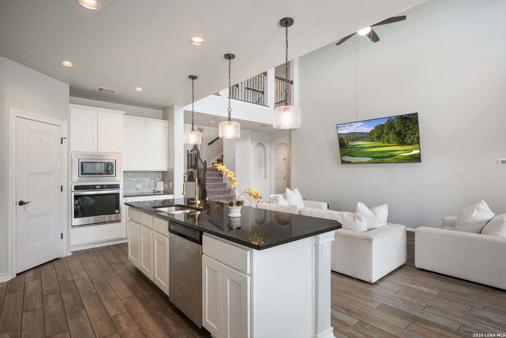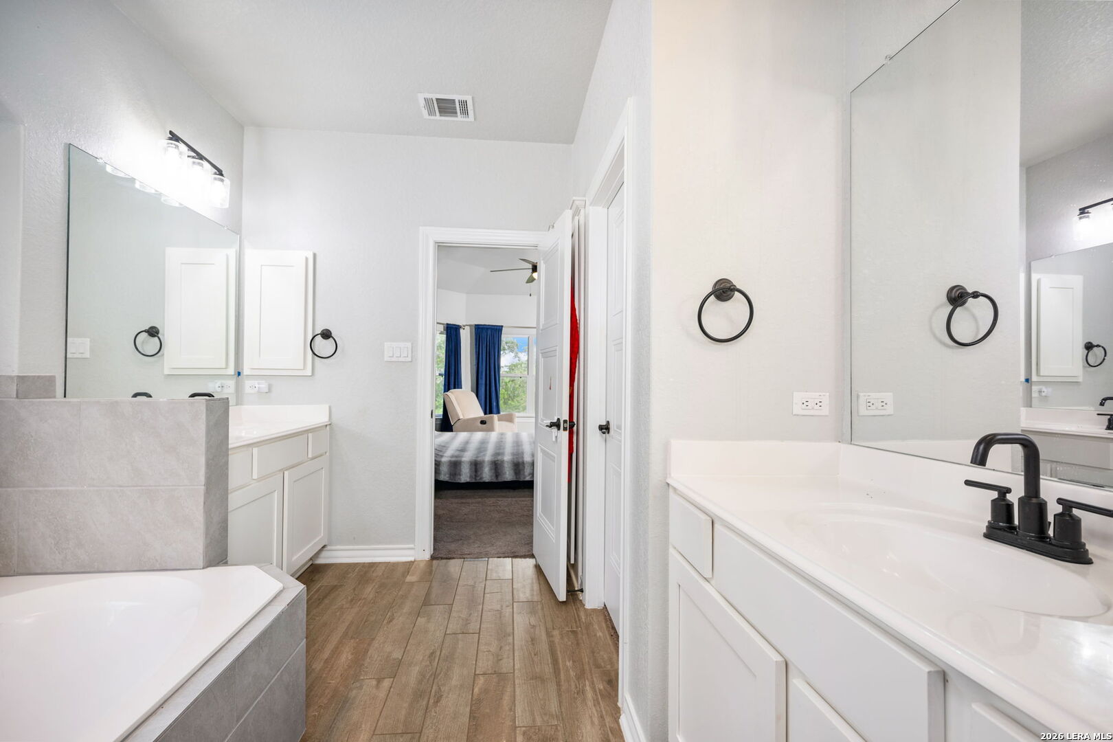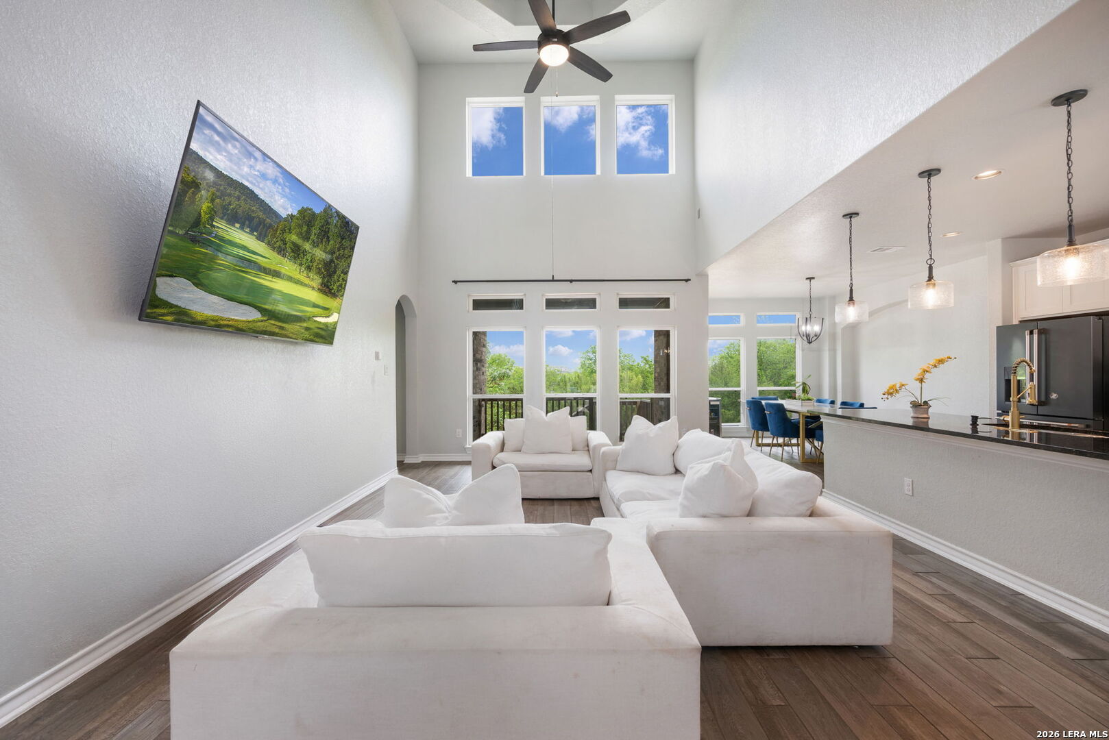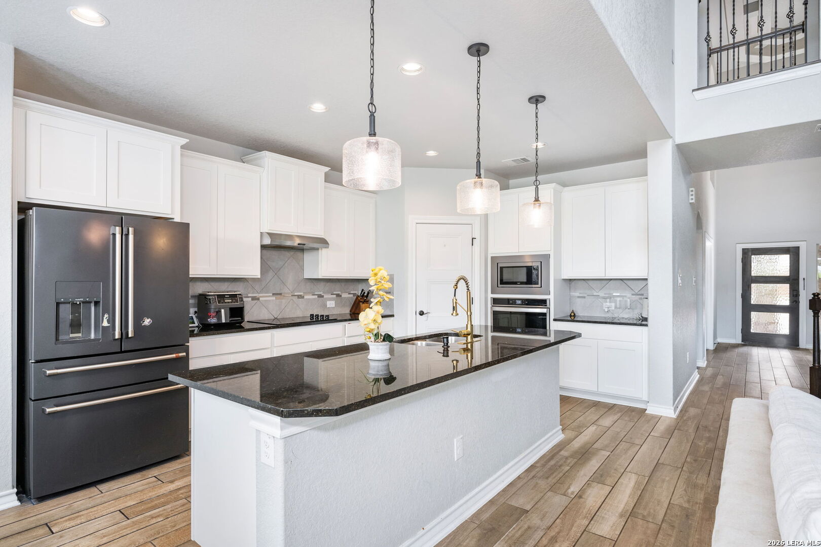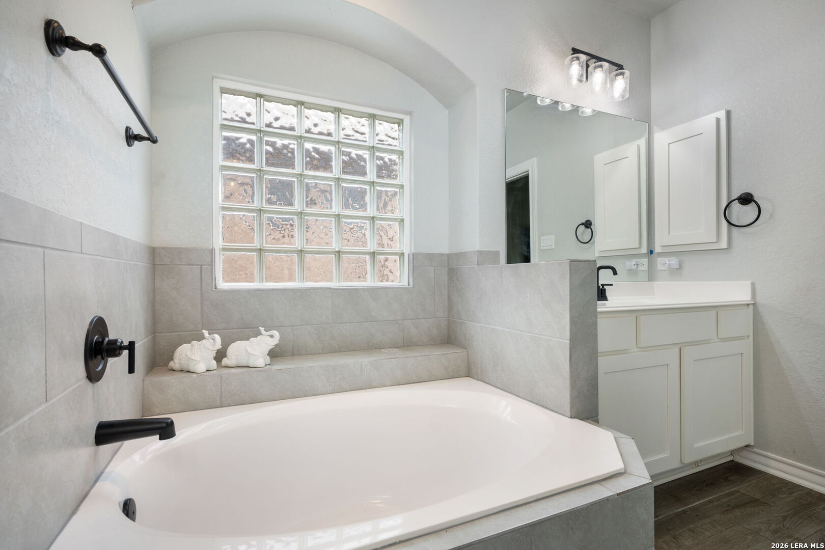 This beautiful home sits on a green/belt lot. Open floor plan with tons of natural light, atrium ceiling, tile flooring in the main areas, in the main floor is the primary bed/rm with bay window facing the landscaping view, & a secondary bed/rm. can be utilized as a guest/bed/rm or an office. A showstopper kitchen great for family gatherings, decorative niches and arches, second floor: 3 add'tl bed/rms & bath/rms and a second living area, water softener system and tankless water heater, 2 A/C units. Great location with easy access to 1604 & I-35. NOTE: washer & dryer will convey. Thank you for showing.