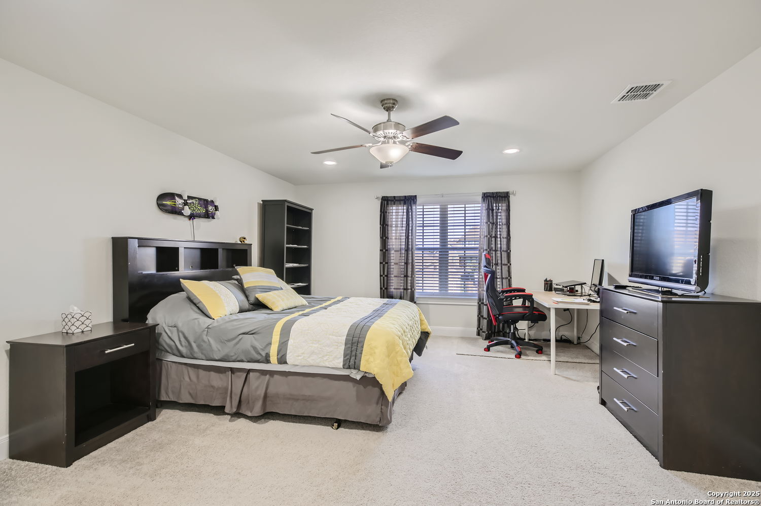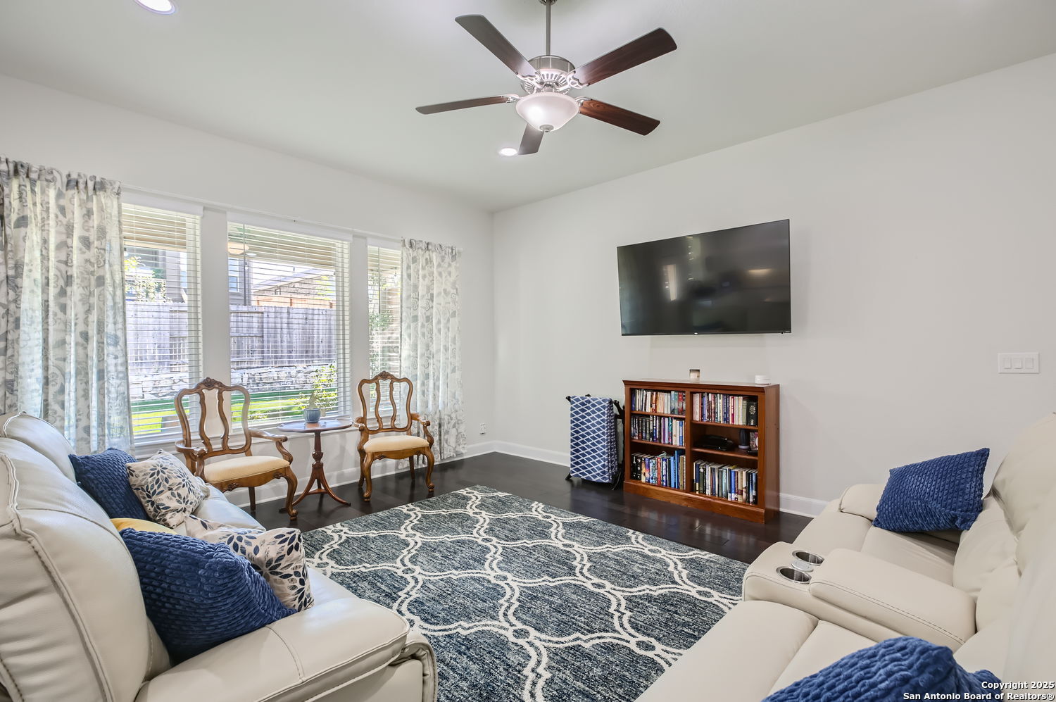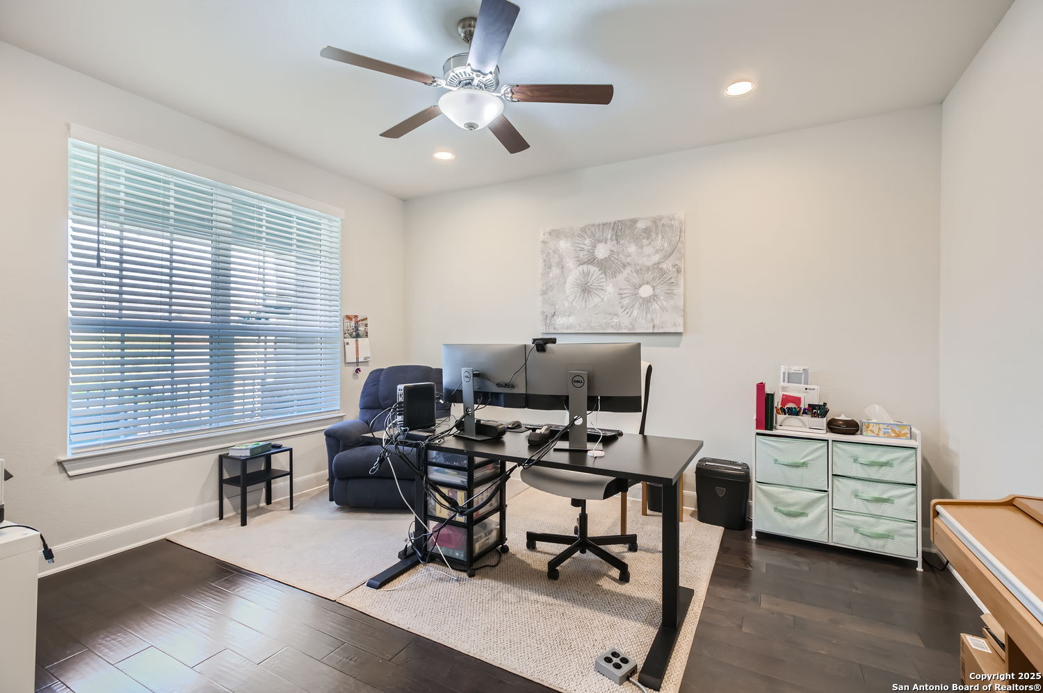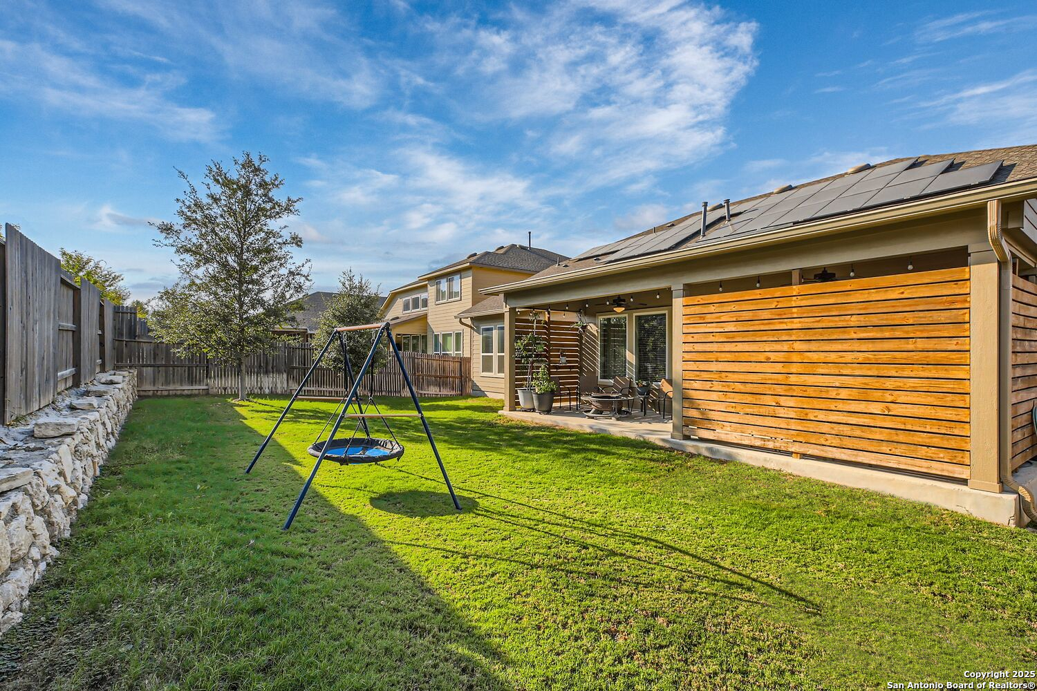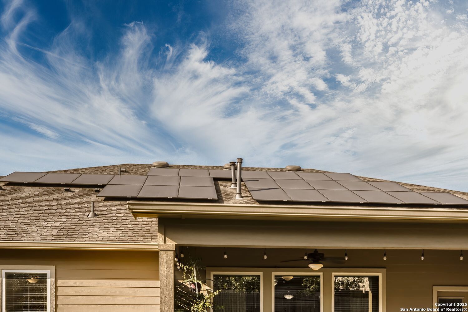 This four bedroom home was thoughtfully designed for functionality, providing a dedicated space for every need. Features include a charming covered front porch, beautiful rock flower beds, and solar panels for energy savings. Inside, you'll find an office with elegant glass French doors that could serve as a fifth bedroom, along with hardwood flooring in the main living areas. The home offers ample storage, a dedicated laundry room, and a three-car garage with built-in storage and a convenient drop zone. The kitchen showcases an island with a breakfast bar, plenty of cabinets and counter space, and under-cabinet lighting. There's also a separate dining room for entertaining. Enjoy the spacious 30x9 covered back patio with wood slat privacy walls, an oversized primary bedroom with a walk-in shower, and an upstairs living area that can be used as a game room. All bedrooms feature walk-in closets, and every room is generously sized. Plus, the loan is assumable.