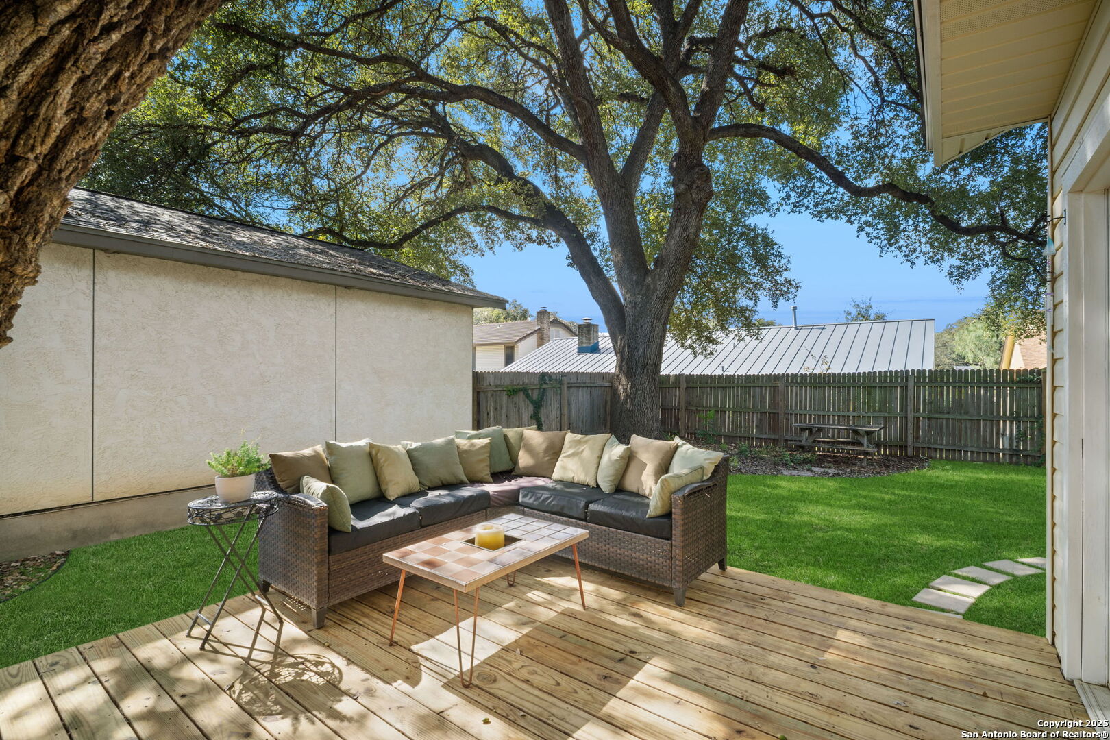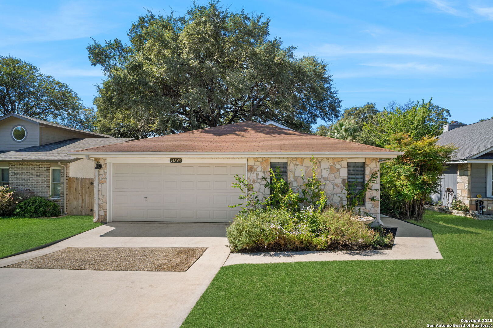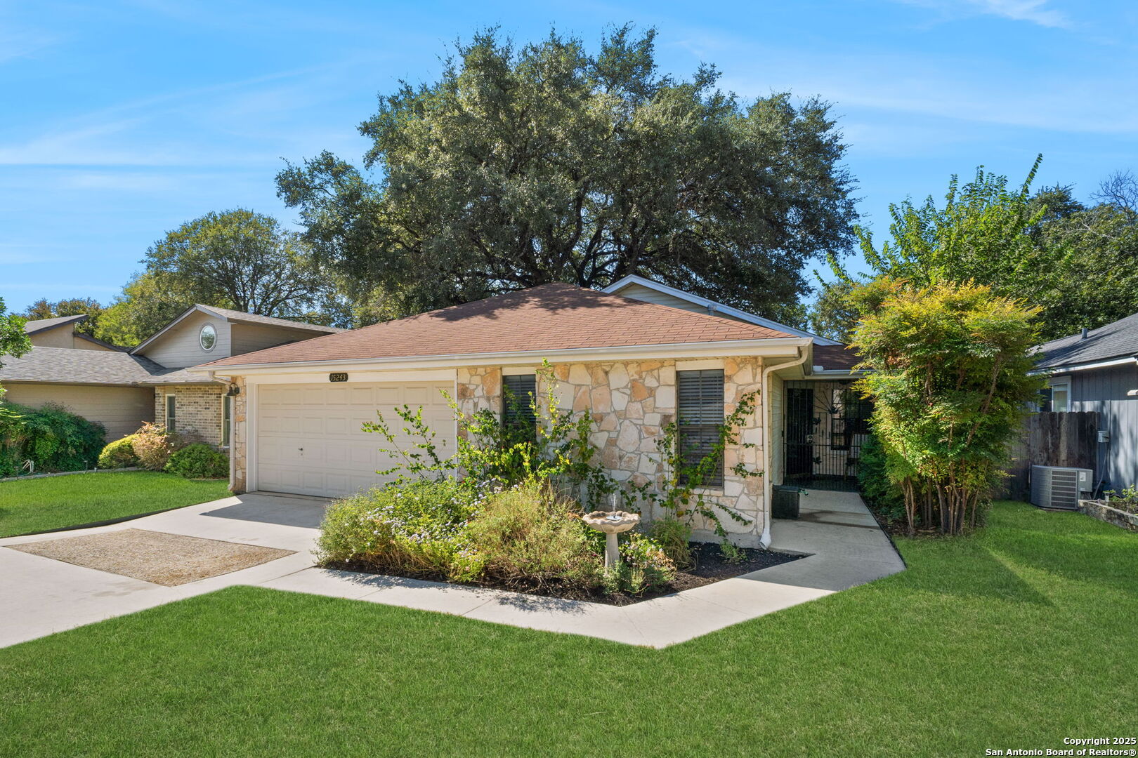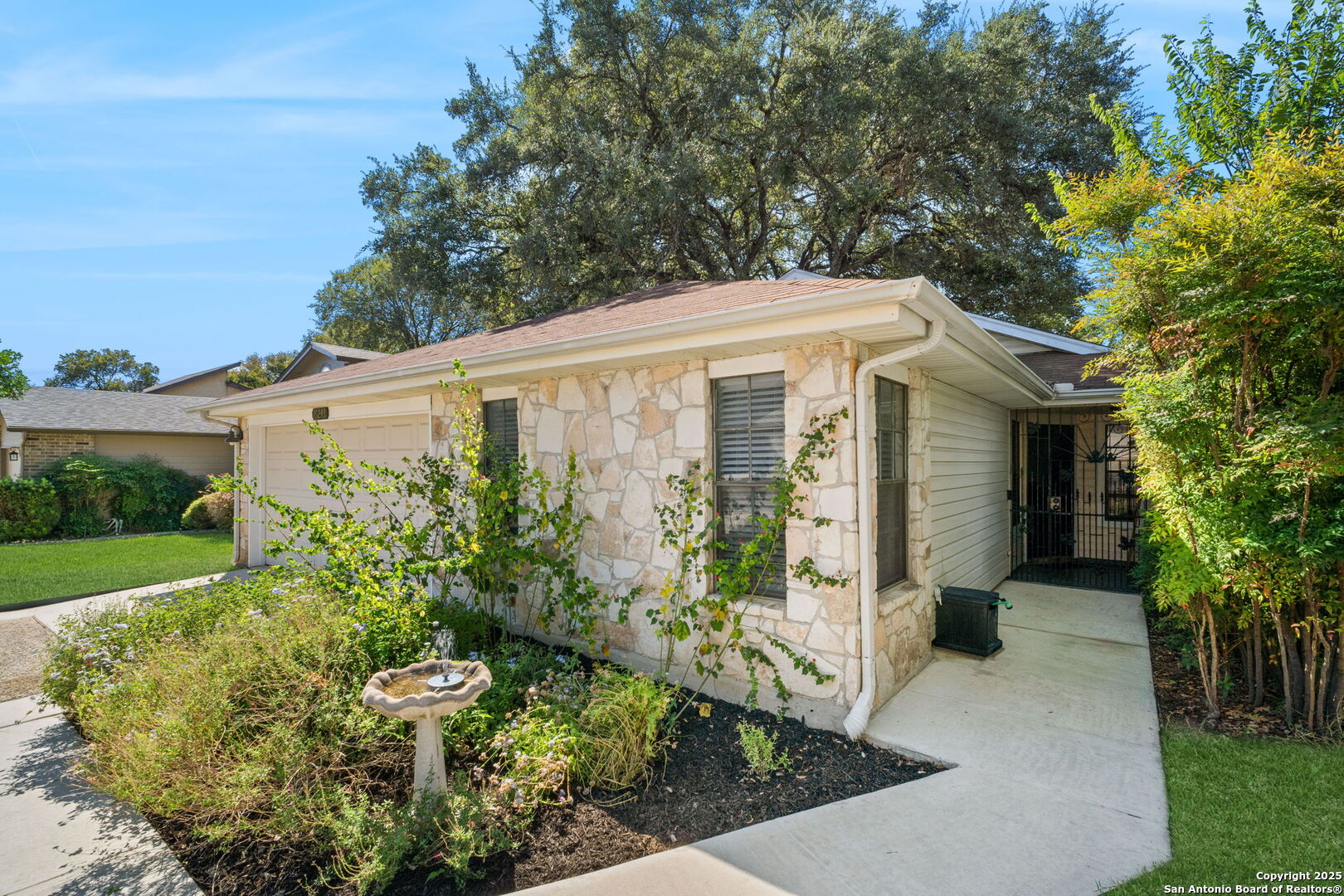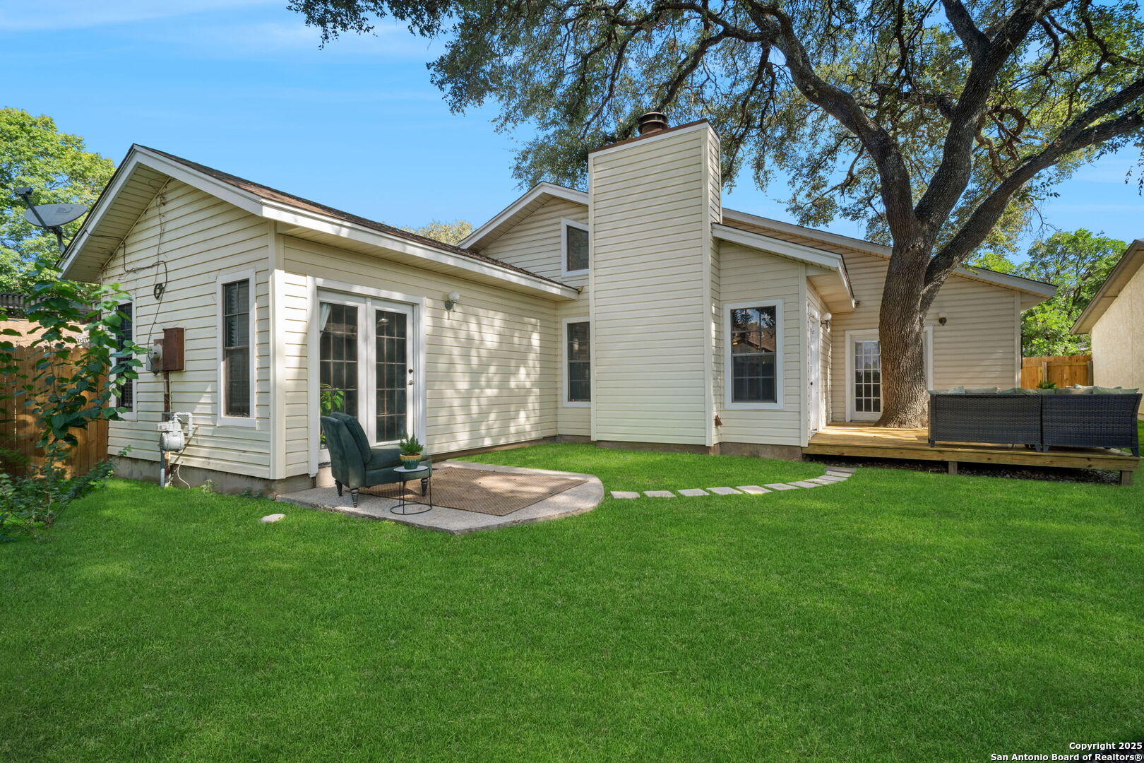 Located in the sought-after Thousand Oaks area, this lovingly maintained home radiates charm, comfort, and thoughtful craftsmanship. Inside, you'll find vaulted ceilings and expansive windows that fill the rooms with natural light. The living space features a striking stone fireplace, and to one side, a stylish bar area with mirrored accents and decorative tile that adds character and warmth. The kitchen combines style and function with stainless steel appliances, a charming bay window above the sink, beautifully repainted deep green cabinetry, and direct access to the back deck, creating an ideal setting for seamless indoor and outdoor living. Elegant vintage chandeliers, recessed lighting, and upgraded fans enhance the living spaces with a touch of sophistication. The third bedroom offers flexibility and can easily serve as a home office, creative studio, media room, or cozy reading nook. The primary suite stands out with high ceilings, private outdoor access, and an ensuite bath that feels like a retreat. It features a skylight, a statement tile shower perfect for hanging plants, and mirrored closet doors that reflect both space and light. Throughout the home, you'll find quality finishes including authentic hardwood and Saltillo tile flooring, fresh paint, and updated fixtures. The backyard offers a peaceful setting surrounded by mature trees and a privacy fence, with a newer deck that creates the perfect space to relax and enjoy the outdoors. Conveniently located just minutes from the airport with quick access to both Highway 281 and Loop 1604, this home perfectly blends style, comfort, and location in one inviting package-all with no HOA.