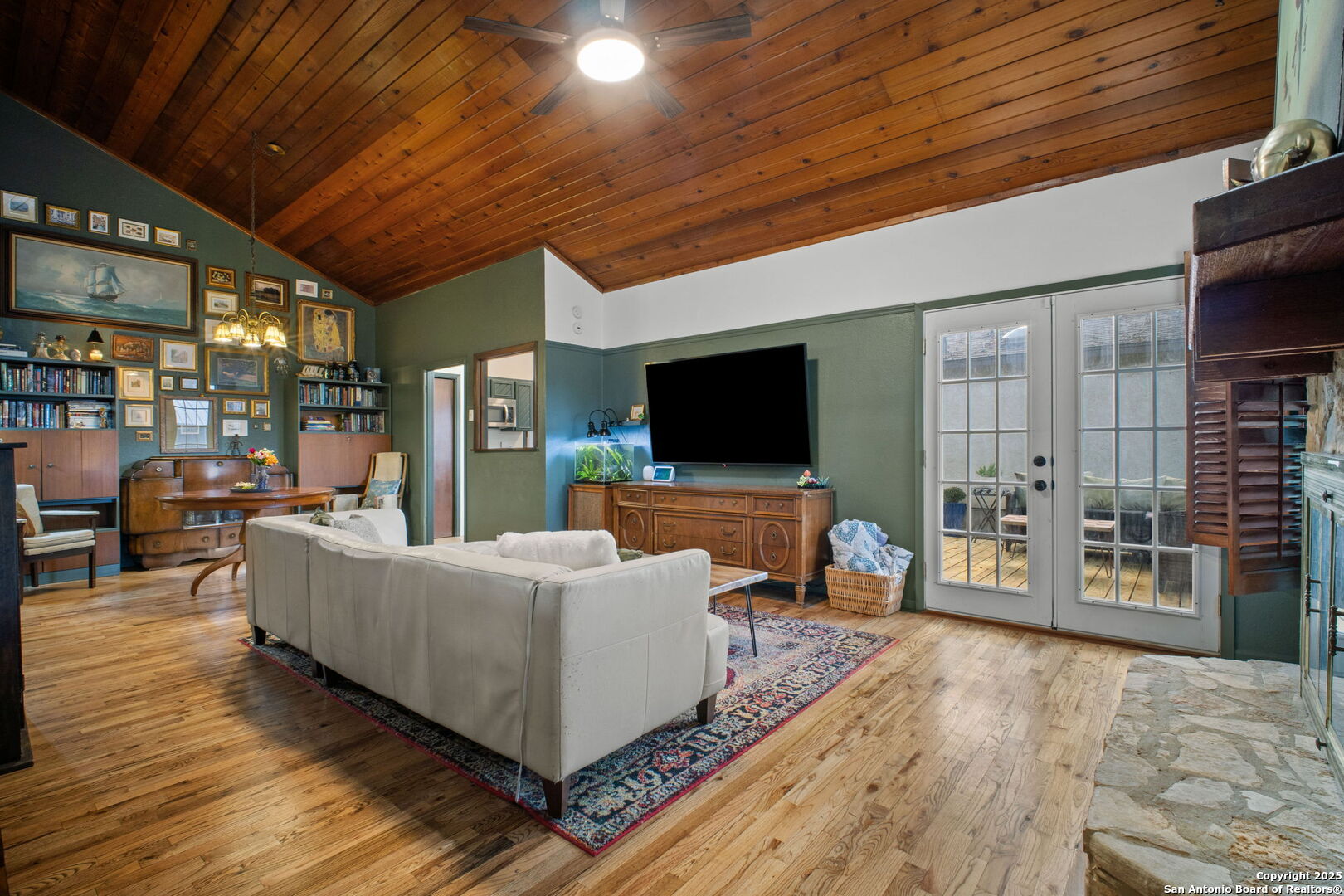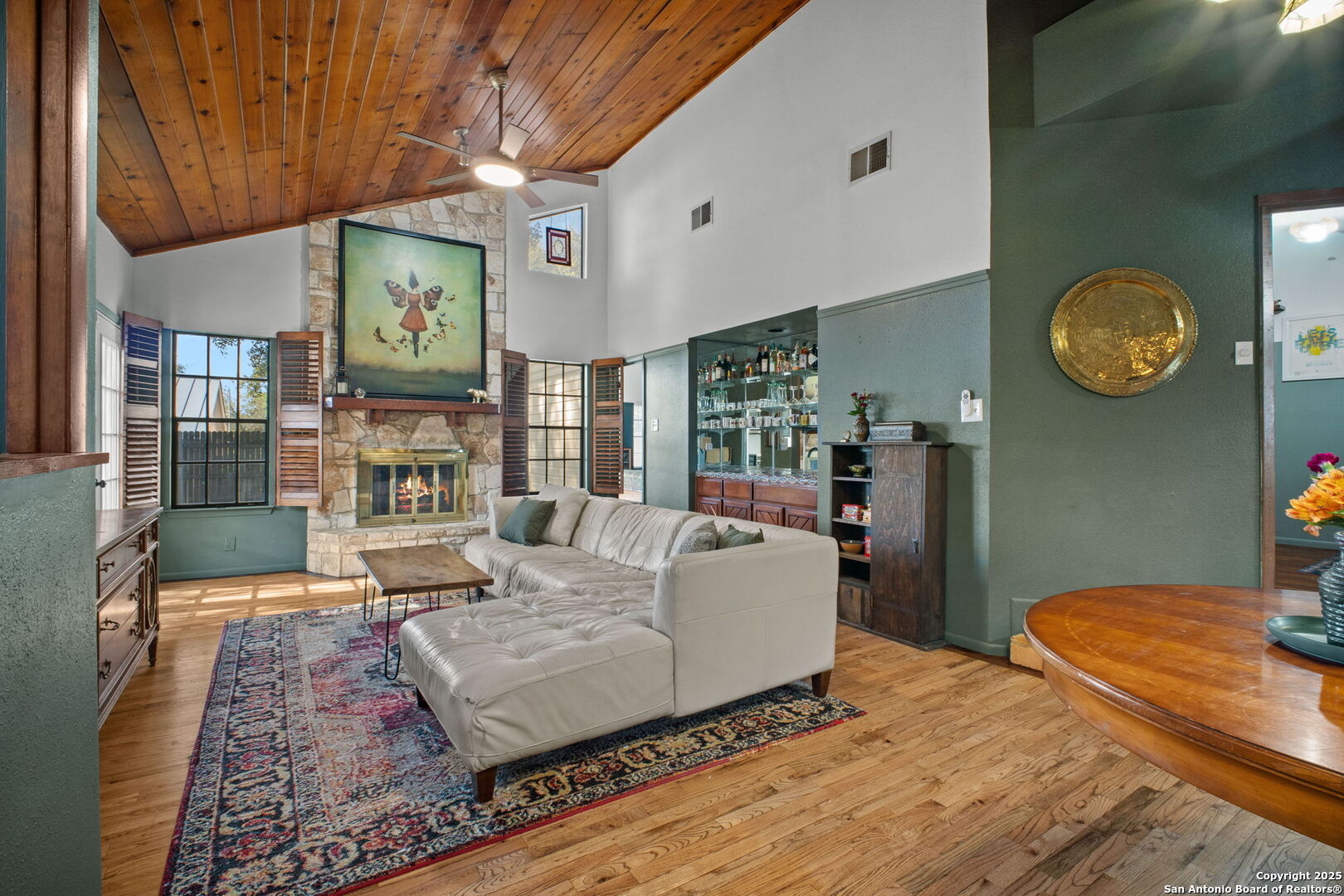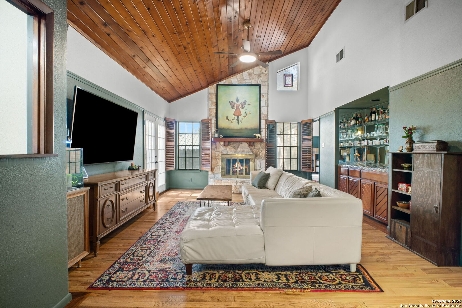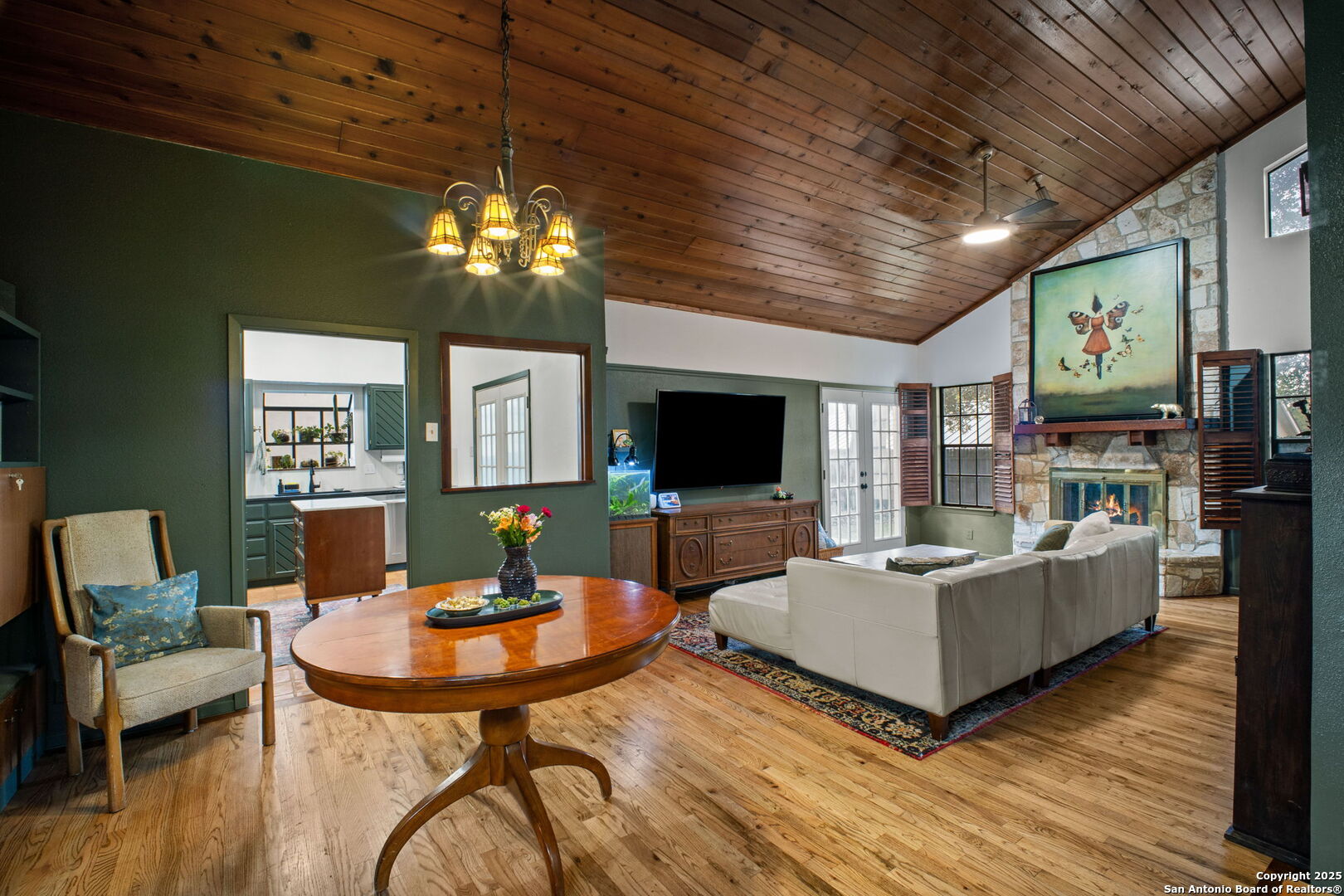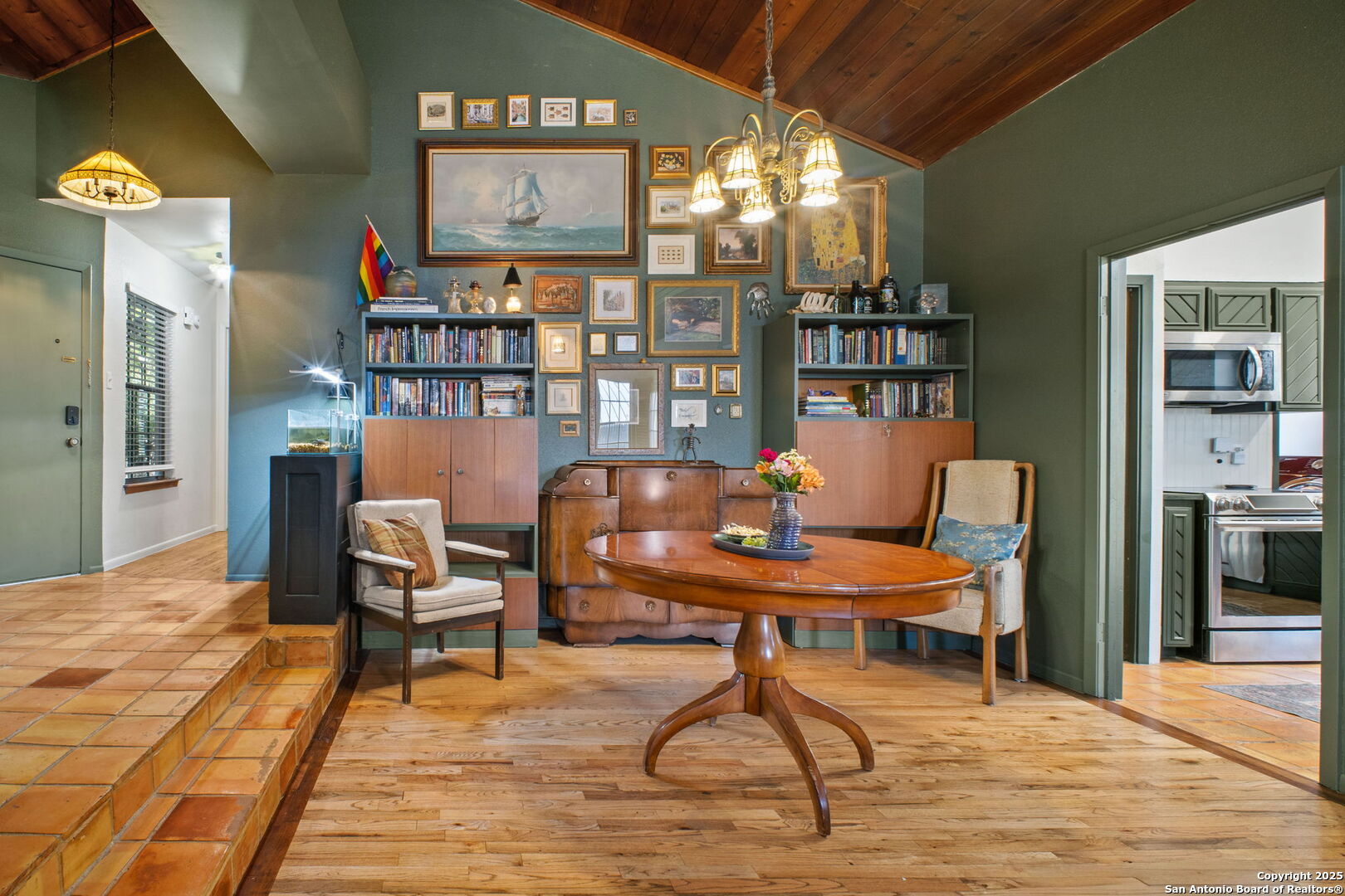 Located in the sought-after Thousand Oaks area, this lovingly maintained home radiates charm, comfort, and thoughtful craftsmanship. Inside, you'll find vaulted ceilings and expansive windows that fill the rooms with natural light. The living space features a striking stone fireplace, and to one side, a stylish bar area with mirrored accents and decorative tile that adds character and warmth. The kitchen combines style and function with stainless steel appliances, a charming bay window above the sink, beautifully repainted deep green cabinetry, and direct access to the back deck, creating an ideal setting for seamless indoor and outdoor living. Elegant vintage chandeliers, recessed lighting, and upgraded fans enhance the living spaces with a touch of sophistication. The third bedroom offers flexibility and can easily serve as a home office, creative studio, media room, or cozy reading nook. The primary suite stands out with high ceilings, private outdoor access, and an ensuite bath that feels like a retreat. It features a skylight, a statement tile shower perfect for hanging plants, and mirrored closet doors that reflect both space and light. Throughout the home, you'll find quality finishes including authentic hardwood and Saltillo tile flooring, fresh paint, and updated fixtures. The backyard offers a peaceful setting surrounded by mature trees and a privacy fence, with a newer deck that creates the perfect space to relax and enjoy the outdoors. Conveniently located just minutes from the airport with quick access to both Highway 281 and Loop 1604, this home perfectly blends style, comfort, and location in one inviting package-all with no HOA.