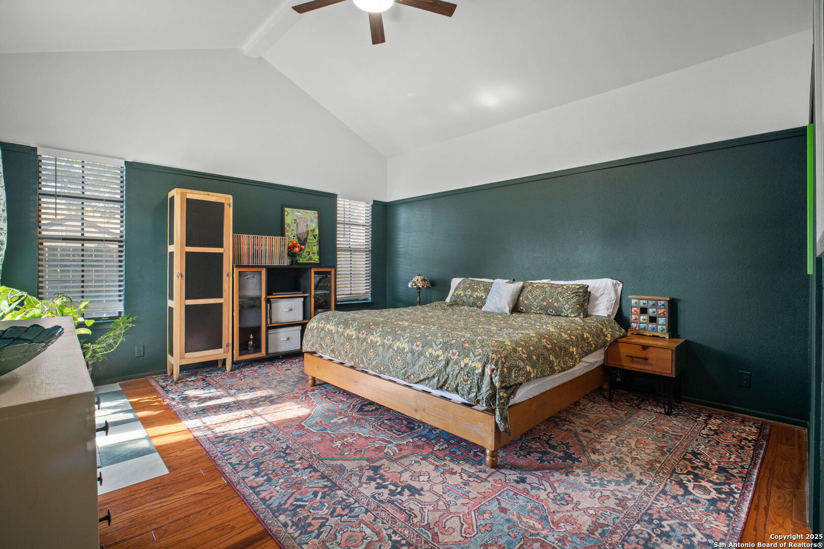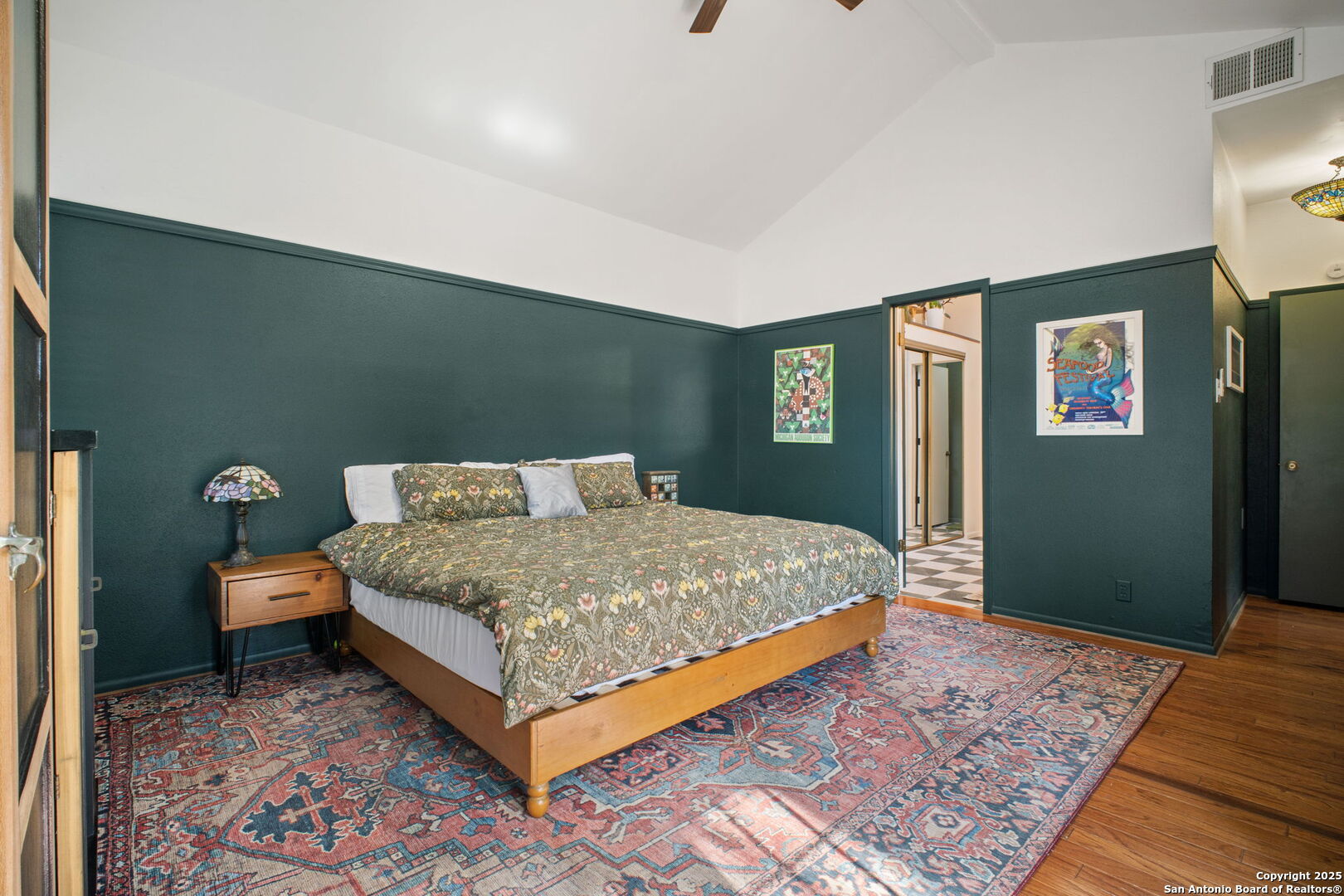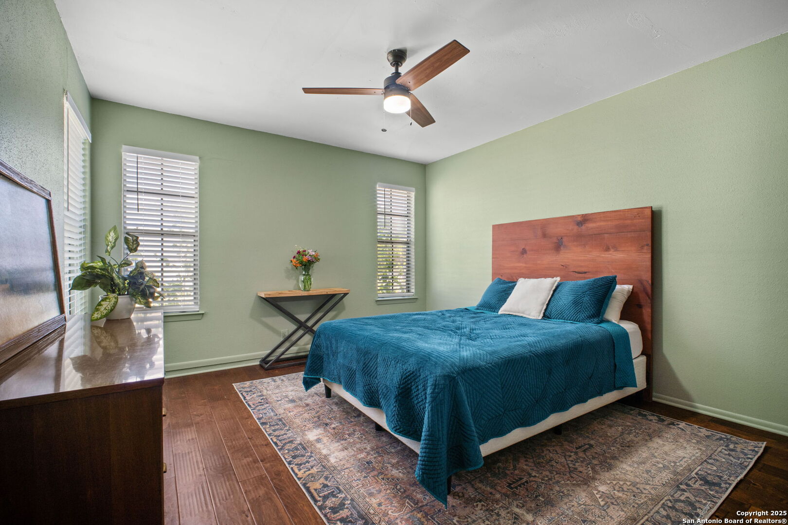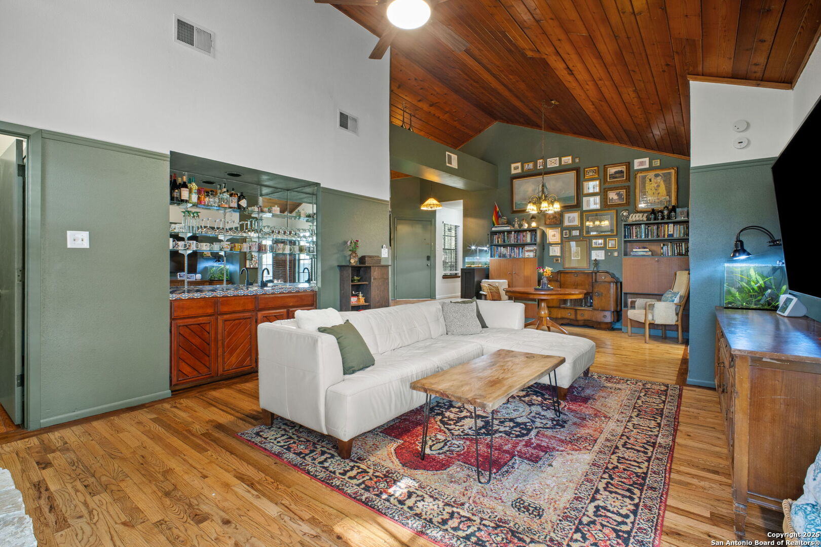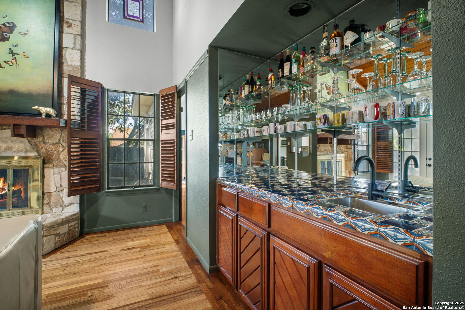Located in the sought-after Thousand Oaks area, this lovingly maintained home radiates charm, comfort, and thoughtful craftsmanship. Inside, you'll find vaulted ceilings and expansive windows that fill the rooms with natural light. The living space features a striking stone fireplace, and to one side, a stylish bar area with mirrored accents and decorative tile that adds character and warmth. The kitchen combines style and function with stainless steel appliances, a charming bay window above the sink, beautifully repainted deep green cabinetry, and direct access to the back deck, creating an ideal setting for seamless indoor and outdoor living. Elegant vintage chandeliers, recessed lighting, and upgraded fans enhance the living spaces with a touch of sophistication. The third bedroom offers flexibility and can easily serve as a home office, creative studio, media room, or cozy reading nook. The primary suite stands out with high ceilings, private outdoor access, and an ensuite bath that feels like a retreat. It features a skylight, a statement tile shower perfect for hanging plants, and mirrored closet doors that reflect both space and light. Throughout the home, you'll find quality finishes including authentic hardwood and Saltillo tile flooring, fresh paint, and updated fixtures. The backyard offers a peaceful setting surrounded by mature trees and a privacy fence, with a newer deck that creates the perfect space to relax and enjoy the outdoors. Conveniently located just minutes from the airport with quick access to both Highway 281 and Loop 1604, this home perfectly blends style, comfort, and location in one inviting package-all with no HOA.