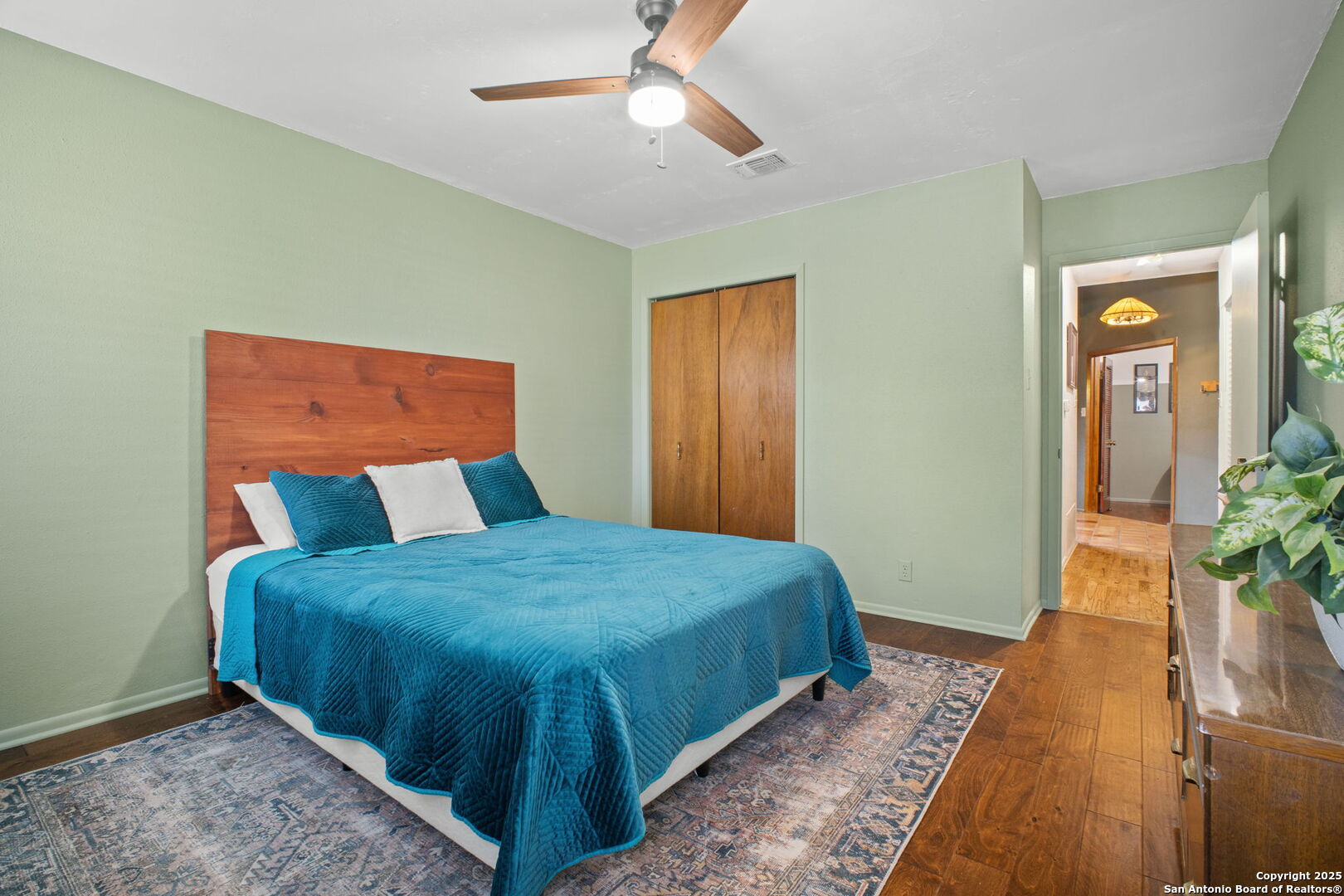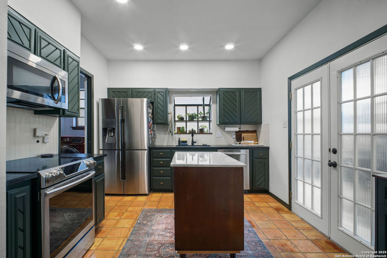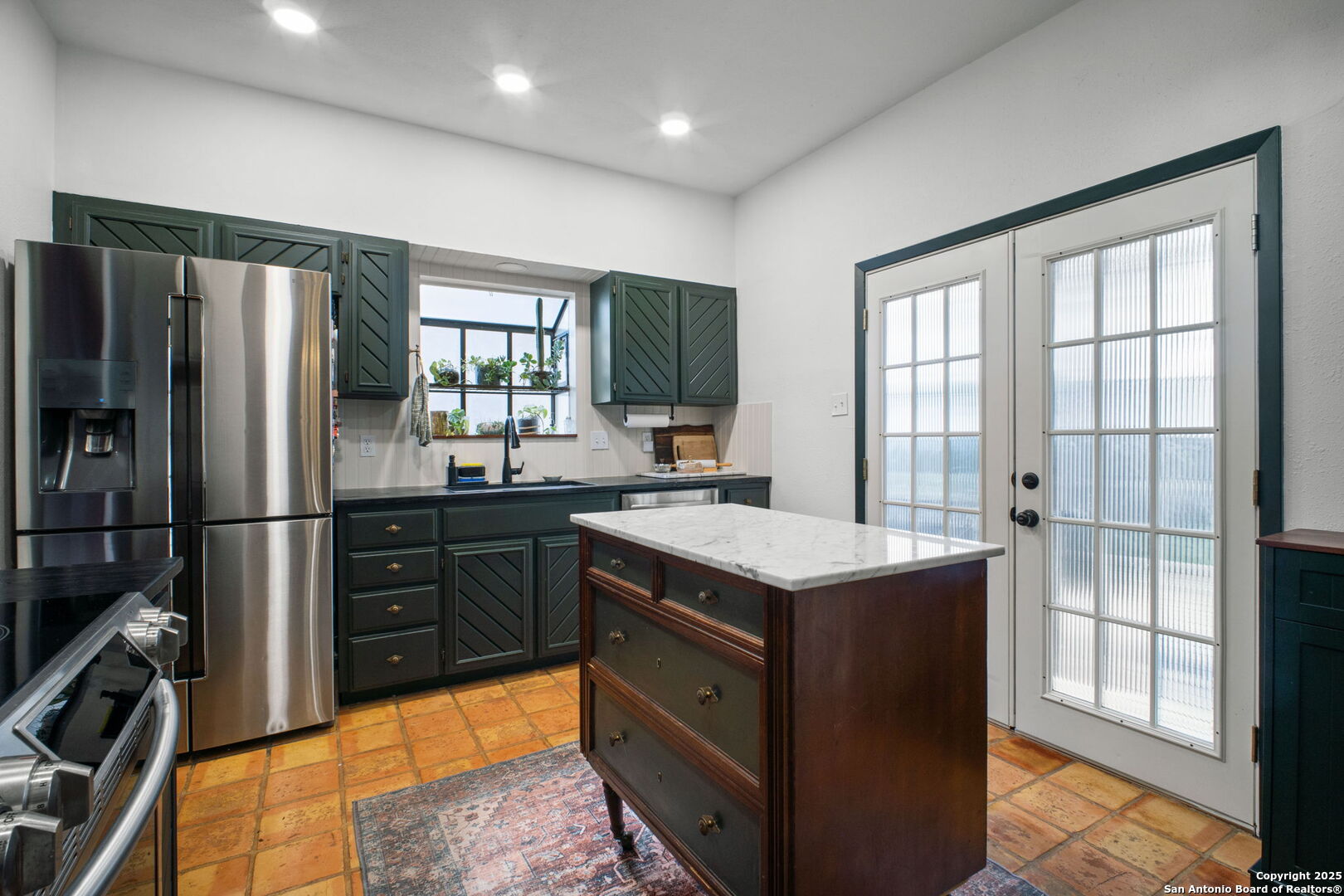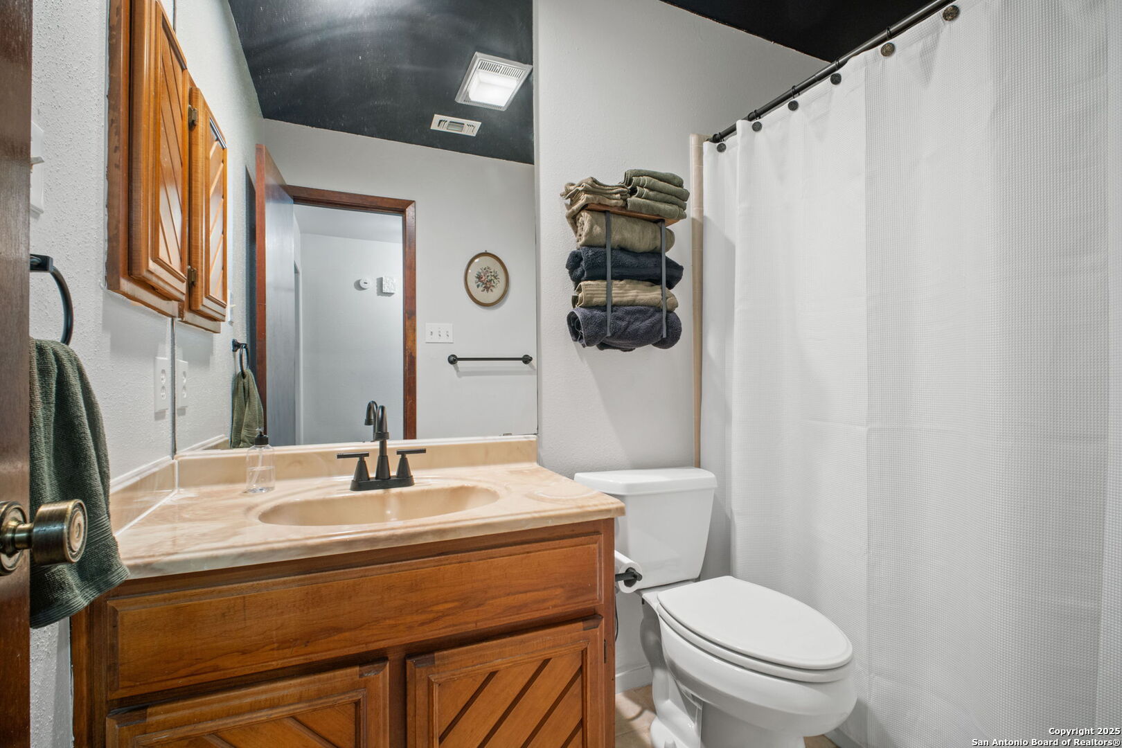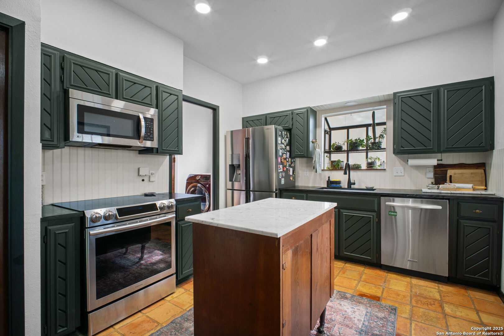 Located in the sought-after Thousand Oaks area, this lovingly maintained home radiates charm, comfort, and thoughtful craftsmanship. Inside, you'll find vaulted ceilings and expansive windows that fill the rooms with natural light. The living space features a striking stone fireplace, and to one side, a stylish bar area with mirrored accents and decorative tile that adds character and warmth. The kitchen combines style and function with stainless steel appliances, a charming bay window above the sink, beautifully repainted deep green cabinetry, and direct access to the back deck, creating an ideal setting for seamless indoor and outdoor living. Elegant vintage chandeliers, recessed lighting, and upgraded fans enhance the living spaces with a touch of sophistication. The third bedroom offers flexibility and can easily serve as a home office, creative studio, media room, or cozy reading nook. The primary suite stands out with high ceilings, private outdoor access, and an ensuite bath that feels like a retreat. It features a skylight, a statement tile shower perfect for hanging plants, and mirrored closet doors that reflect both space and light. Throughout the home, you'll find quality finishes including authentic hardwood and Saltillo tile flooring, fresh paint, and updated fixtures. The backyard offers a peaceful setting surrounded by mature trees and a privacy fence, with a newer deck that creates the perfect space to relax and enjoy the outdoors. Conveniently located just minutes from the airport with quick access to both Highway 281 and Loop 1604, this home perfectly blends style, comfort, and location in one inviting package-all with no HOA.