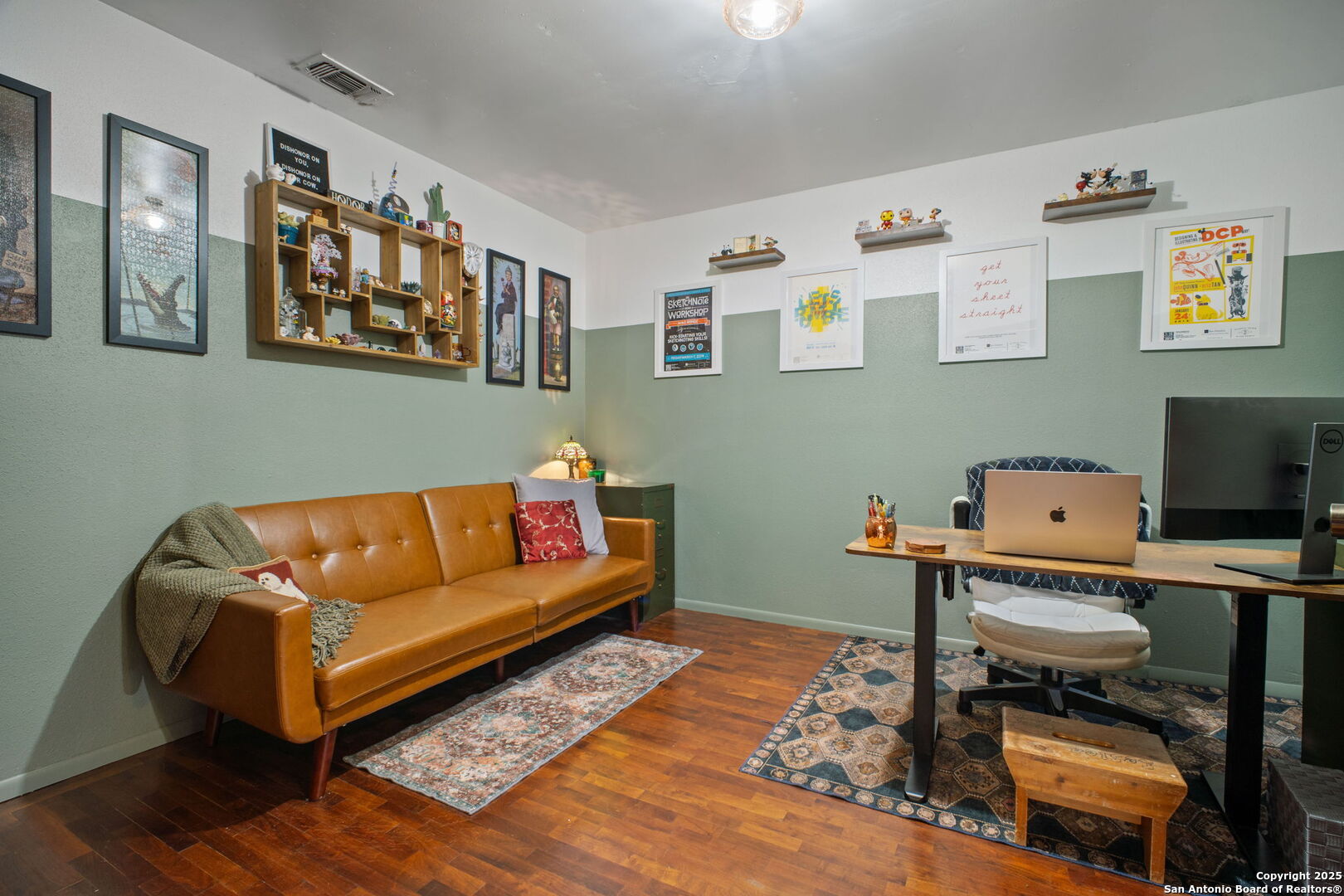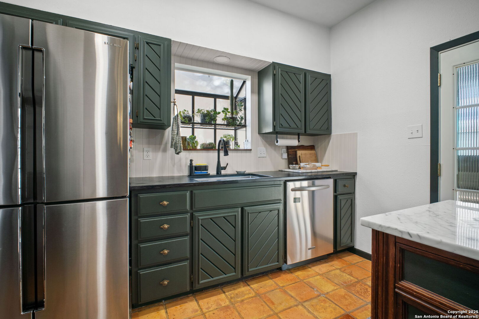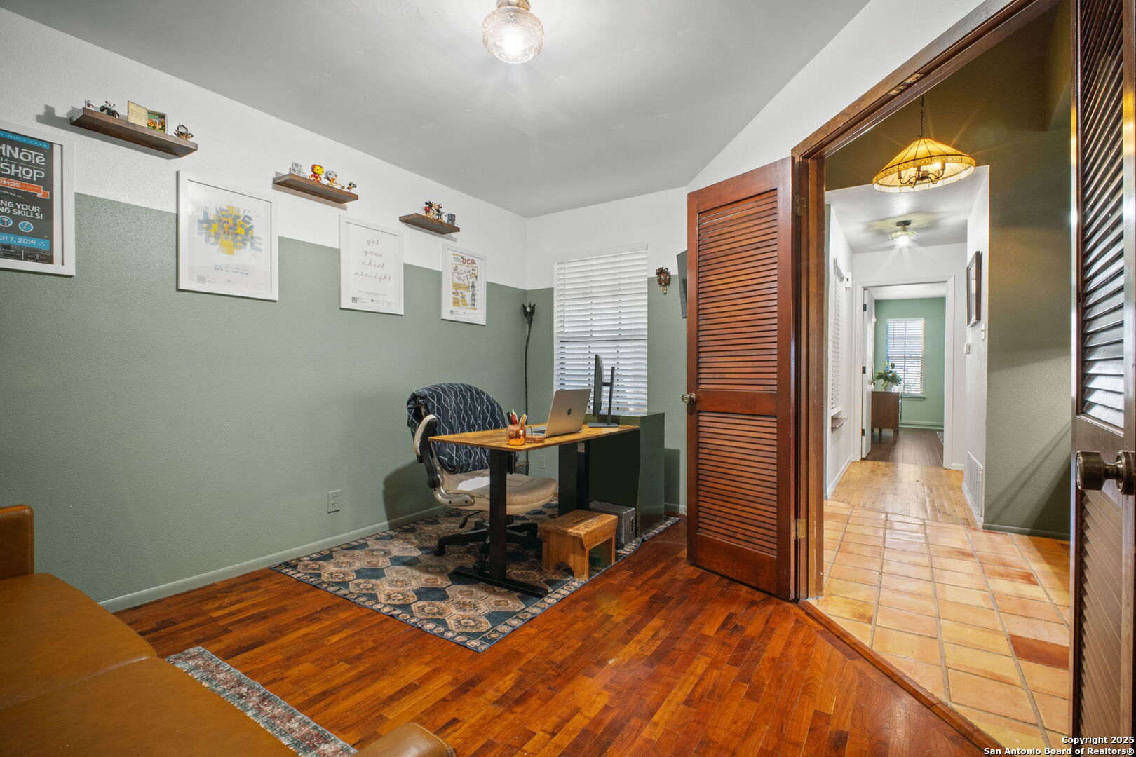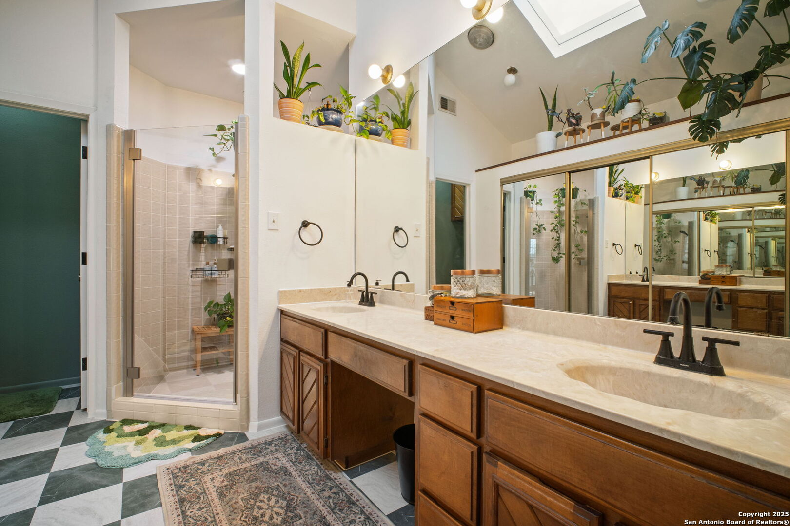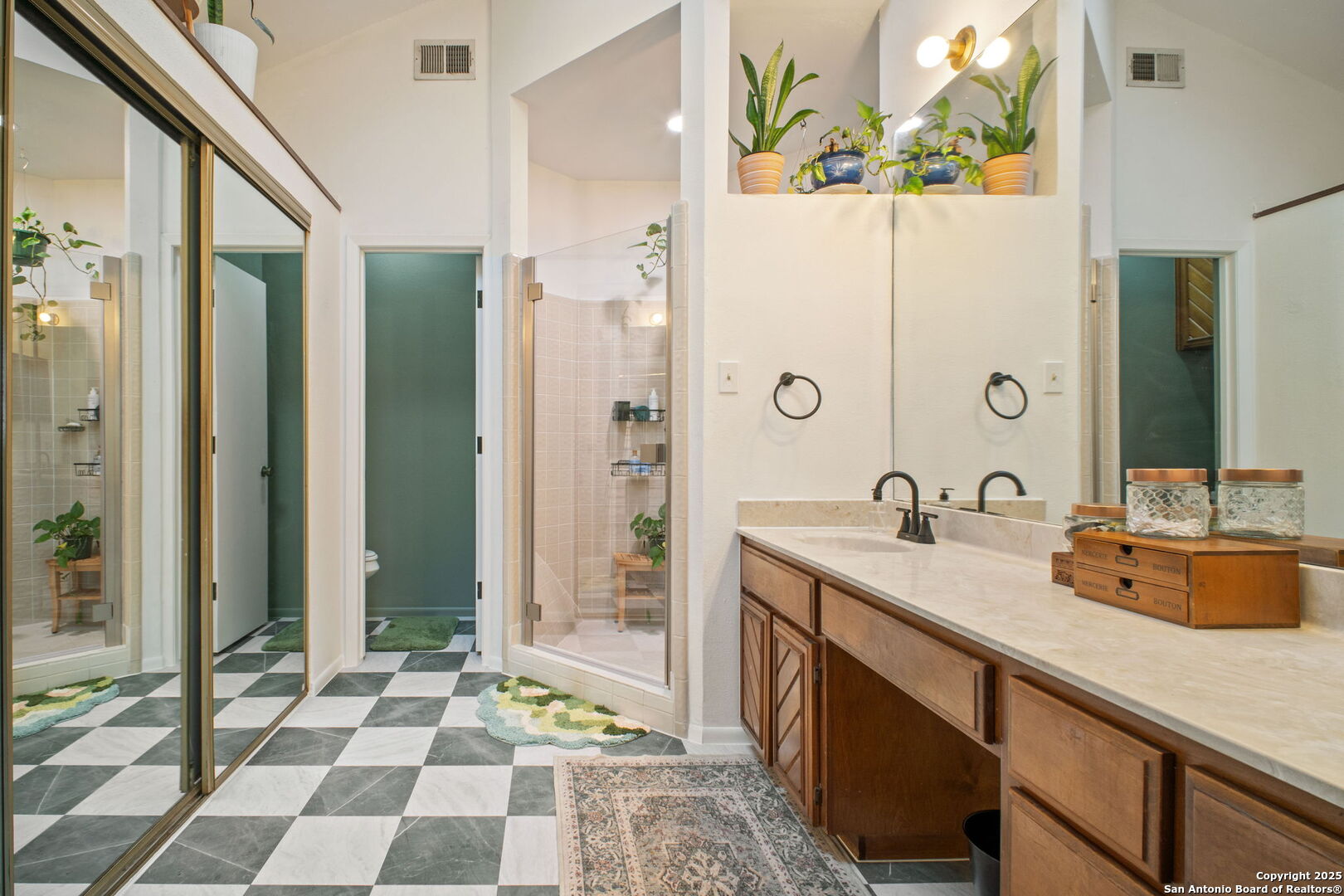 Located in the sought-after Thousand Oaks area, this lovingly maintained home radiates charm, comfort, and thoughtful craftsmanship. Inside, you'll find vaulted ceilings and expansive windows that fill the rooms with natural light. The living space features a striking stone fireplace, and to one side, a stylish bar area with mirrored accents and decorative tile that adds character and warmth. The kitchen combines style and function with stainless steel appliances, a charming bay window above the sink, beautifully repainted deep green cabinetry, and direct access to the back deck, creating an ideal setting for seamless indoor and outdoor living. Elegant vintage chandeliers, recessed lighting, and upgraded fans enhance the living spaces with a touch of sophistication. The third bedroom offers flexibility and can easily serve as a home office, creative studio, media room, or cozy reading nook. The primary suite stands out with high ceilings, private outdoor access, and an ensuite bath that feels like a retreat. It features a skylight, a statement tile shower perfect for hanging plants, and mirrored closet doors that reflect both space and light. Throughout the home, you'll find quality finishes including authentic hardwood and Saltillo tile flooring, fresh paint, and updated fixtures. The backyard offers a peaceful setting surrounded by mature trees and a privacy fence, with a newer deck that creates the perfect space to relax and enjoy the outdoors. Conveniently located just minutes from the airport with quick access to both Highway 281 and Loop 1604, this home perfectly blends style, comfort, and location in one inviting package-all with no HOA.