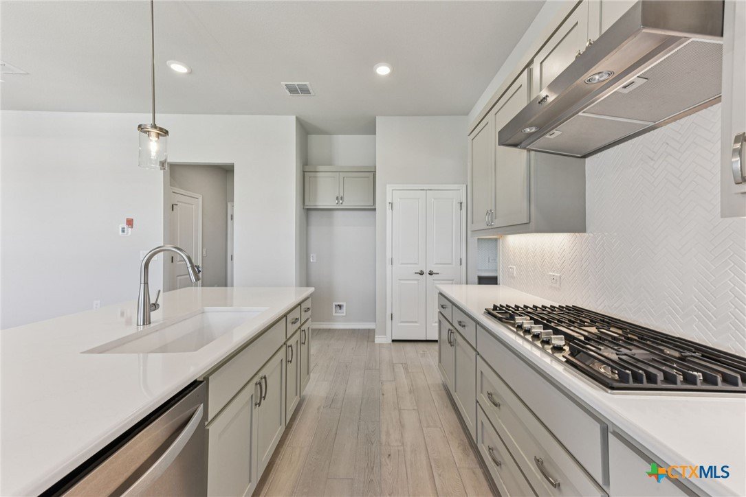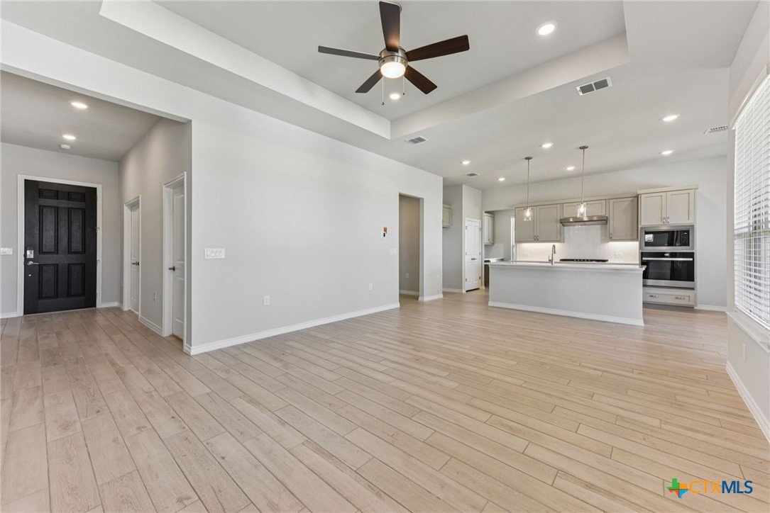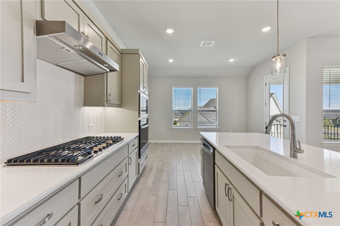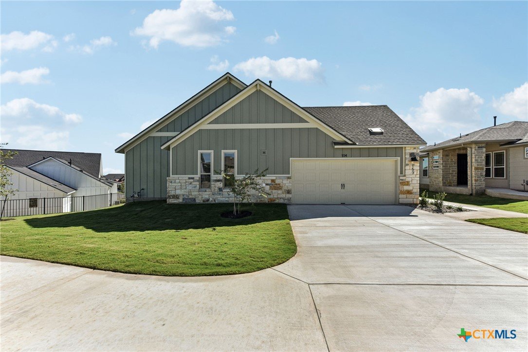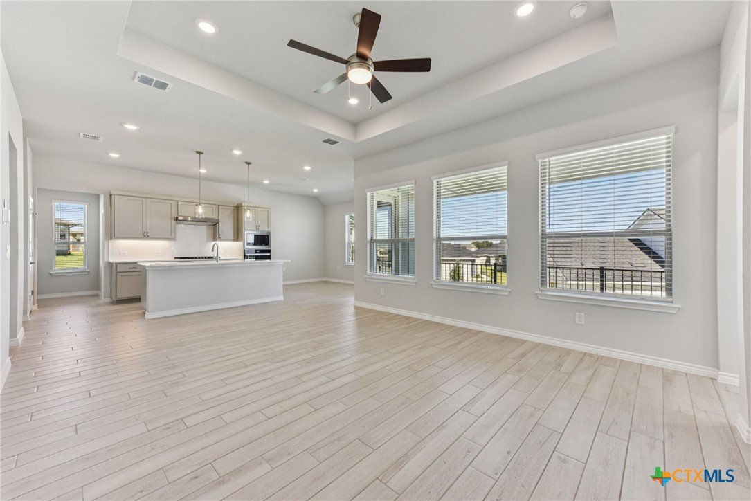 Estes plan with upgraded kitchen, quartz countertops, upgraded tile flooring, optional tray ceiling in living, optional 2 car side entry garage, Express cordless blinds