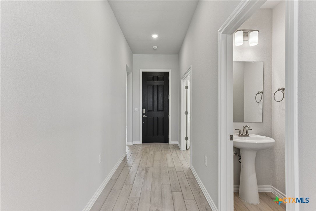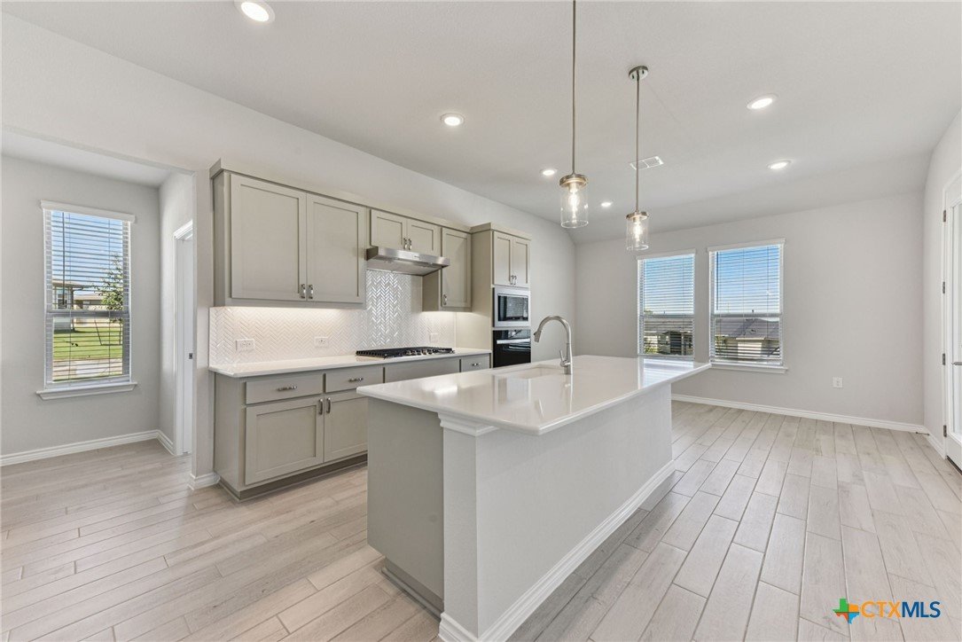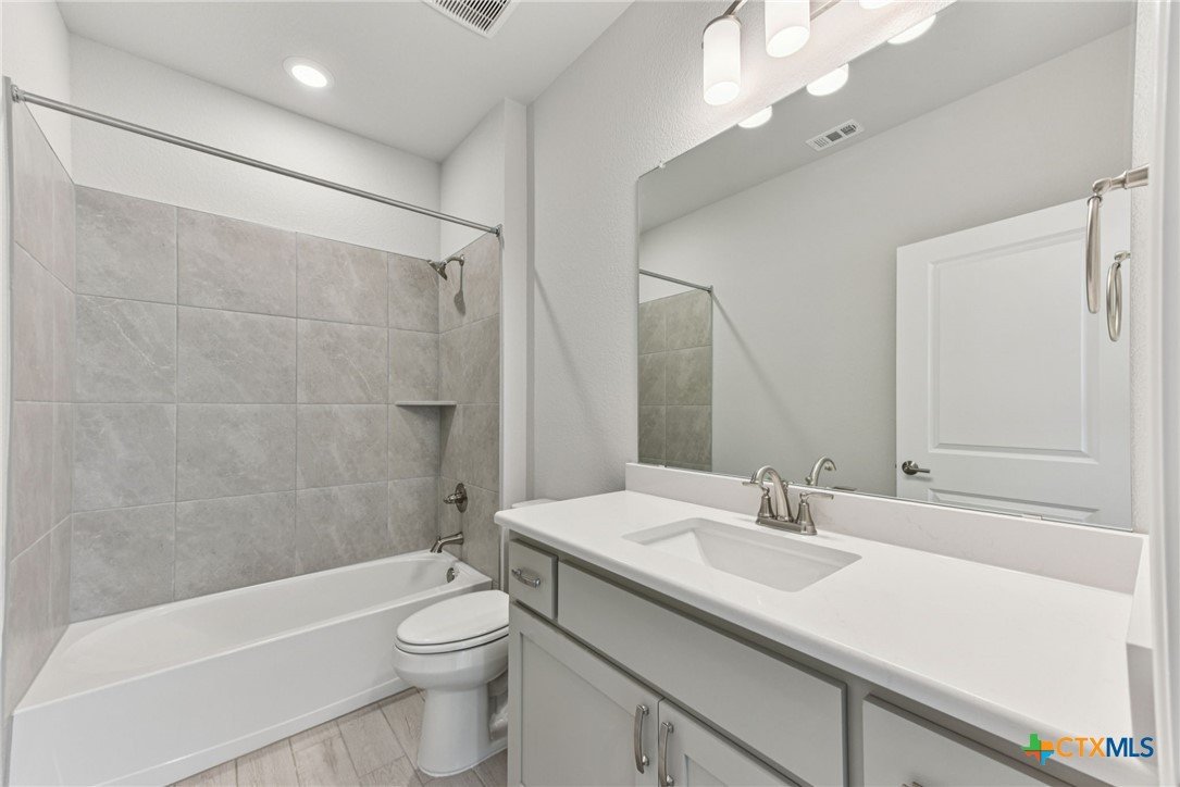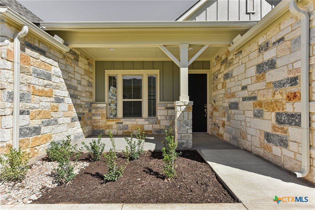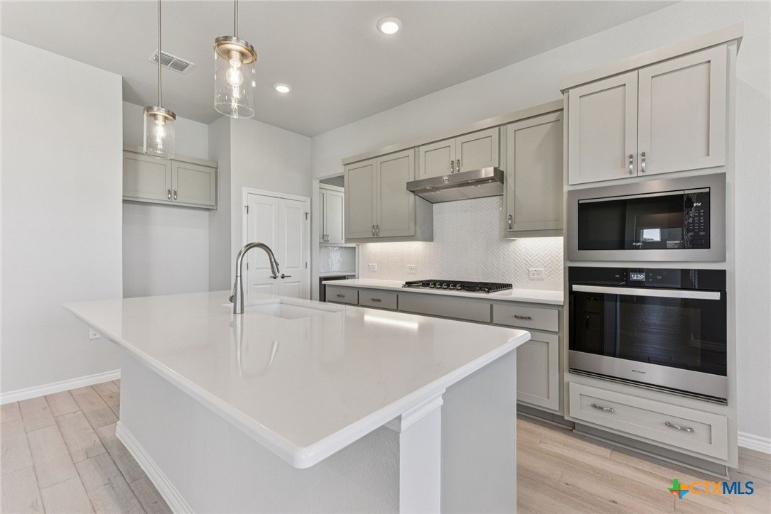 Estes plan with upgraded kitchen, quartz countertops, upgraded tile flooring, optional tray ceiling in living, optional 2 car side entry garage, Express cordless blinds