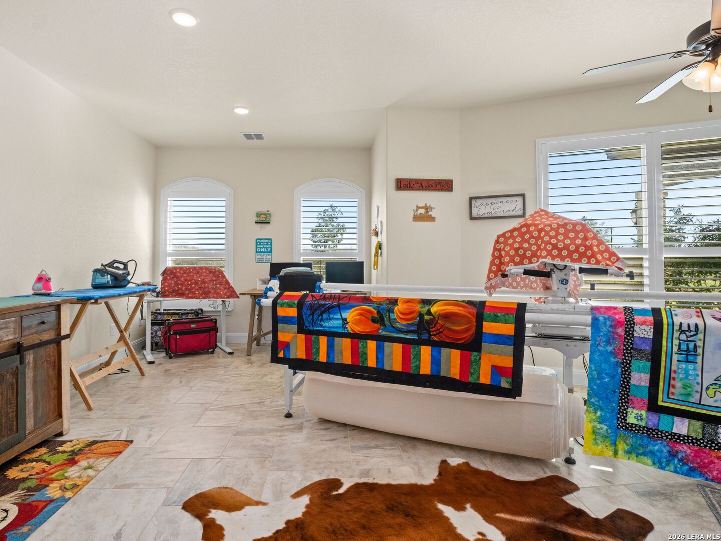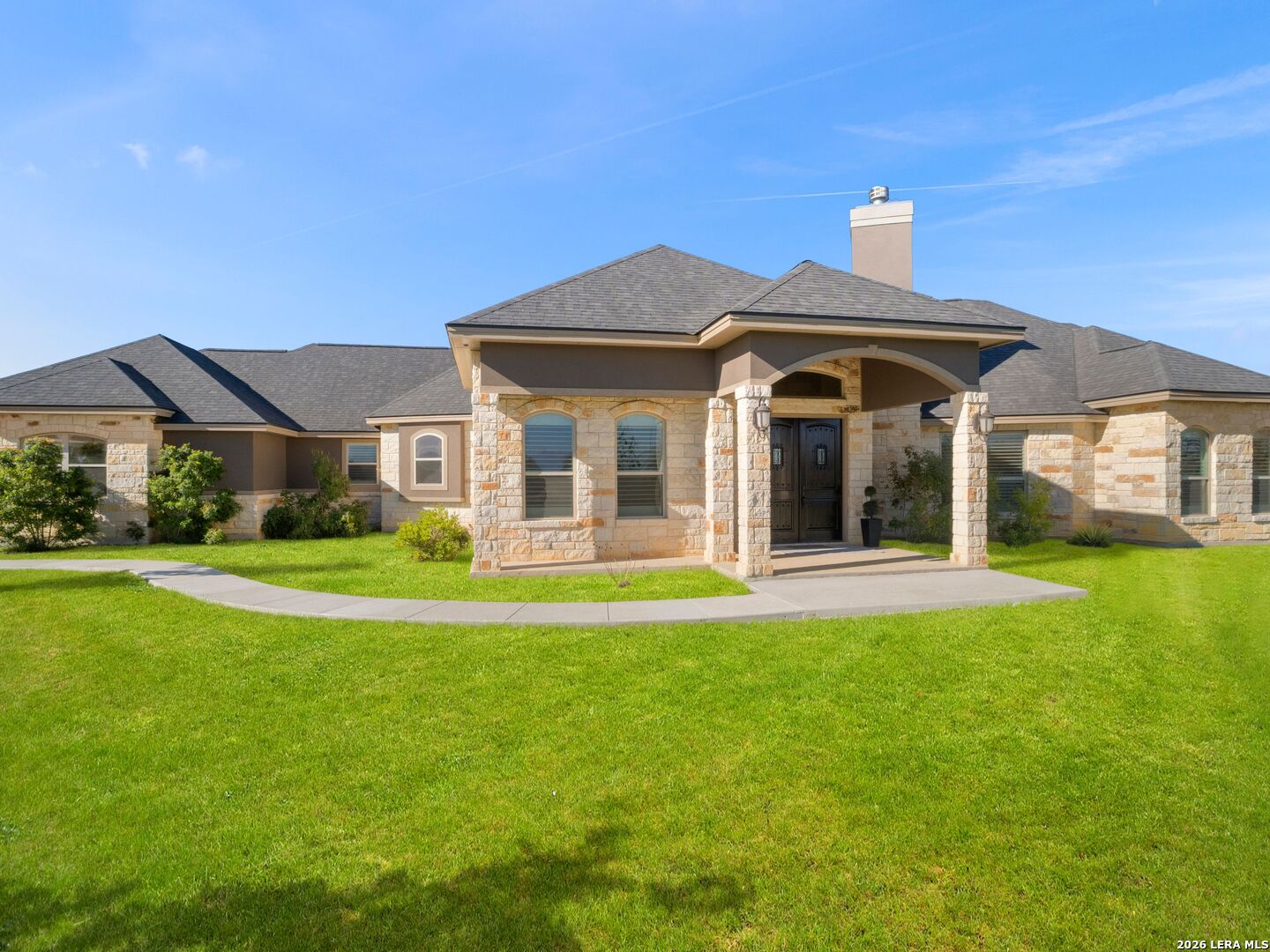 Nestled on 10 ag-exempt acres of peaceful, flat Texas countryside, this newer custom-built ranch-style home by KC Custom Homes offers the rare blend of refined craftsmanship, functional flexibility, and true land freedom. Wrapped in coastal grasses and wide-open skies, the property delivers serenity, privacy, and productivity-producing approximately 72 bales of hay off 8 acres, maintaining the agricultural exemption with ease. Fully fenced and cross-fenced, this is an ideal equestrian property with ample space for horses, cows, a barn, shop, arena, or future improvements, all while enjoying stunning sunsets and distant Floresville city lights from the rear of the home. Inside, the thoughtfully designed split-floor plan showcases oversized doors, plantation shutters in every room, hickory cabinetry, and abundant storage throughout-including multiple overflow closets and an oversized pantry with freezer space. The open-concept living area is anchored by a striking stone fireplace and expansive windows that flood the home with natural light and frame tranquil pasture views. The kitchen is both elegant and practical, featuring granite countertops, custom cabinetry, high-end stainless appliances, and a large island perfect for gathering. All appliances convey, making this home truly move-in ready. The primary suite is a true showpiece, offering space, privacy, and a luxury spa-inspired bath complete with a Texas sized "car-wash" style shower, soaking tub, dual vanities, and a generous walk-in closet. Secondary bedrooms are spacious and well-appointed, while the home also includes a large office with a closet and a media/flex room with a closet-both easily adaptable as additional bedrooms. With minimal modification, the layout can comfortably expand from three bedrooms to four or even five, creating exceptional long-term versatility. Outdoors, the covered patio invites quiet mornings and relaxed evenings overlooking the land, while pool and shop plans are already in place, with the home plumbed for gas at the rear to support future additions. Additional highlights include a buried propane tank, whole-house water filtration and softener, wired security system, drip irrigation around the home, and a three-car oversized garage with a four-foot extension-perfect for full-size trucks-plus an exterior garage exit with stoop for added convenience. This is more than a home-it's a Texas lifestyle. Ag-exempt, equestrian-ready acreage. A flexible, custom interior. Space to grow, build, and breathe. Freedom looks even better in person-come experience it before someone else claims it.