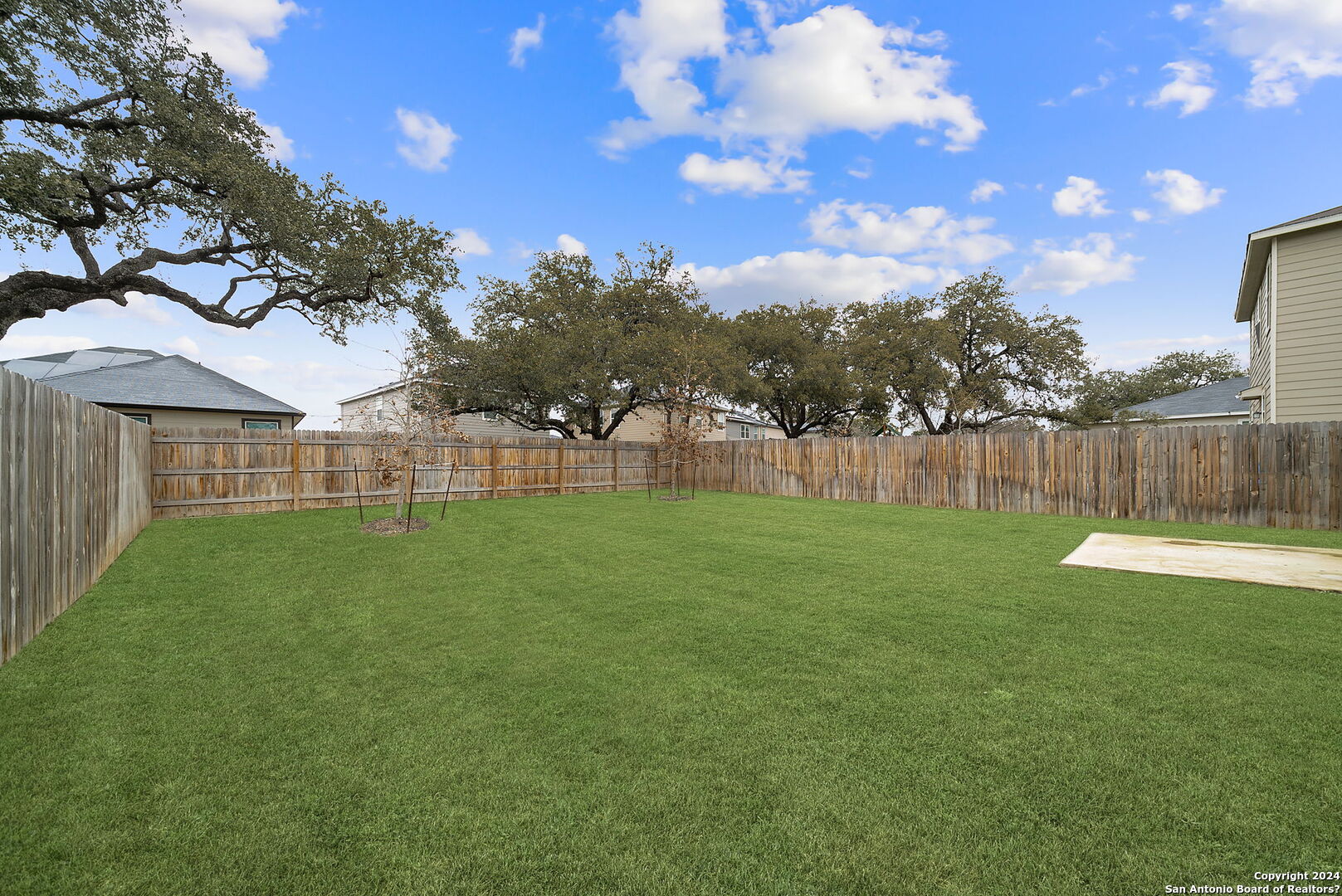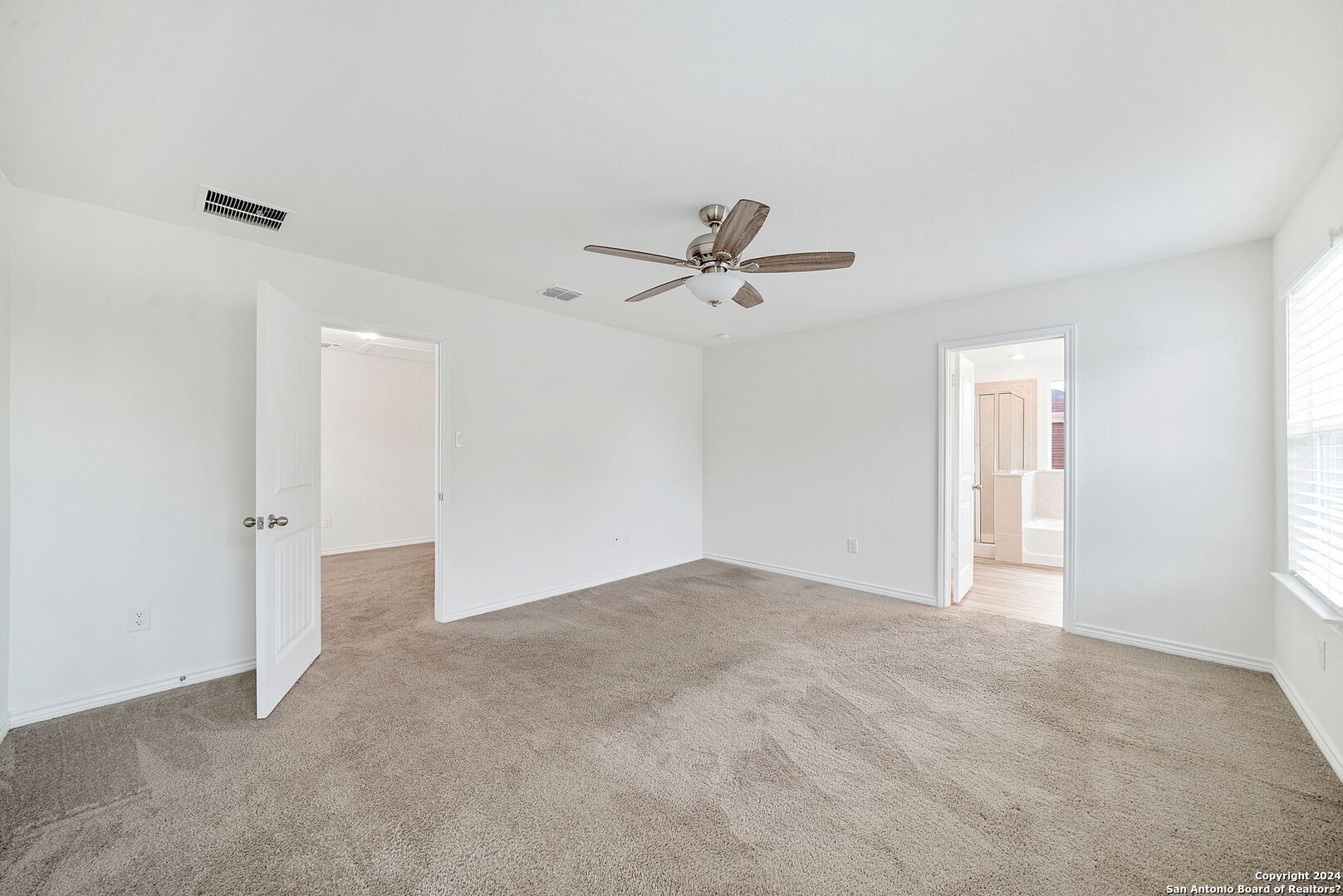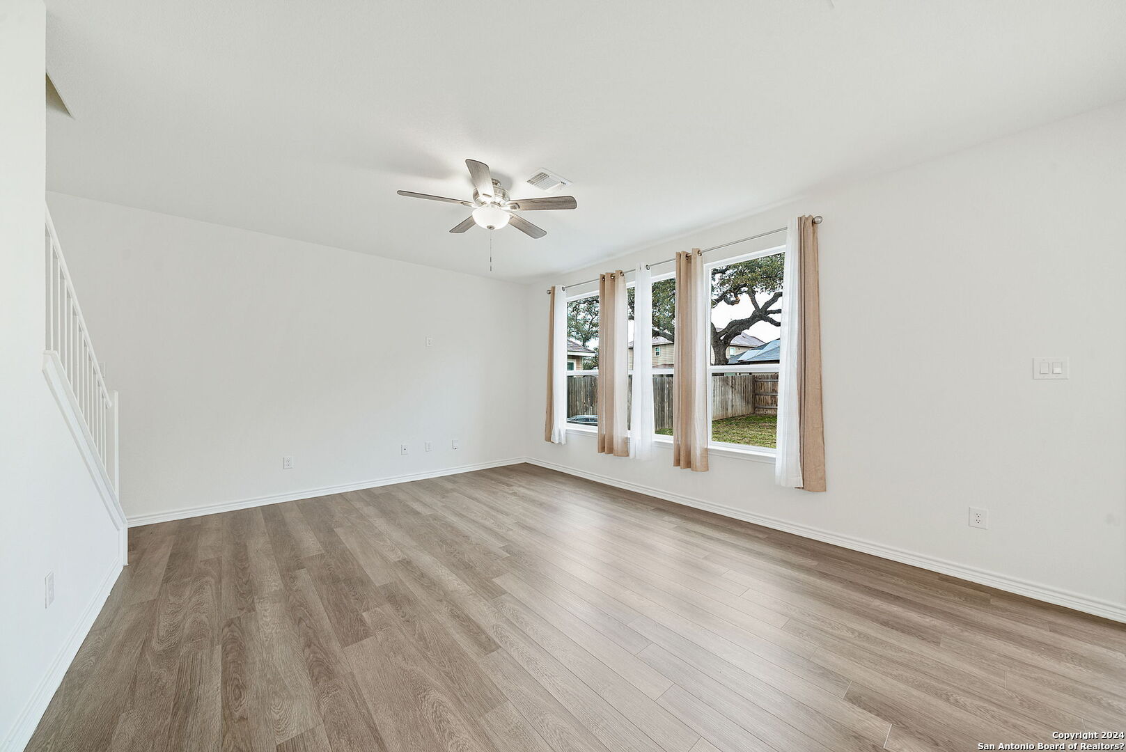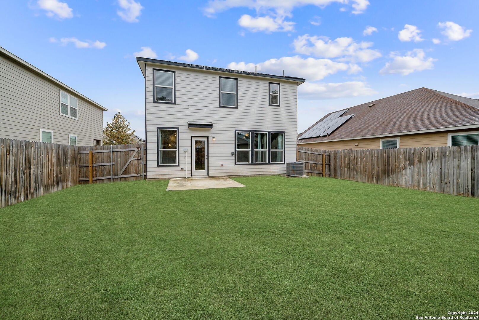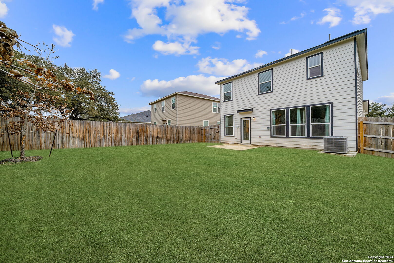 Two-story home located in Falcon Landing featuring 3 bedrooms and 2.5 bathrooms. The spacious living area offers plenty of natural lighting and an open floor plan that flows seamlessly into the kitchen. The kitchen includes granite countertops, stainless steel appliances, and a large island, perfect for cooking and entertaining. All bedrooms are located upstairs along with a small loft area. The primary suite features a ceiling fan and a large walk-in closet. The ensuite bathroom includes dual vanities, a stand-in shower, and a relaxing garden tub. Carpet is located upstairs only. Enjoy the large fenced-in backyard, with quick access to 211 and just minutes from Alamo Ranch.