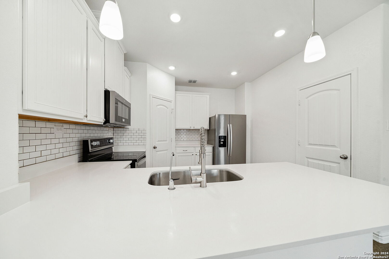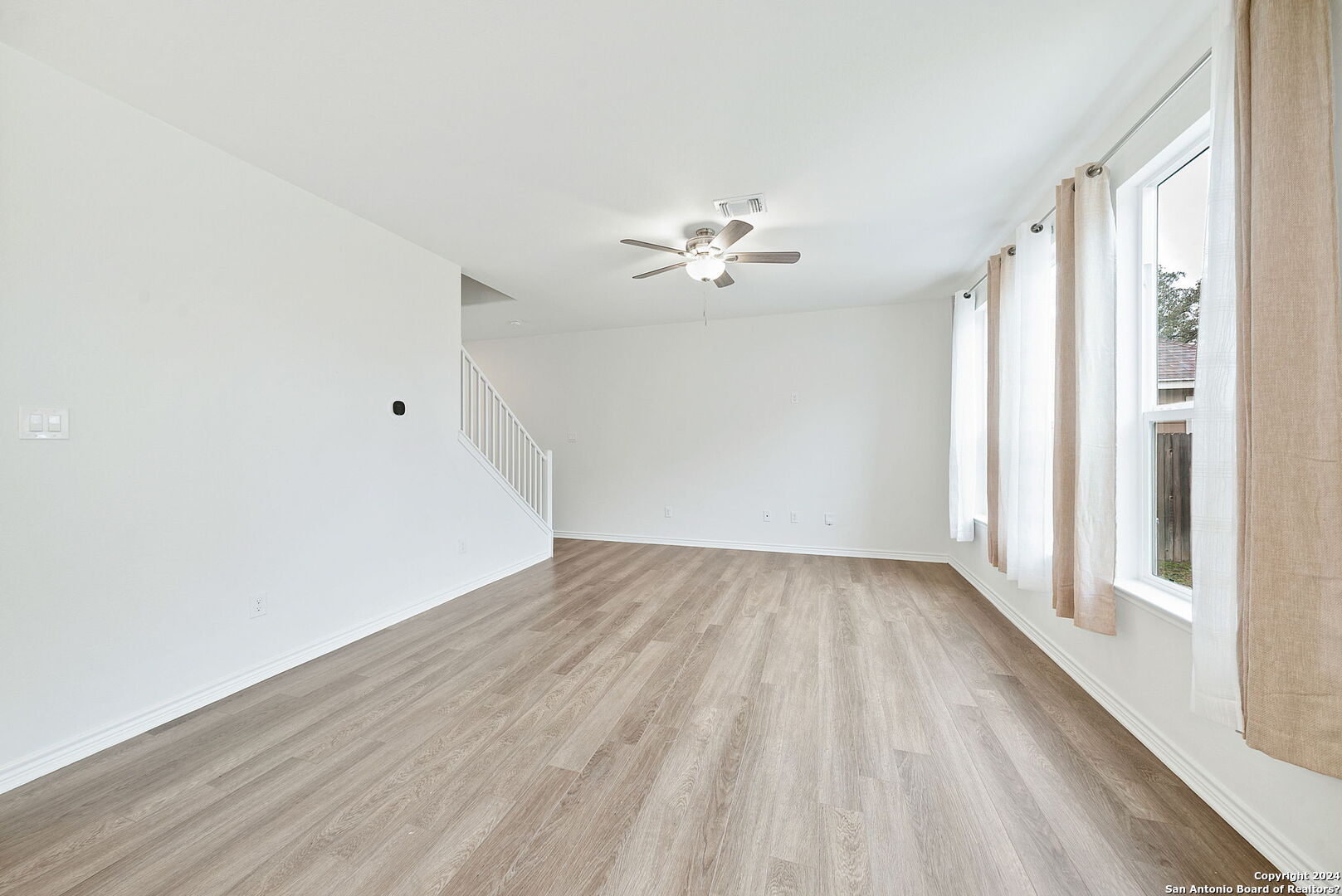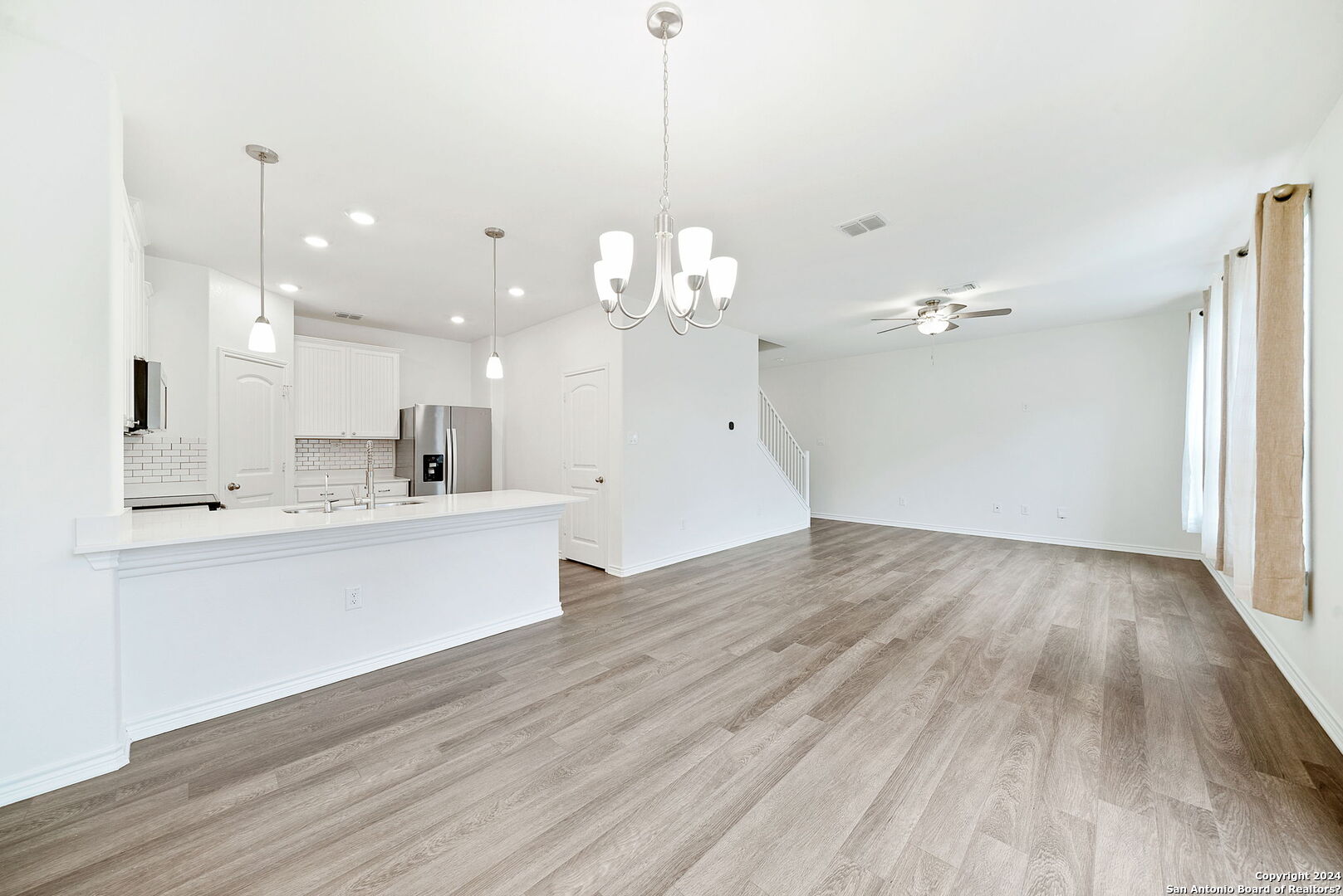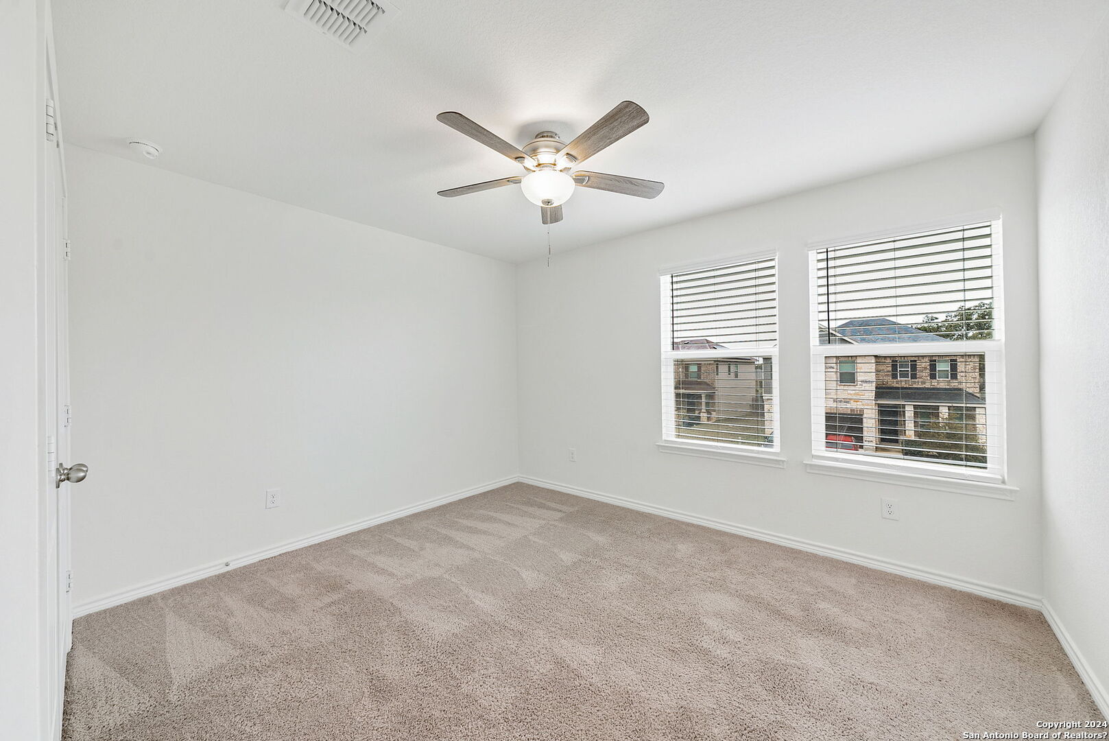 Two-story home located in Falcon Landing featuring 3 bedrooms and 2.5 bathrooms. The spacious living area offers plenty of natural lighting and an open floor plan that flows seamlessly into the kitchen. The kitchen includes granite countertops, stainless steel appliances, and a large island, perfect for cooking and entertaining. All bedrooms are located upstairs along with a small loft area. The primary suite features a ceiling fan and a large walk-in closet. The ensuite bathroom includes dual vanities, a stand-in shower, and a relaxing garden tub. Carpet is located upstairs only. Enjoy the large fenced-in backyard, with quick access to 211 and just minutes from Alamo Ranch.