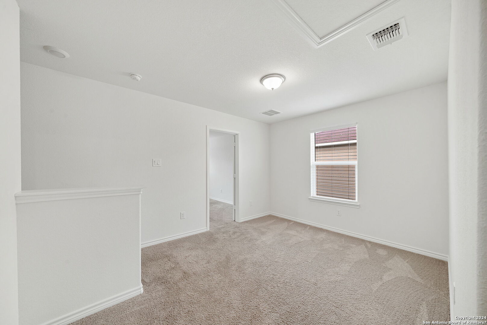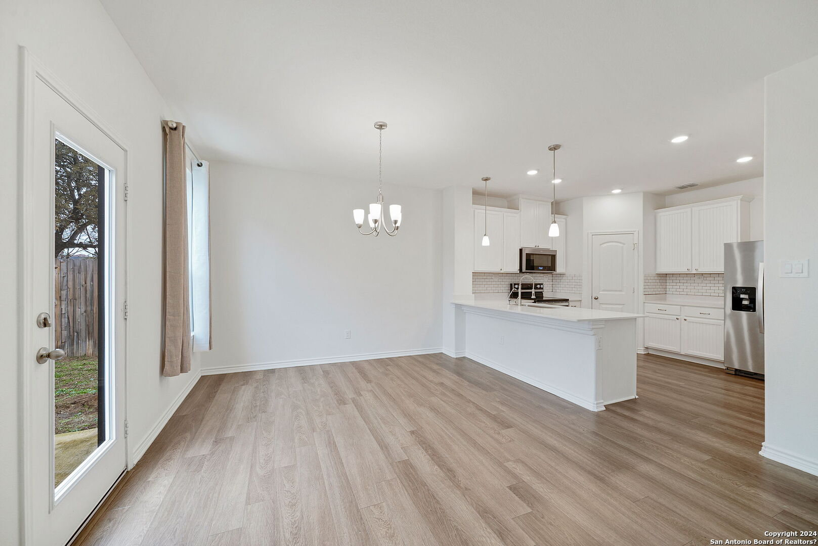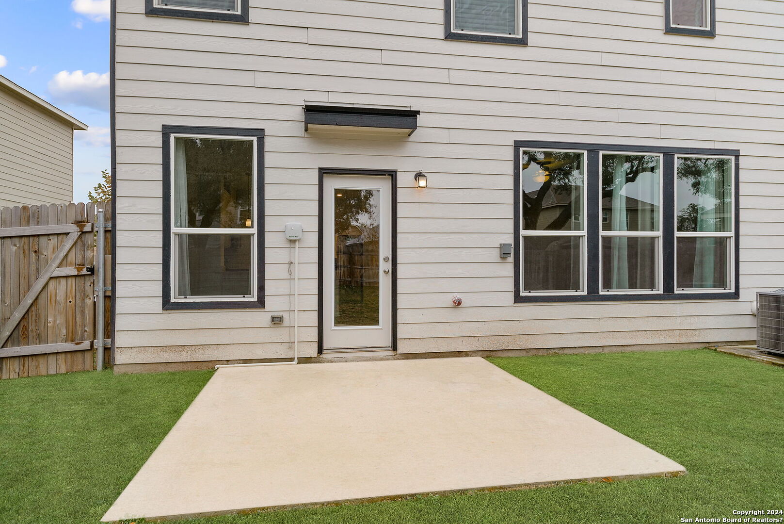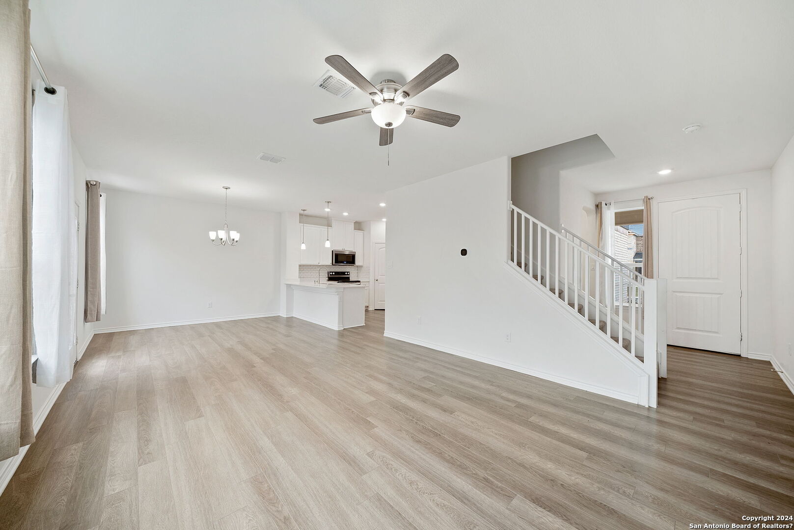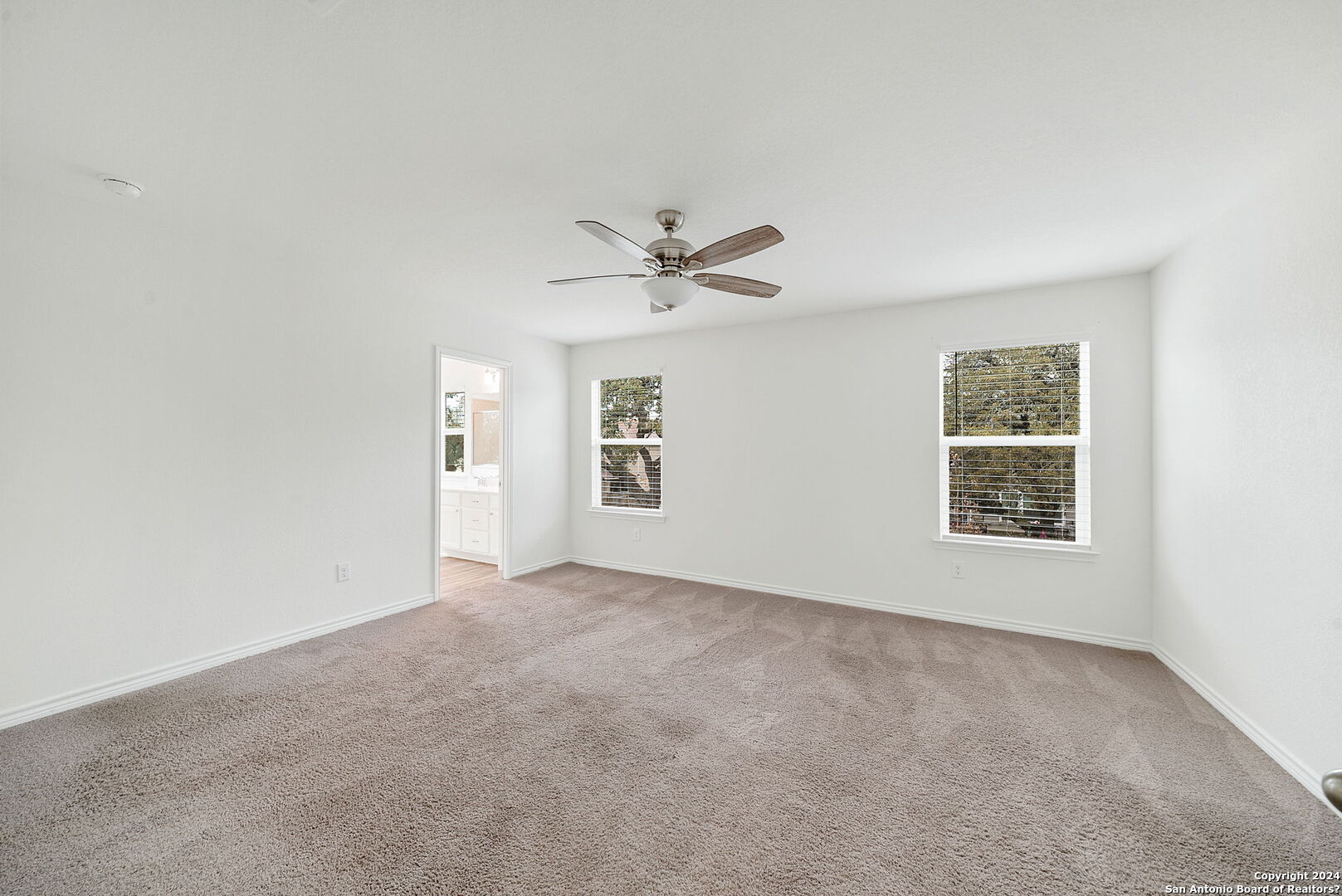 Two-story home located in Falcon Landing featuring 3 bedrooms and 2.5 bathrooms. The spacious living area offers plenty of natural lighting and an open floor plan that flows seamlessly into the kitchen. The kitchen includes granite countertops, stainless steel appliances, and a large island, perfect for cooking and entertaining. All bedrooms are located upstairs along with a small loft area. The primary suite features a ceiling fan and a large walk-in closet. The ensuite bathroom includes dual vanities, a stand-in shower, and a relaxing garden tub. Carpet is located upstairs only. Enjoy the large fenced-in backyard, with quick access to 211 and just minutes from Alamo Ranch.
