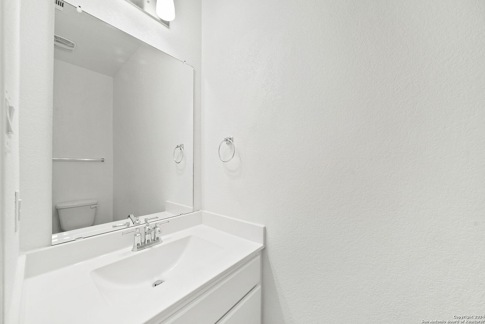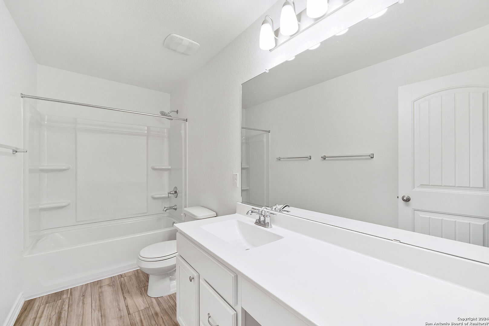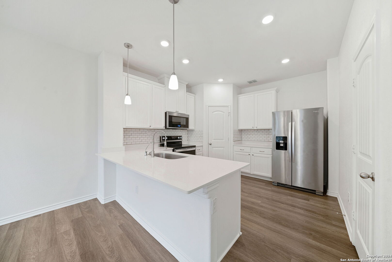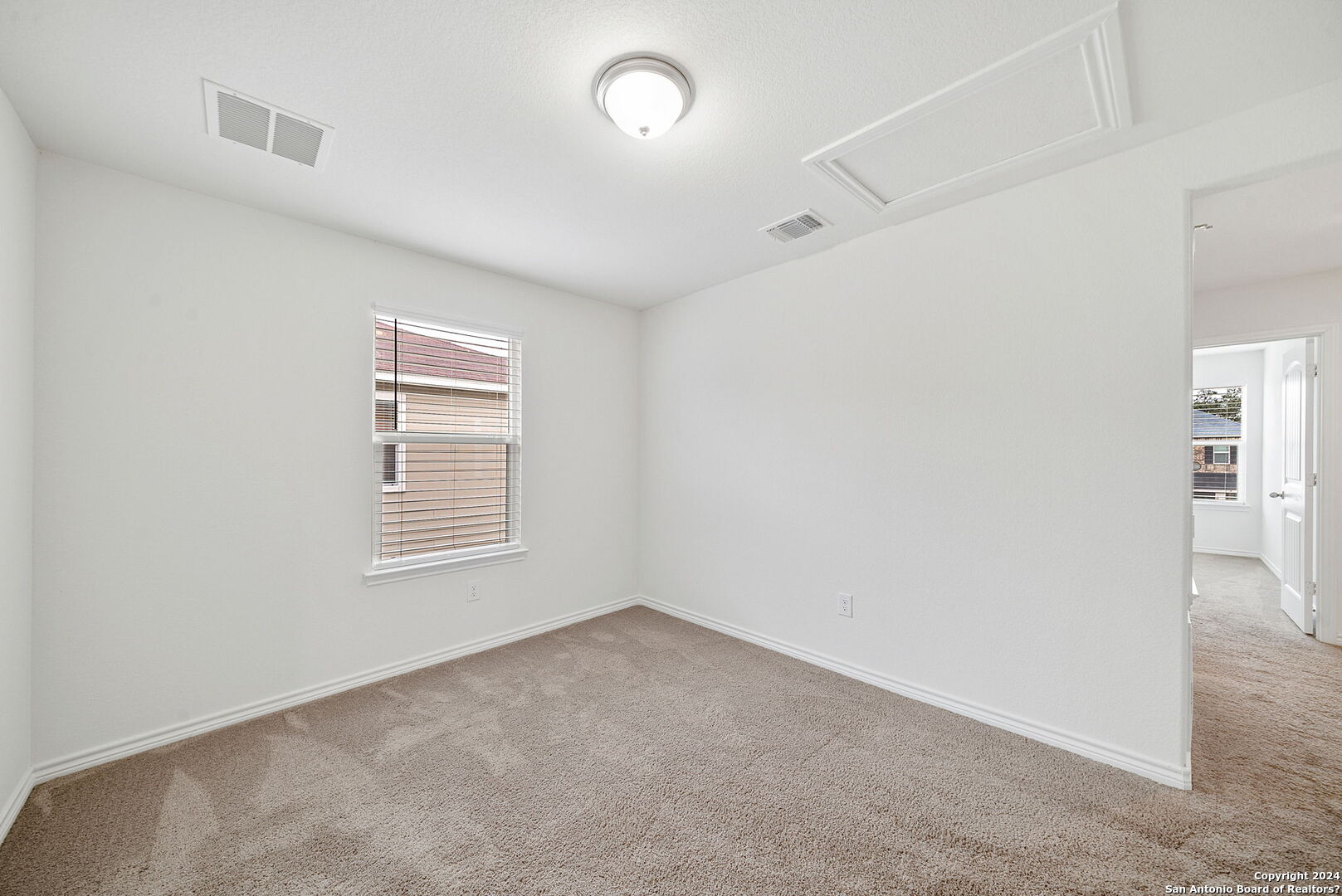 Two-story home located in Falcon Landing featuring 3 bedrooms and 2.5 bathrooms. The spacious living area offers plenty of natural lighting and an open floor plan that flows seamlessly into the kitchen. The kitchen includes granite countertops, stainless steel appliances, and a large island, perfect for cooking and entertaining. All bedrooms are located upstairs along with a small loft area. The primary suite features a ceiling fan and a large walk-in closet. The ensuite bathroom includes dual vanities, a stand-in shower, and a relaxing garden tub. Carpet is located upstairs only. Enjoy the large fenced-in backyard, with quick access to 211 and just minutes from Alamo Ranch.
