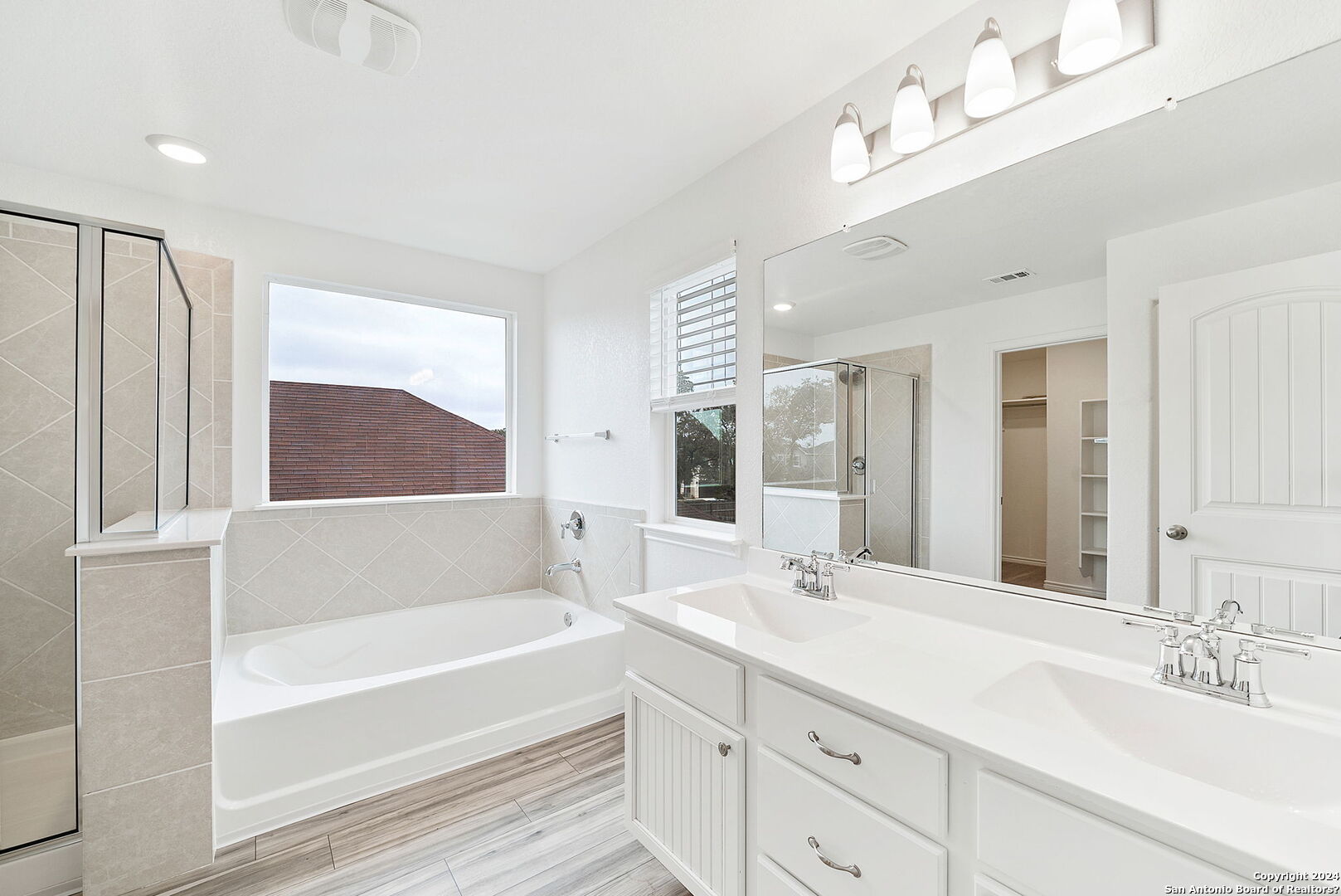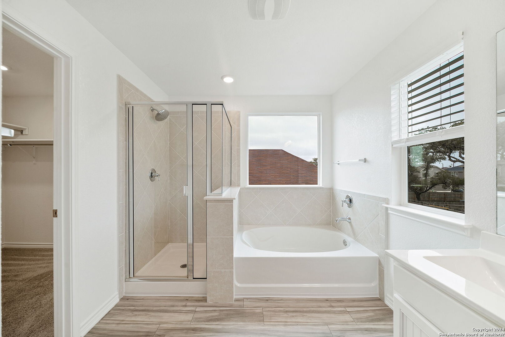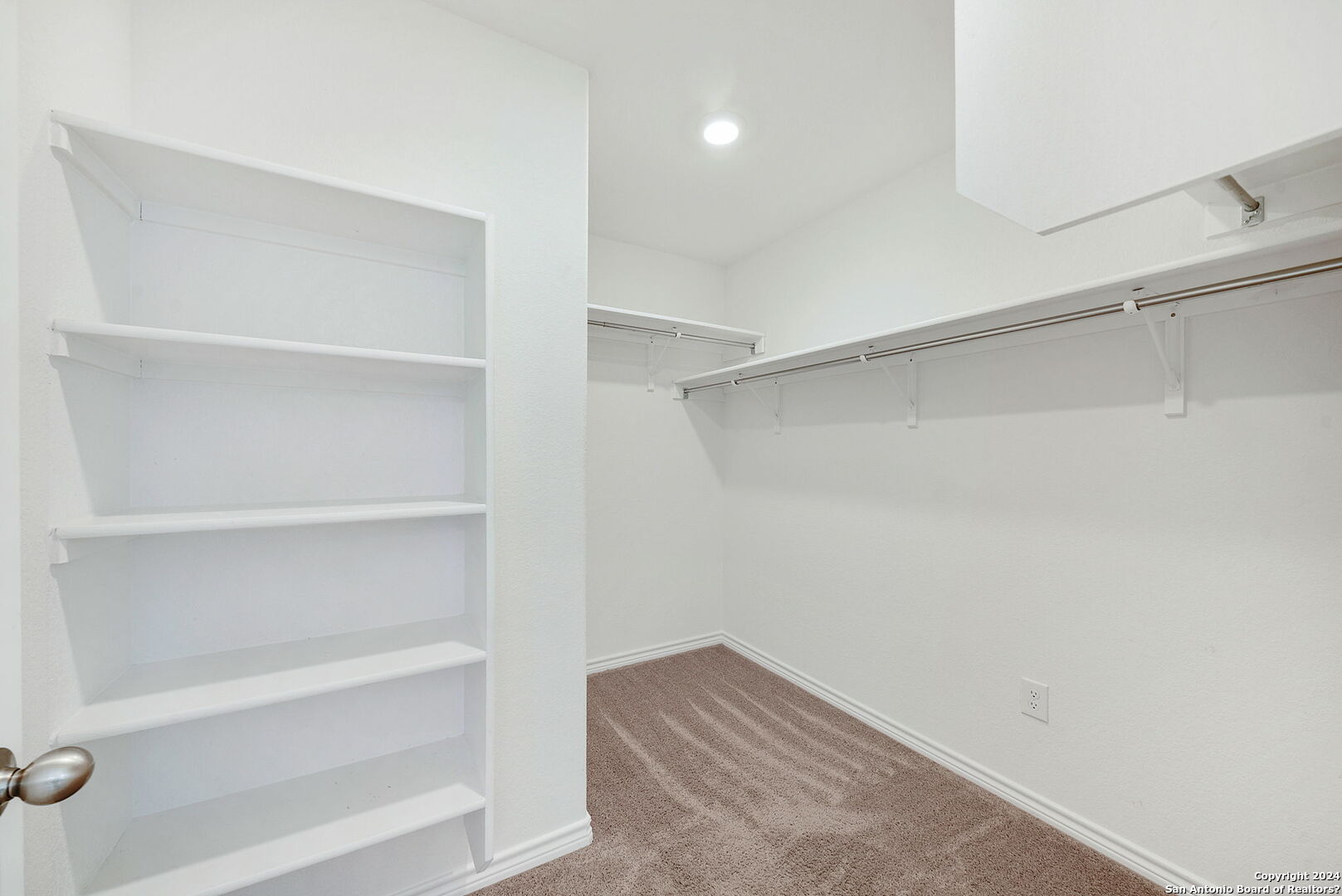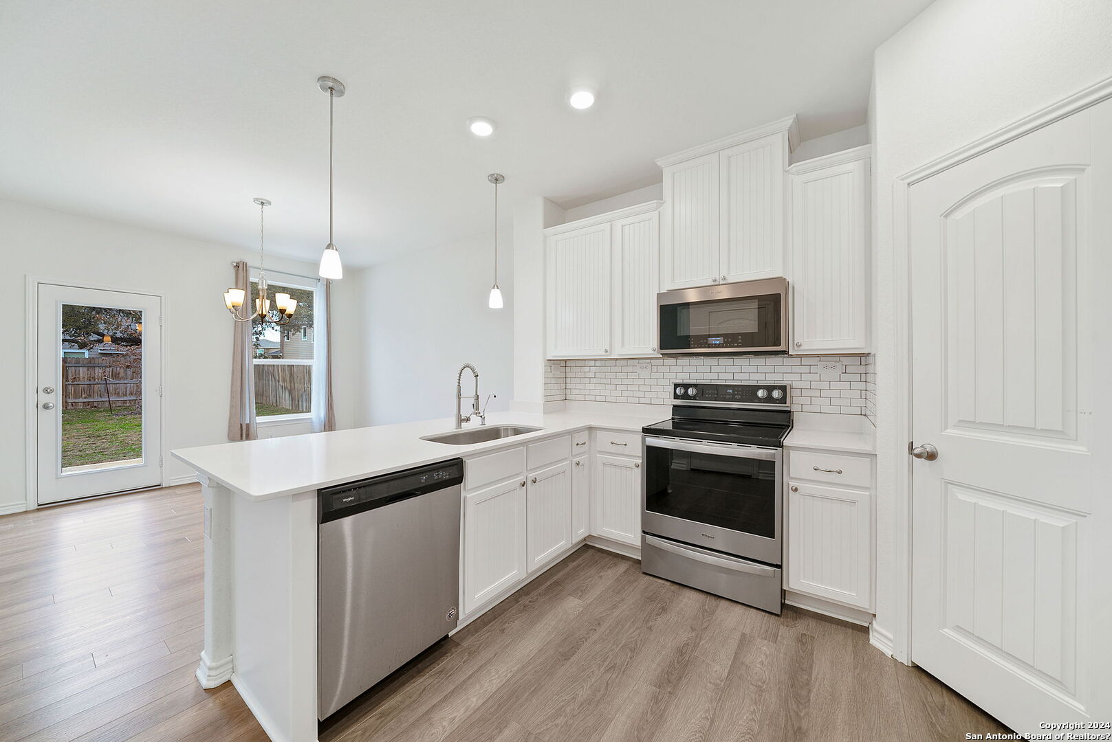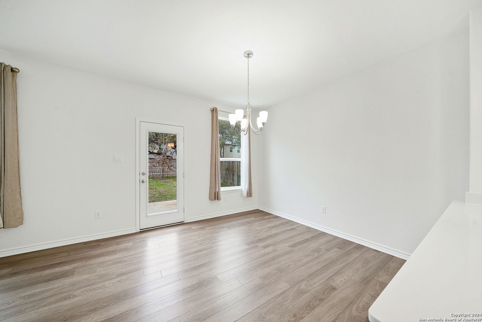 Two-story home located in Falcon Landing featuring 3 bedrooms and 2.5 bathrooms. The spacious living area offers plenty of natural lighting and an open floor plan that flows seamlessly into the kitchen. The kitchen includes granite countertops, stainless steel appliances, and a large island, perfect for cooking and entertaining. All bedrooms are located upstairs along with a small loft area. The primary suite features a ceiling fan and a large walk-in closet. The ensuite bathroom includes dual vanities, a stand-in shower, and a relaxing garden tub. Carpet is located upstairs only. Enjoy the large fenced-in backyard, with quick access to 211 and just minutes from Alamo Ranch.
