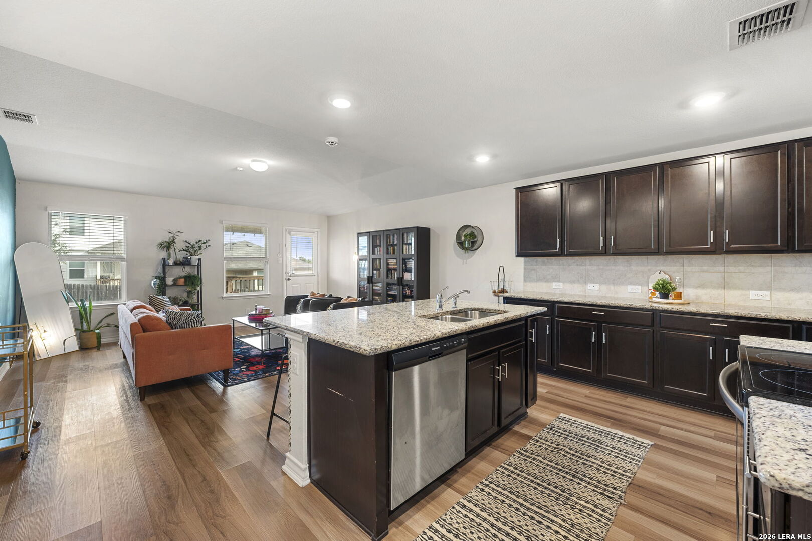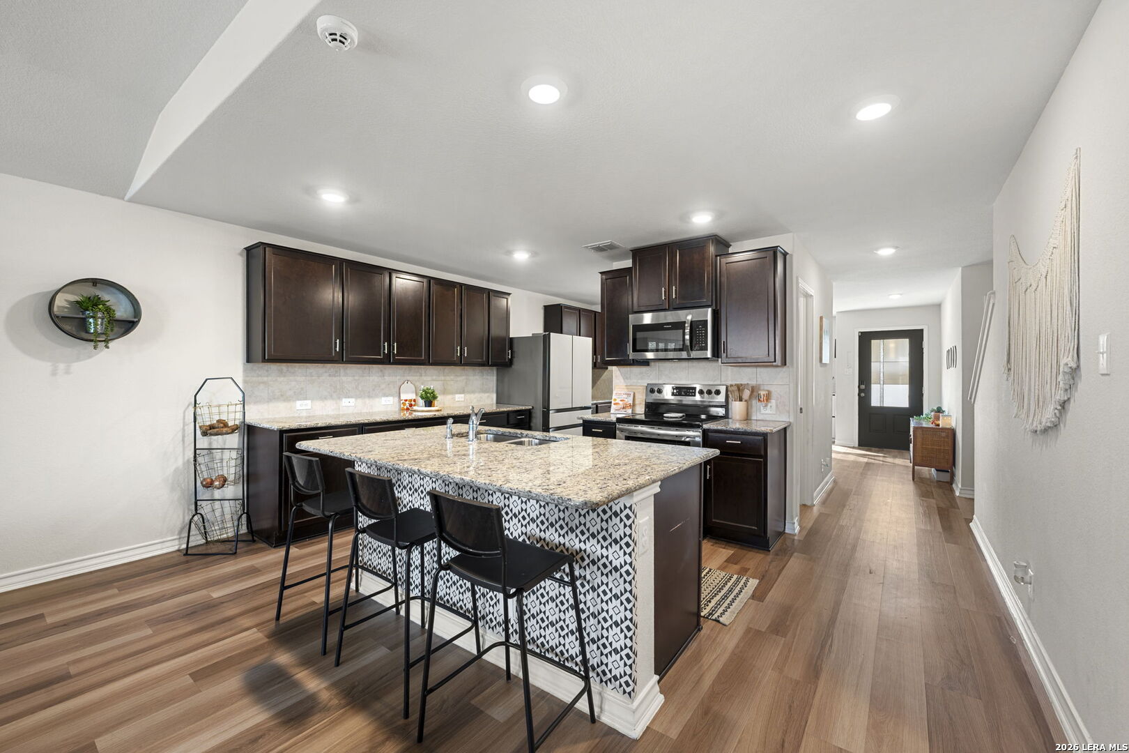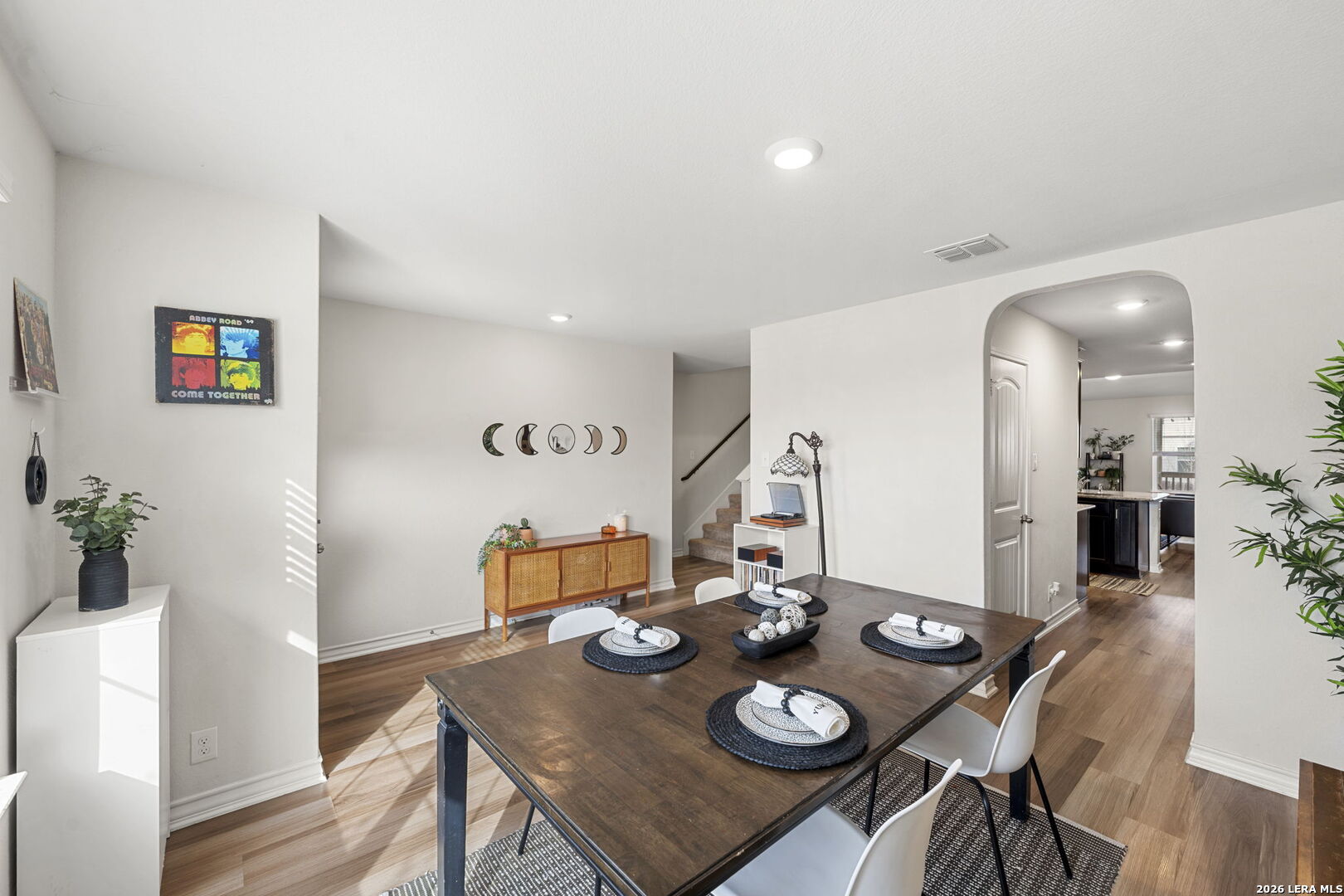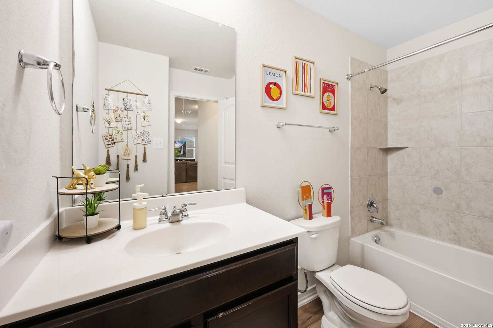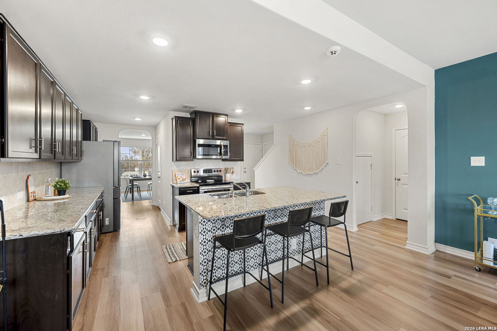 Set on a semi-cul-de-sac with peaceful backyard views, this home offers a setting that truly stands out-enjoy relaxing evenings on the patio and even your own "private fireworks show" on special holiday nights, something you simply don't get with most new construction. The heart of the home is the open concept kitchen featuring granite countertops, stainless steel appliances, abundant prep space, and an island with breakfast bar seating, all opening to the living area and a separate dining space-perfect for everyday living and entertaining. With 5 bedrooms, 2.5 baths, a primary suite downstairs, and a spacious game room upstairs surrounded by nicely sized secondary bedrooms, everyone truly has their own space. The bright primary retreat offers a soaking tub, separate shower, double vanity, and walk-in closet. Just minutes from the elementary school, this home blends space and views all in one beautiful package.