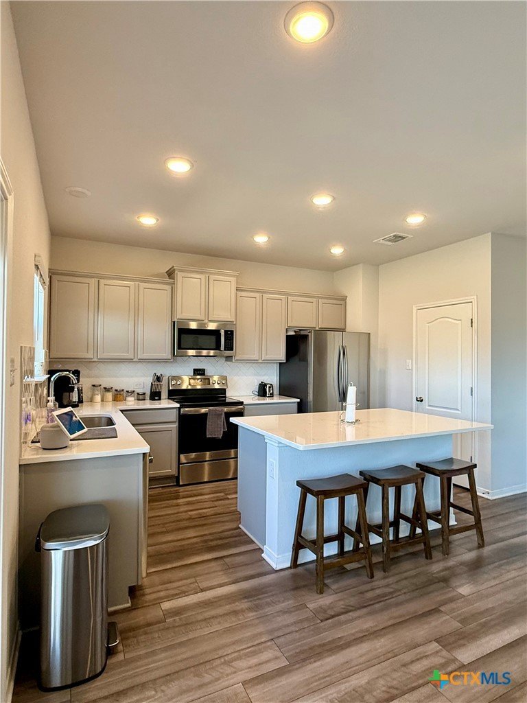 Built in 2022, this home blends modern style with everyday livability and it does it effortlessly. From the moment you step inside, you’ll notice the open layout, natural light, and clean, contemporary finishes that make the space feel both welcoming and functional. The kitchen anchors the main level with a large center island, quartz countertops, stainless steel appliances, electric range, and a walk-in pantry perfect for casual mornings or hosting friends. Wood vinyl flooring carries through the main living areas, keeping the space cohesive and low maintenance. Upstairs offers well sized bedrooms and living space that adapts easily to your lifestyle, whether you need room to work, play, or unwind. Outside, enjoy a spacious, fully fenced oversized backyard with plenty of room for gatherings, play, or future plans. The covered patio creates an ideal spot for grilling, relaxing, or enjoying Texas evenings. Additional features include a smart thermostat, ceiling fans, sprinkler system, and a two car garage. Located in the Hills of Westwood community and zoned to Belton ISD, this home offers the advantages of newer construction without the wait or price. Clean lines, smart design, and space where it matters this one just works.