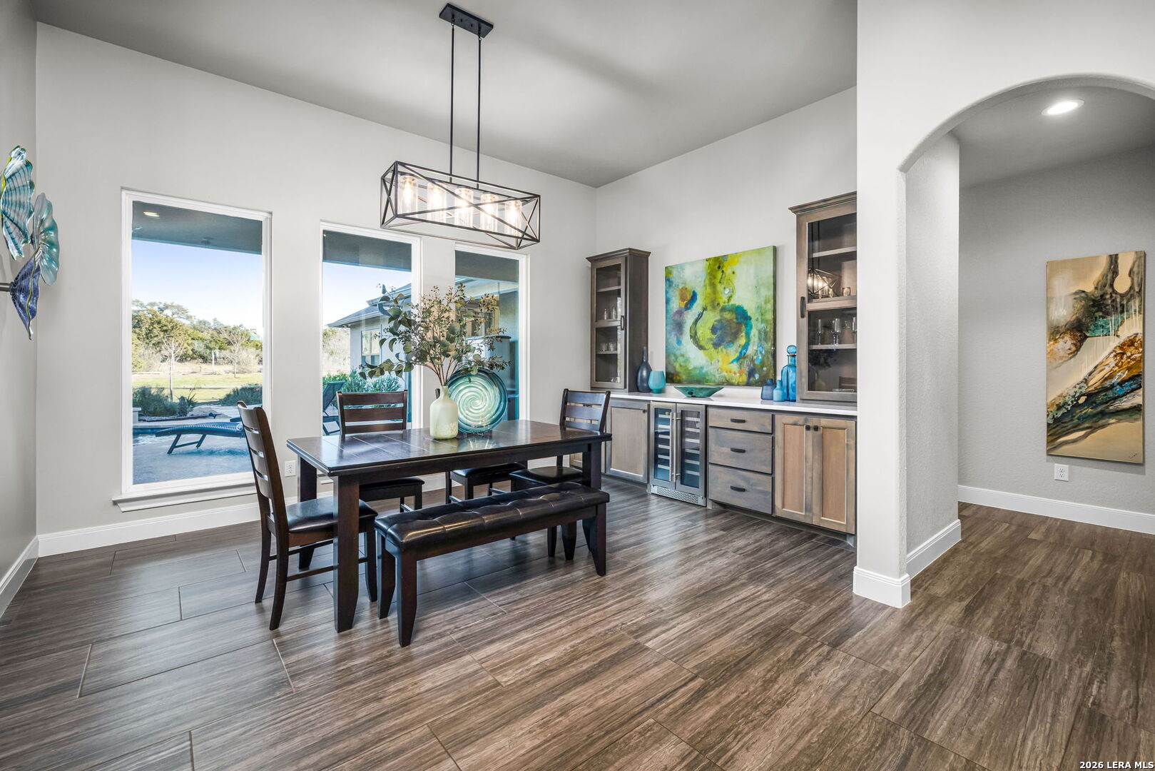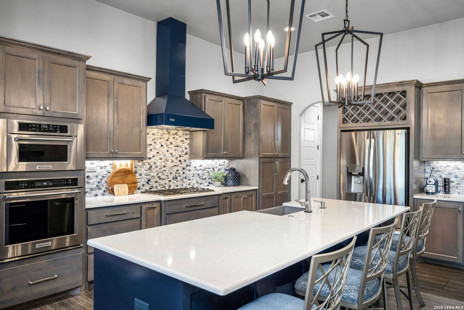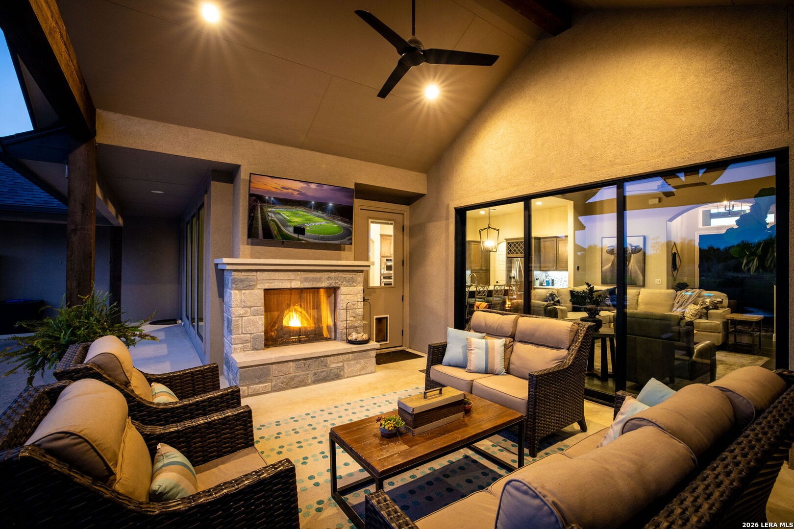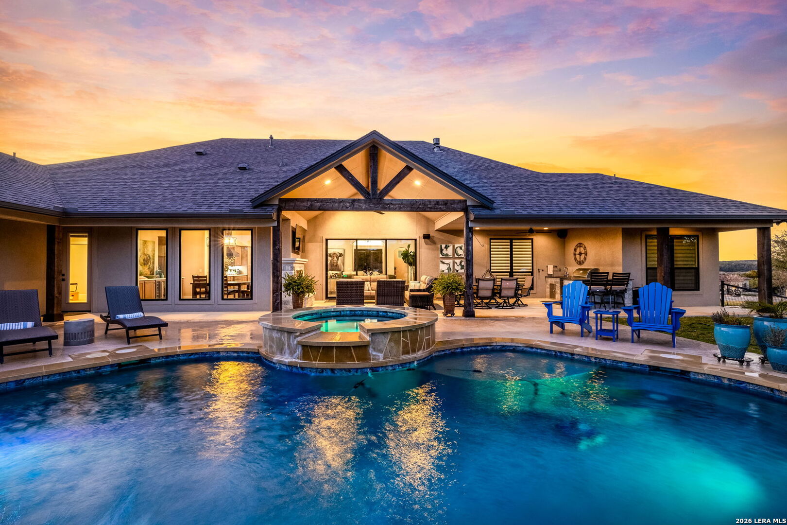 Exquisite Custom 4 Bedroom 3.5 Bath Summit Oak Home in the luxurious Vintage Oaks Community. Spacious Casita featuring Full Kitchen, Bedroom, Bath and Living space. Separate entrance for ultimate privacy, conveniently located steps from the sparkling pool and ideal for guests or multi-generational living. The open-concept layout offers seamless flow between living, dining, and kitchen spaces enhanced by wood accent beams, wall to wall entertainment space, a cozy fireplace, and accordion doors leading to the outdoor living area. The Chef's kitchen boasts massive island bar with seating, quartz countertops, smooth alder custom cabinets, soft close drawers, premium Viking, Bosch, & Thermadore appliances, Native trails composite sink and a spacious walk-in pantry. The adjoining dining room spotlights custom built in sideboard with wine fridge. The private owner's retreat showcases a spa-like bath with floating vanities, under cabinet lighting, quartz, custom built-ins and oversized shower. Just off the Master is your very own flex space which could be used as sitting area, office or gym. Split plan is ideal with 2 other bedrooms and bath. Relax & entertain year around in this ultimate outdoor living space with heated pool and spa, outdoor kitchen and fireplace. Seamless entertainment at its finest! This all sits on a over an acre with 3 car garage, Generac generator, whole house filtration, energy efficiency, and NO City Taxes! This home and community offer it all with resort style amenities and located in the heart of the Hill County.