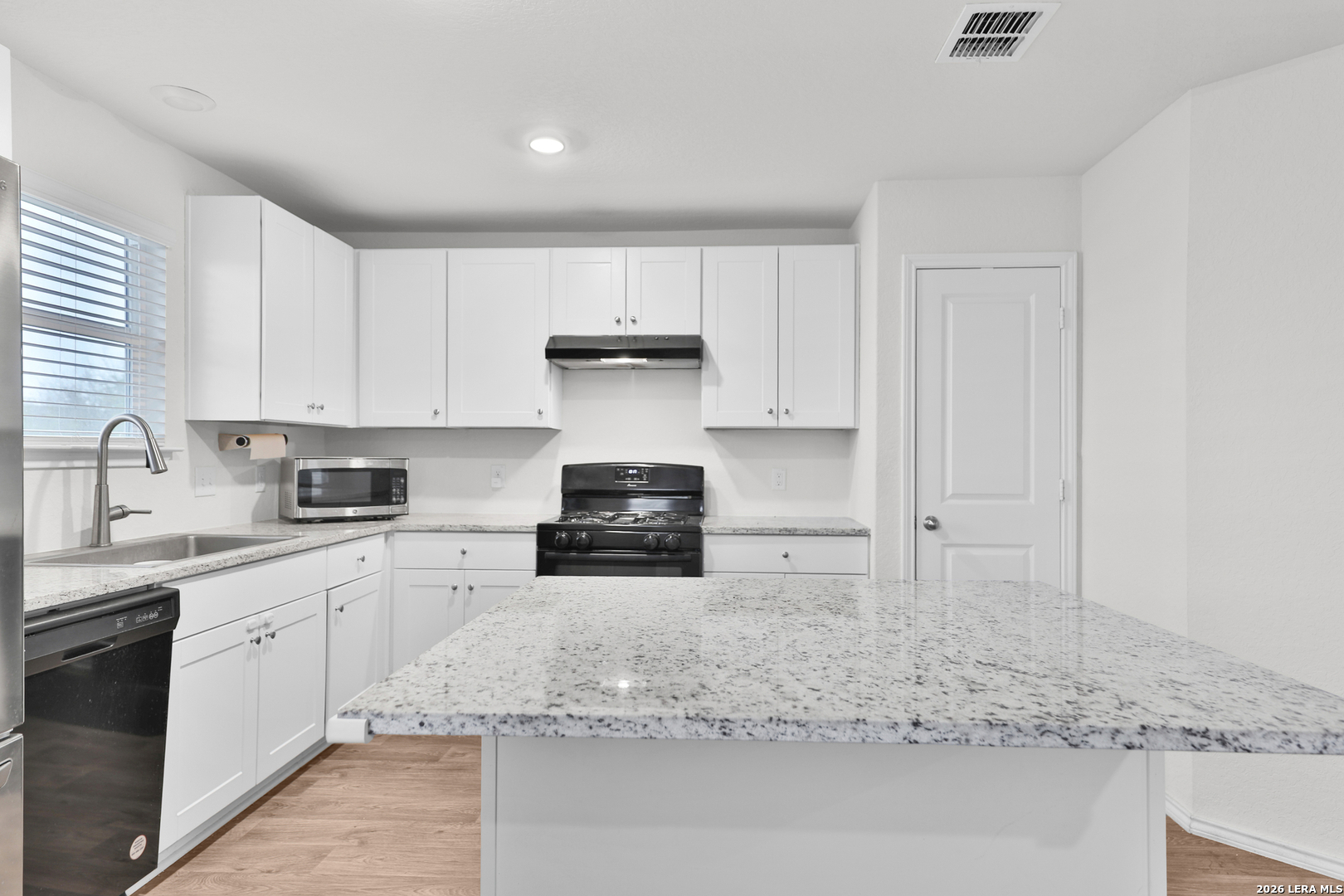 This charming single-story home offers 1,310 sq. ft. of comfortable living space with a well-designed 3 bedroom, 2 bathroom layout. The welcoming entryway leads to a private hall that serves the two secondary bedrooms and a full bath, creating a perfect separation of space. The long foyer opens into a bright, spacious living area with a generous dining space that flows into the kitchen. The kitchen features a large island-ideal for meal prep, casual dining, or gathering with family and friends-along with black appliances and flat-panel maple cabinets. The primary suite is tucked just off the foyer and includes a relaxing ensuite and a large walk-in closet with built-in shelving. Modern convenience is built in with the Home Is Connected smart-home system, allowing you to control lighting, thermostat, and door locks right from your phone. Additional highlights include durable sheet-vinyl flooring in the entry, main living areas, and wet spaces. This well thought out floor plan offers comfort, efficiency, and easy everyday living.