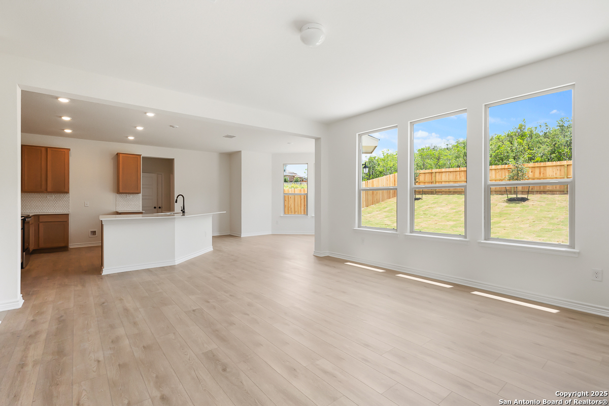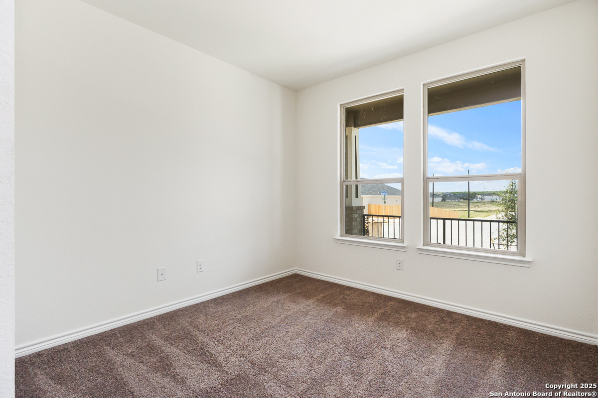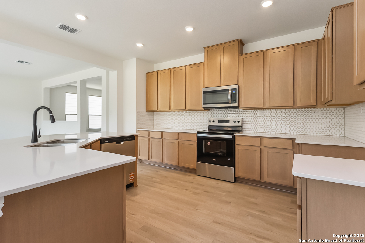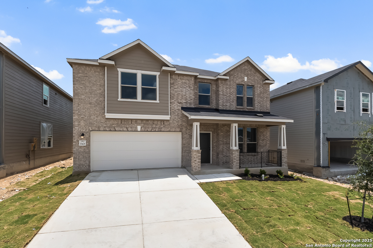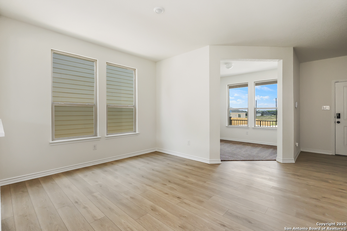 This beautiful home features 9-ft. first-floor ceilings and a versatile den, perfect for work or relaxation. The stylish kitchen boasts Whirlpool stainless steel appliances, Woodmont Dakota Shaker panel 42-in. upper cabinets, a sleek Daltile tile backsplash, and an extended breakfast bar. The primary bath offers a raised vanity, upgraded cabinets, and a luxurious 42-in. garden tub/shower with a Daltile tile surround. Elegant details include a Carrara-style entry door, Kwikset Polo knob hardware, and durable vinyl plank flooring in the kitchen, bathrooms, and family room. Additional highlights include a wireless security system and an automatic sprinkler system for easy outdoor maintenance.