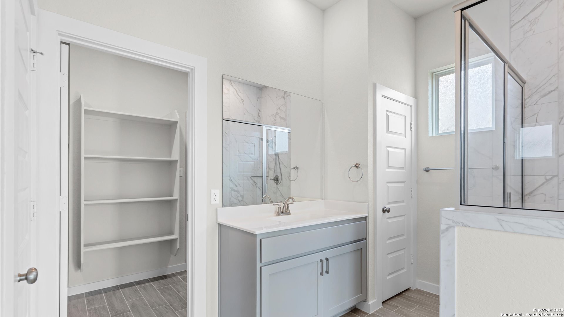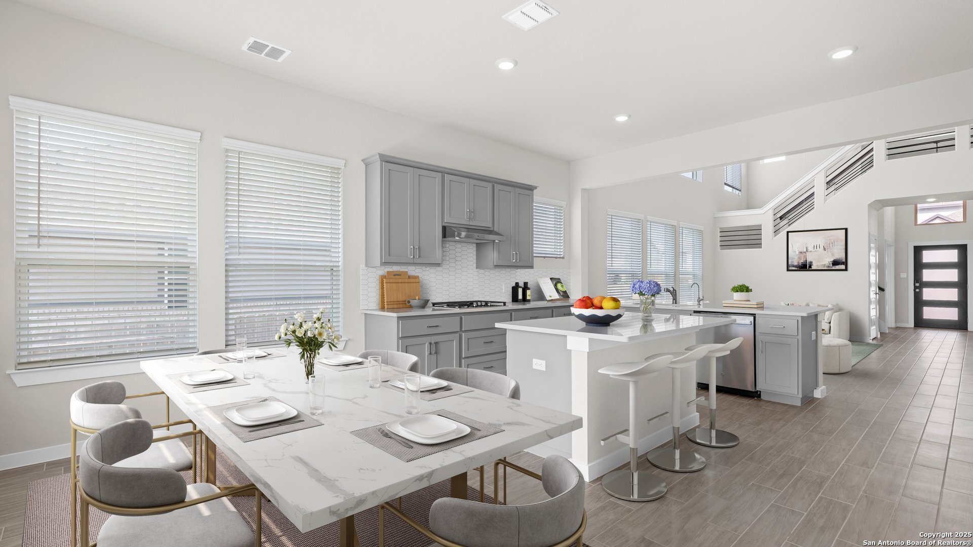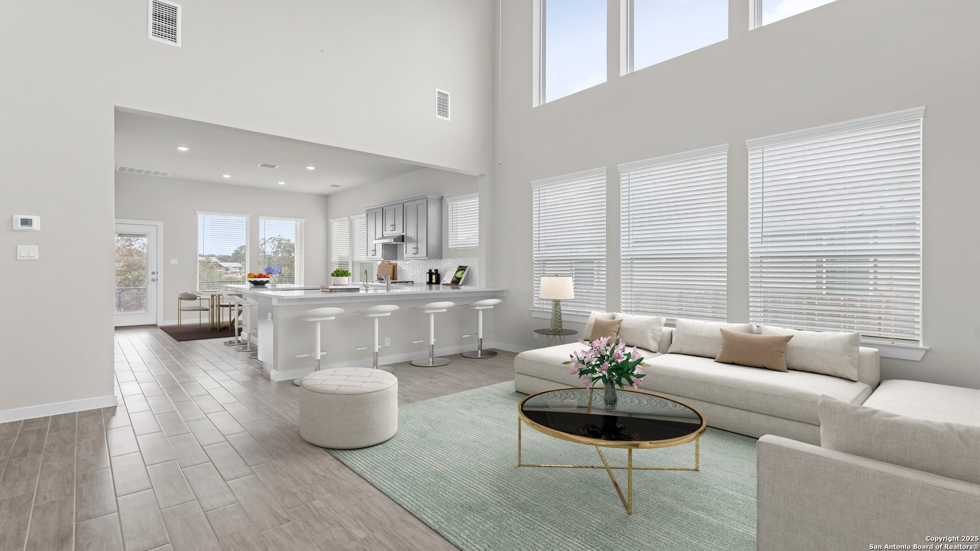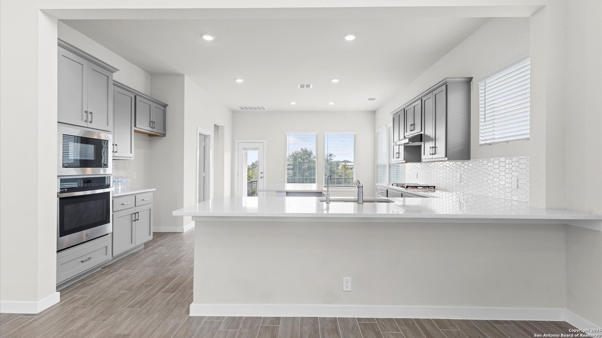 If Home Sweet Home is a combination between Hill Country Views and Modern Living-I've got the home for you! Come admire this stunning 4-bedroom, 3-bathroom home that perfectly blends comfort, style, and functionality. Designed with both family and guests in mind, this thoughtful floor plan features the primary suite and an additional bedroom on the main level - ideal for multigenerational living or a private guest retreat. Step inside to an impressive foyer with soaring high ceilings that flow into the open concept living area, anchored by a sleek electric fireplace and large windows that flood the home with natural light. The gourmet kitchen shines with modern cabinetry, built-in appliances, and elegant countertops - a dream space for both everyday meals and entertaining. Upstairs, you'll find a spacious loft/game room, offering the perfect flex space for movie nights, playtime, or a cozy second living area. Out back, enjoy no rear neighbors, a private backyard, and breathtaking hill country scenery - you can even spot the community pool and amenity center in the distance. The oversized 2.5-car garage (20x30) offers ample room for parking, storage, or a workshop. Located in the sought-after Meyer Ranch community, residents enjoy top-tier amenities including a clubhouse, splash pool, walking trails, firepit, and picnic areas - all surrounded by the beauty of the Texas Hill Country.