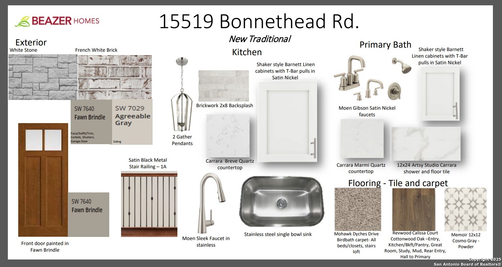 Welcome to 15519 Bonnethead Road, a beautiful residential home located in the heart of San Antonio built by Beazer Homes. This stunning home features 4 beds and 3.5 baths, offering ample space for comfortable living. The 2,420 sq ft layout includes a spacious living room, an open-concept modern kitchen, and a cozy dining area. The primary suite boasts a walk-in closet, while the additional bedrooms provide plenty of room for family or guests. Step outside to enjoy the covered patio, perfect for entertaining or relaxing. Additional highlights include a fully landscaped yard and a 2-car Garage. Located in the desirable Hunter's Ranch, this home is close to schools and eateries, making it an ideal choice for those seeking convenience and comfort. Beazer Homes is proud to be America's #1 Energy-Efficient homebuilder. In 2024, our homes achieved an average net HERS score of 37 (including solar) and a gross HERS score of 42-the lowest publicly reported scores among the top 30 U.S. homebuilders identified by Builder Magazine's Top 100 list (ranked by 2024 closings). Take advantage of our special buyer incentives which may include closing costs, design studio upgrades, FLEX dollars, and more. Reach out today to learn more about how you can benefit from these exclusive offers. Pictures may be for illustrative purposes only.