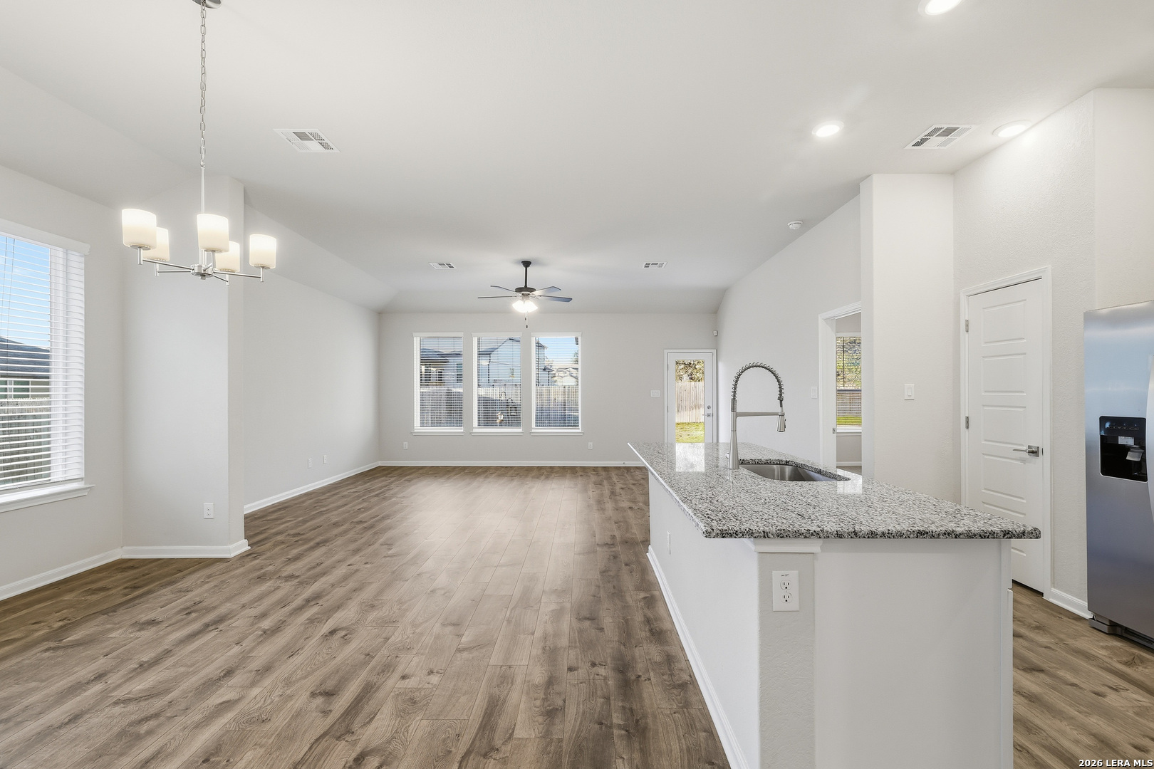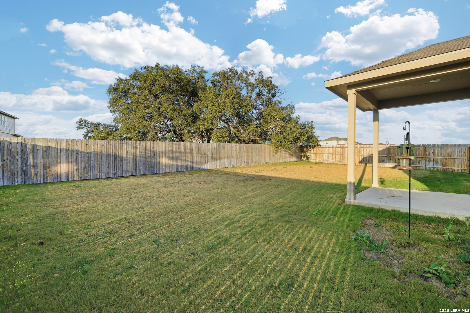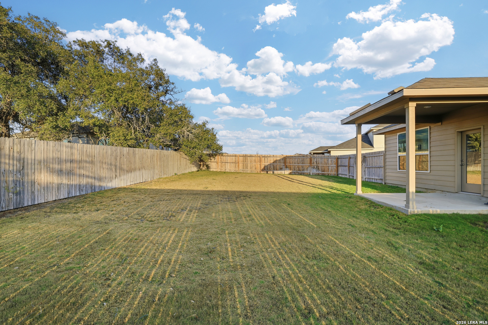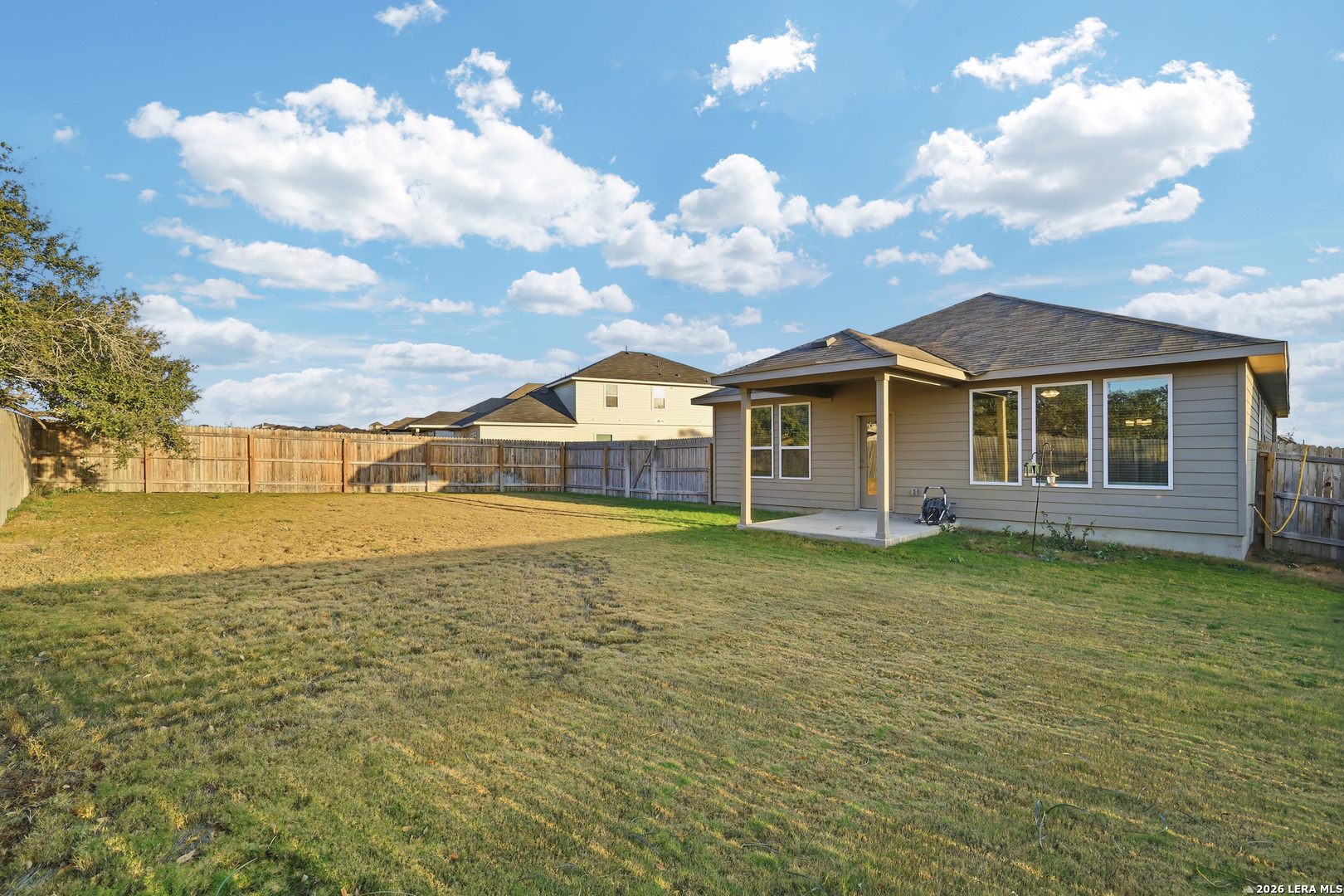Single-story residence located in the highly desirable and rapidly growing Hunters Ranch subdivision. Step inside to soaring ceilings and luxury vinyl flooring throughout the main living areas, creating a bright and modern atmosphere. The thoughtful layout places two secondary bedrooms at the front of the home, with the private primary suite tucked away at the back for added separation. The kitchen is a true highlight, opening seamlessly to the living and dining areas and featuring a refrigerator, gas range, and a spacious center island with bar-style seating. All major appliances are included, including a washer and dryer, and the home's renowned energy efficiency helps keep utility costs low. Outside, enjoy one of the largest backyards in the neighborhood from the covered patio-ideal for relaxing or entertaining. With generous outdoor space and a move-in ready interior, this exceptional home is ready to welcome its next resident.