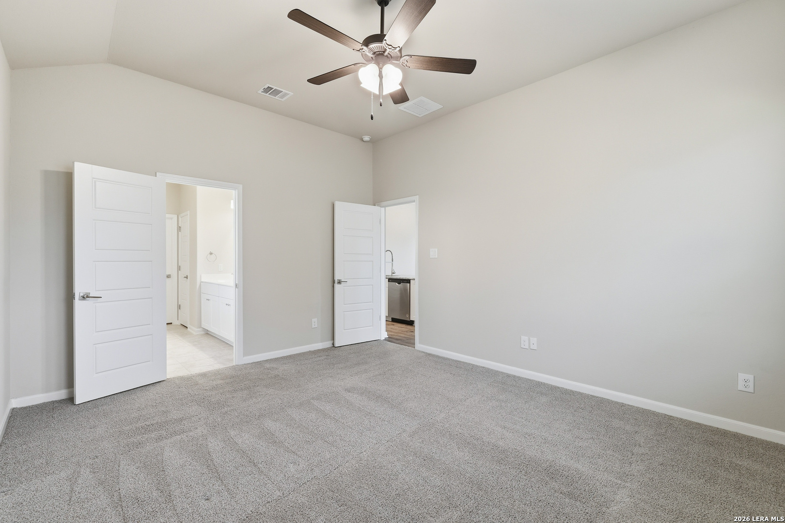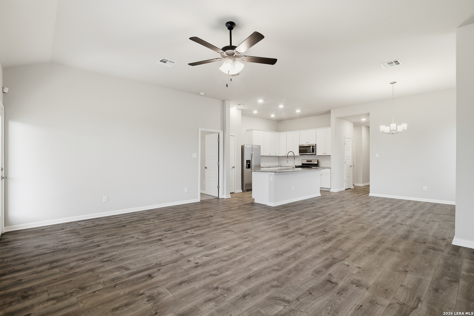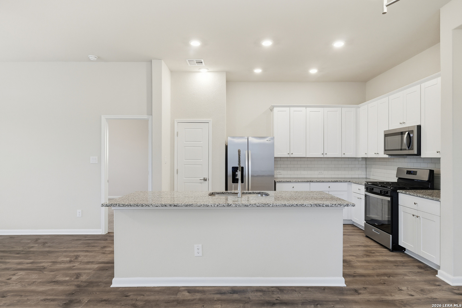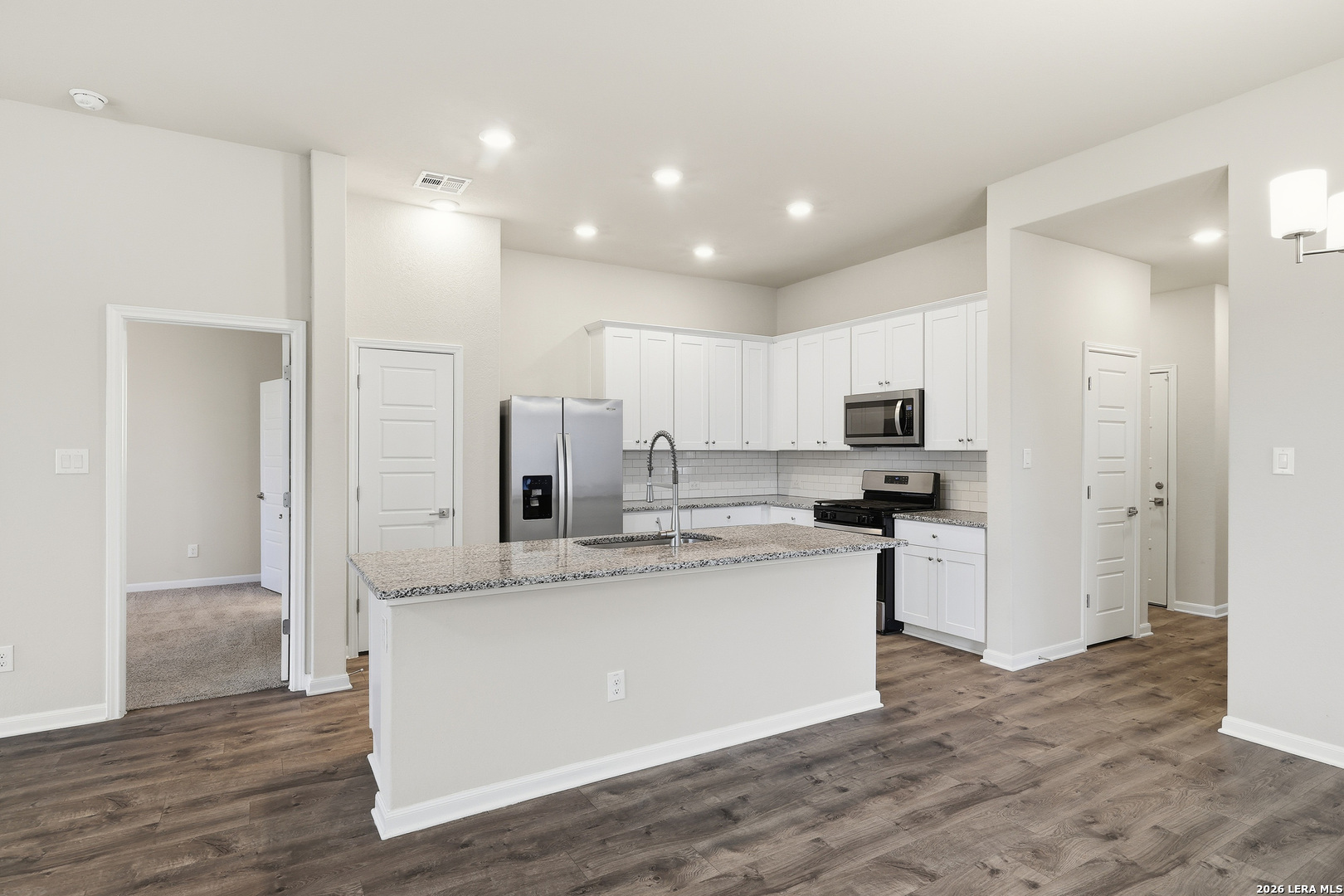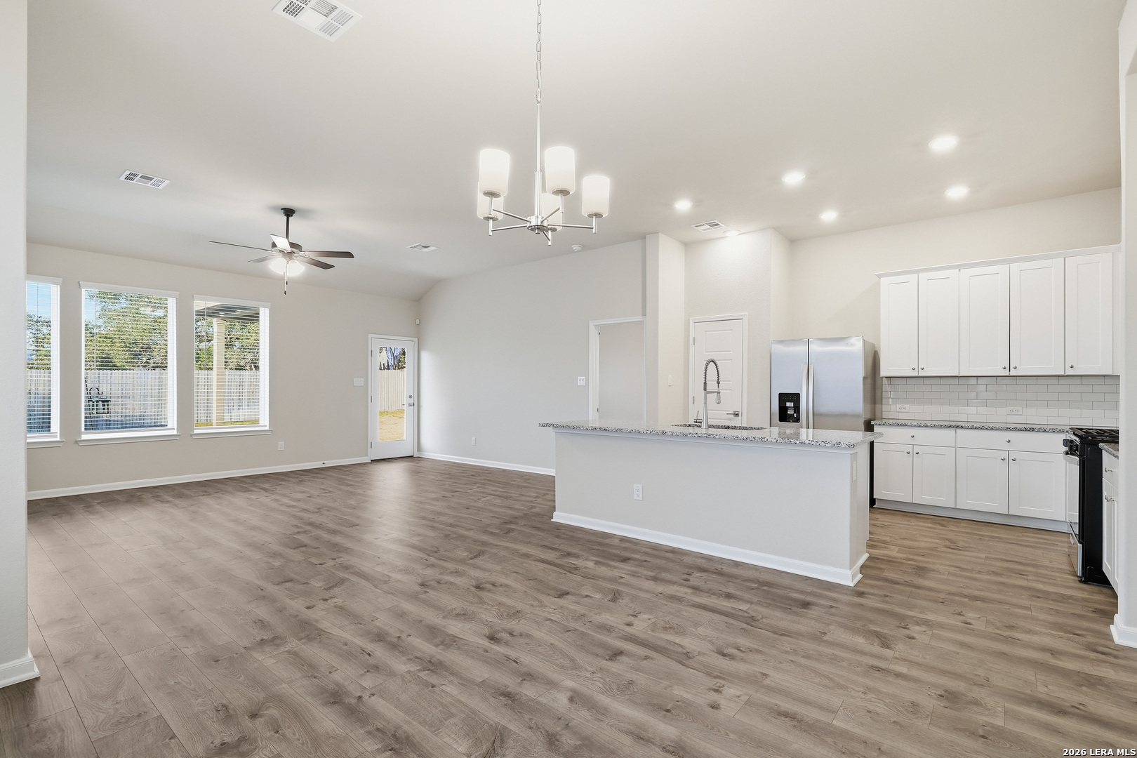 Single-story residence located in the highly desirable and rapidly growing Hunters Ranch subdivision. Step inside to soaring ceilings and luxury vinyl flooring throughout the main living areas, creating a bright and modern atmosphere. The thoughtful layout places two secondary bedrooms at the front of the home, with the private primary suite tucked away at the back for added separation. The kitchen is a true highlight, opening seamlessly to the living and dining areas and featuring a refrigerator, gas range, and a spacious center island with bar-style seating. All major appliances are included, including a washer and dryer, and the home's renowned energy efficiency helps keep utility costs low. Outside, enjoy one of the largest backyards in the neighborhood from the covered patio-ideal for relaxing or entertaining. With generous outdoor space and a move-in ready interior, this exceptional home is ready to welcome its next resident.