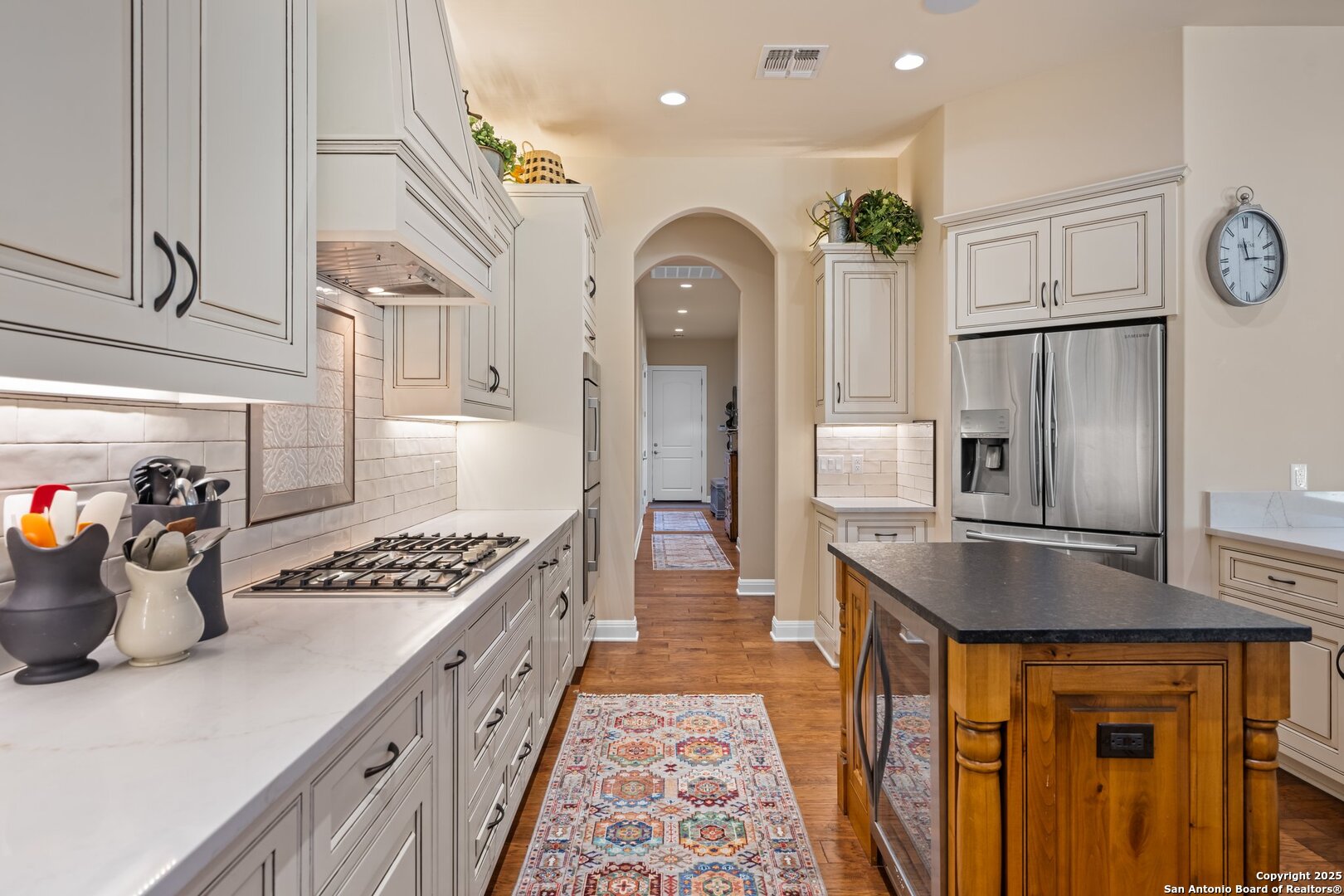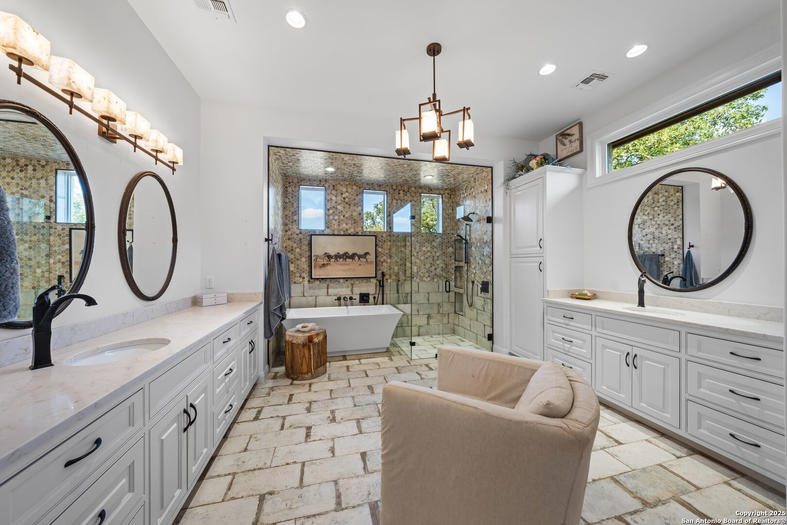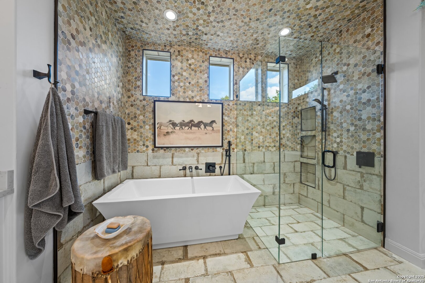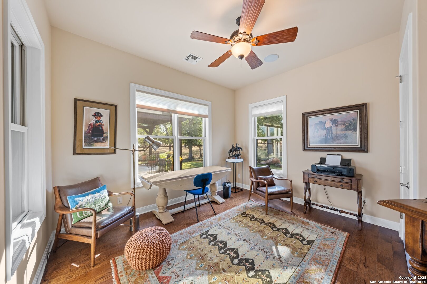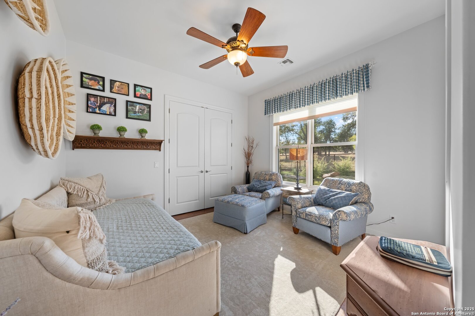 1554 Vintage Oaks Dr is a beautifully improved 30.68-acre horse property just 15 minutes northwest of Fredericksburg. Ideal for equestrian living, the property includes a well-equipped horse barn with four stalls, an outdoor roping arena with water lines for livestock, and rolling terrain with native grasses perfect for grazing. Additional agricultural improvements include a deer-proof garden, two water wells, a rainwater collection system at the barn, and gutter lines from the home routed to the pond for efficient water capture. The custom 3,178 SF home, built by Daniel Jenschke in 2016 and remodeled in 2021, offers 4 bedrooms, 3 bathrooms, a dedicated office (or optional 4th bedroom), a formal dining room, and a warm, open living space with a fireplace. The chef's kitchen features quartzite countertops, custom cabinetry, and hardwood floors. The primary suite includes its own gas fireplace, dual vanities, a soaking tub, walk-in shower, and heated floors. Jack & Jill guest rooms provide comfortable accommodations. Each guest room has its own sink and built in dresser. The optional 4th bedroom or dedicated office is just off the kitchen with a full guest bathroom next to it. Off the kitchen and living room there is an expansive back patio, with an outdoor fireplace which makes entertaining easy. The yard is fully fenced in to keep the deer and wildlife out with pipe fencing to that its sturdy while not taking away from the peaceful views overlooking the pond and grove of trees. Other improvements include an insulated workshop, RV storage, a private gun range, and a scenic mix of Post Oaks, Red Oaks, and Live Oaks with minimal cedar. This turnkey estate is ready for both luxury living and serious horse operations.