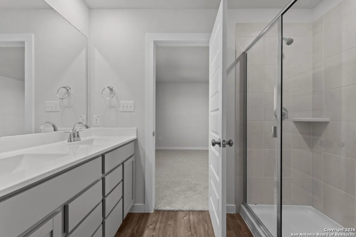 The Rudy at Summerlin is of well-designed living space. The first level features an open-concept great room seamlessly connected to the dining area and kitchen equipped with a corner walk-in pantry and a center island. Additionally, a convenient powder room can be found on the main level. Upstairs, a spacious primary suite's en-suite bathroom offers privacy and functionality with a dual-sink vanity and an expansive walk-in closet. Three secondary bedrooms, also located on the second floor, share a full bathroom. A full laundry room and 2-bay garage complete the space. Additional home highlights and upgrades: 36" gray kitchen cabinets, quartz countertops and backsplash Luxury wood-look vinyl plank flooring in common areas Stainless-steel appliance package with gas range oven Recessed lighting throughout home Cultured marble countertops and modern rectangular sinks in bathrooms Landscape package with full sprinkler system Garage door opener with two remotes Covered patio Exceptional included features, such as our Century Home Connect smart home package and more!
