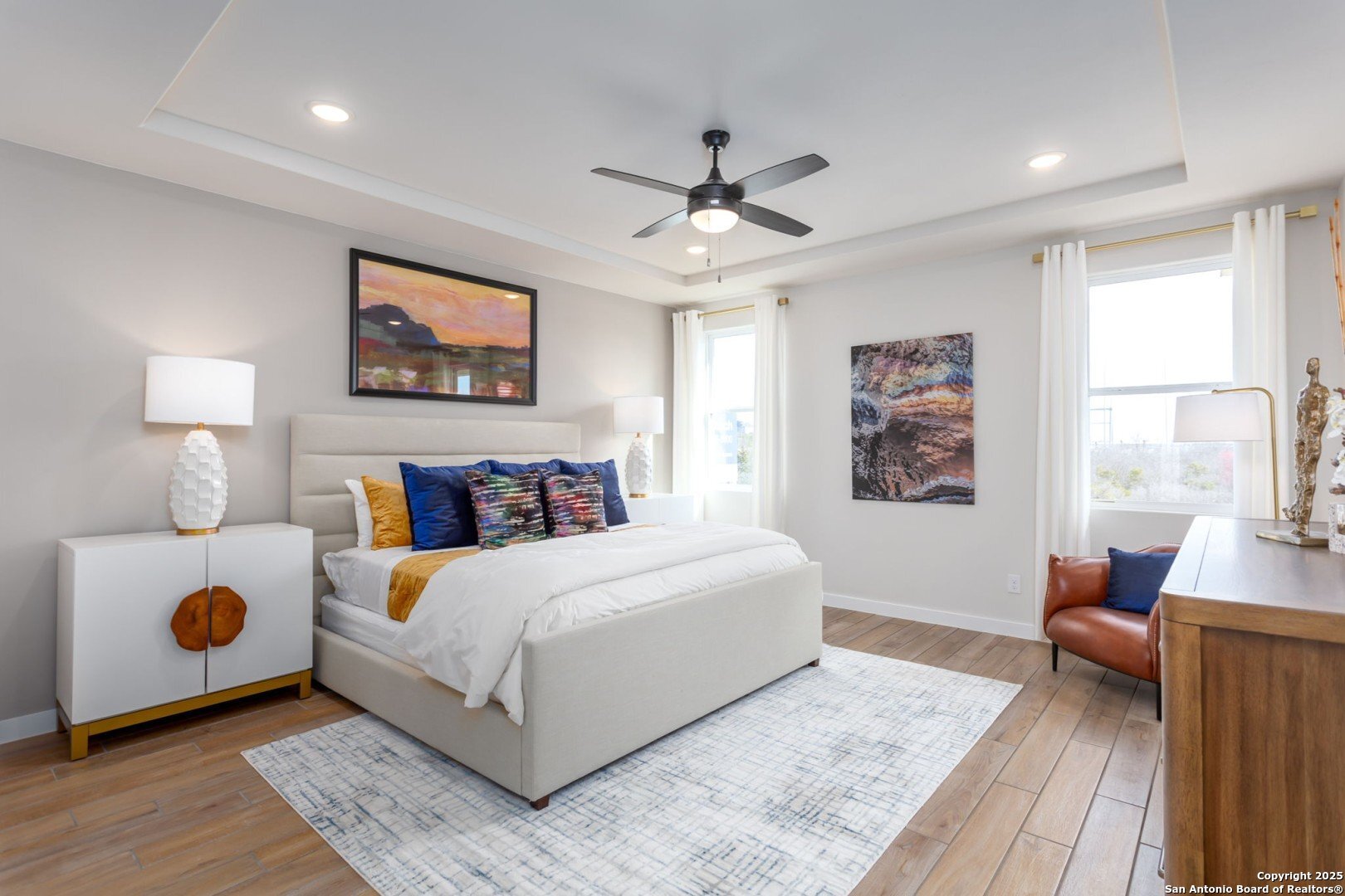 Welcome to the Cloudcroft, a floor plan that thoughtfully combines sophisticated design elements with a functional layout to create an elegantly modern home that's perfectly designed for today's lifestyles. Enter through the front porch and step into the inviting entryway. The inviting foyer draws you past the three secondary bedrooms secluded in the front of the home, offering a comfortable private space for family members or guests. Continuing down the hall will lead you right into the open-concept living area, perfect for both everyday living and entertaining guests. The spacious kitchen features sleek countertops, an large center island, and a corner pantry for maximum space while the adjoining dining room provides the perfect place to gather around a meal. A 10-foot tray ceiling invites you into the Great Room to congregate with family and friends while large windows flood the space with natural light. Tucked away for privacy, the master bedroom serves as a tranquil retreat and includes luxuries like a spa-like ensuite with double vanities, a walk-in shower. and a spacious walk-in closet. Additional features include a covered patio in the backyard, ideal for evening relaxation or weekend barbecues.
