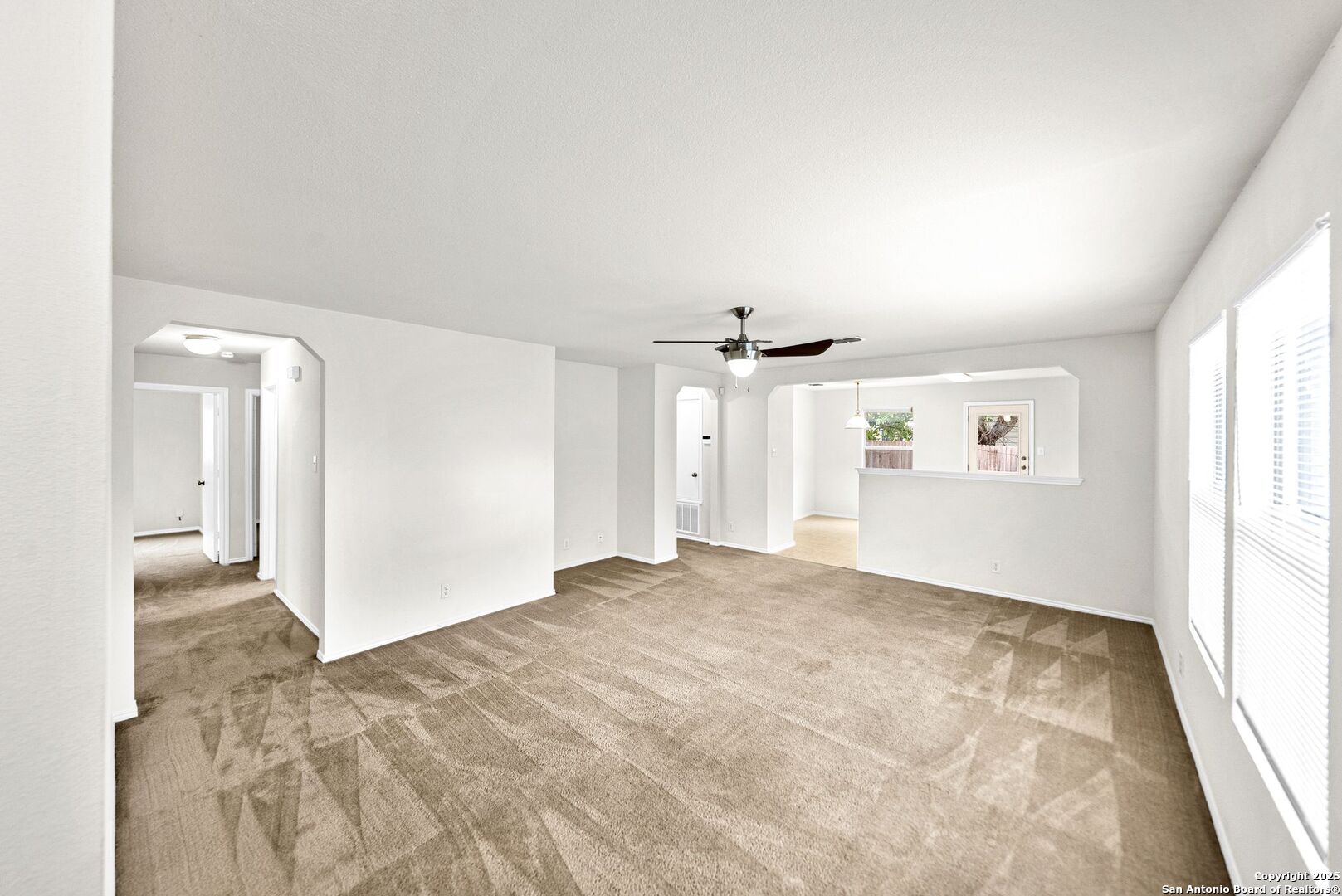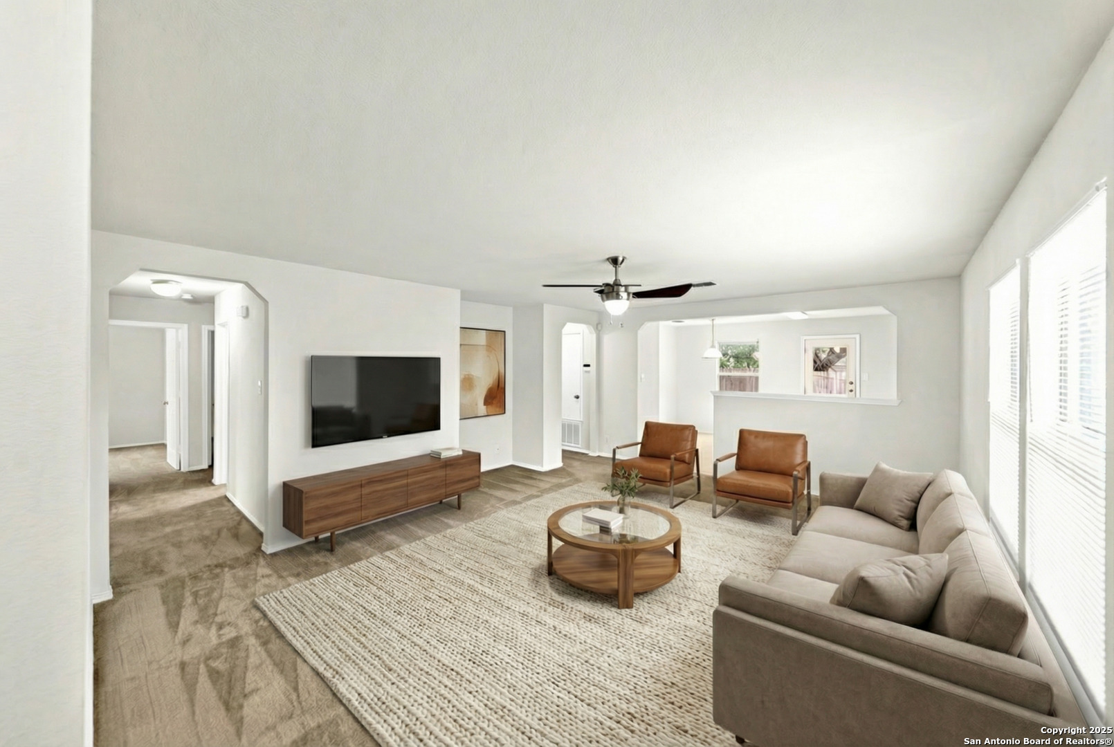 Welcome to a home that instantly feels warm, open, and full of life. This charming four-bedroom, two-bath home was designed for both comfort and connection, blending an open floor plan with spaces that make everyday living effortless. Step inside and you are greeted with bright natural light streaming through large windows, creating a cheerful atmosphere that feels welcoming from the very first moment. The kitchen is the heart of the home, featuring an eat-in dining area and natural wood cabinets that add warmth and timeless appeal. Whether it is a weekday breakfast or a weekend dinner with friends, this space easily becomes the backdrop for good food and better company. The primary suite offers a quiet retreat at the end of the day, complete with a recessed ceiling, a spacious walk-in closet, and a luxurious bathroom featuring both a walk-in shower and a relaxing garden tub. It is easy to imagine ending your evenings here with a soak and a sense of calm. The additional bedrooms are equally inviting, perfect for family, guests, or a home office. Ceiling fans throughout add both comfort and efficiency, while the open floor plan creates a natural flow between rooms, making the home feel larger and brighter. Step outside and you will find yourself in a community that offers more than just beautiful homes. Enjoy the pool on hot summer days, take evening walks or morning jogs along the trails, and let the kids play in the nearby playground. The neighborhood is full of life and connection, offering something for everyone. Location could not be better, with easy access to excellent schools, shopping, dining, SeaWorld, and Lackland AFB. It is the perfect balance of convenience and community. If you are searching for a place that combines value, comfort, and location, this home deserves a visit. Come see for yourself why so many people are falling in love with this neighborhood-it just might be the perfect place to start your next chapter.