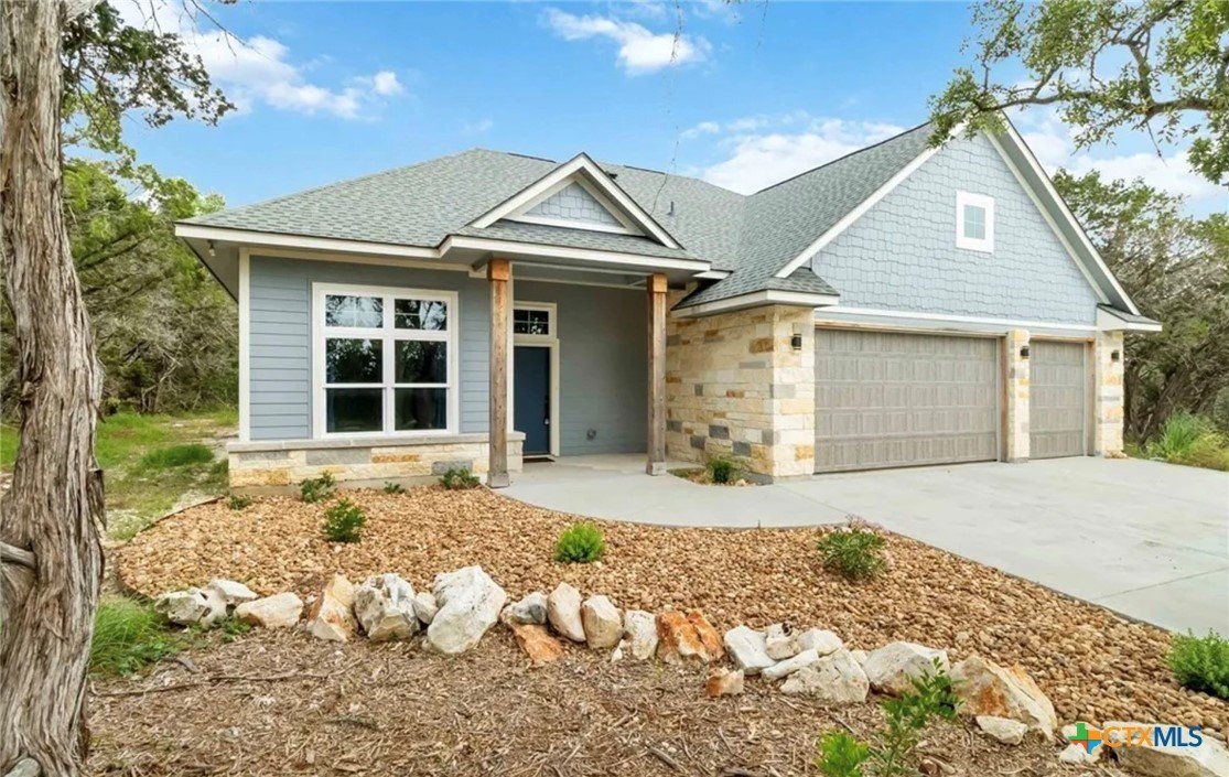 The Summit at Canyon Lake, offers two bedrooms and two bathrooms, complemented by a large three-car garage, set at the end of a private 1.256-acre wooded lot, well away from the street. A covered porch welcomes you into a house designed with high ceilings and a split floor plan. The residence exhibits a contemporary style with gray LVT flooring throughout and high windows in the living spaces and bedrooms, ensuring plenty of natural light. The kitchen merges seamlessly with the living and dining areas and is highlighted by a modern color palette with blue base cabinets, concrete countertops, state-of-the-art appliances, and a bar, all contributing to an appealing open-concept area. The expansive primary bedroom boasts an en-suite bathroom featuring a sizable walk-in shower and extensive closet space. The rear of the house opens out to a spacious concrete patio surrounded by trees, with views of a greenbelt ranch, creating a serene environment for outdoor entertainment. The three-car garage offers ample storage and a workspace. Included are a stackable washer/dryer, refrigerator, an owner-installed water softener, and a xeriscaped yard.
