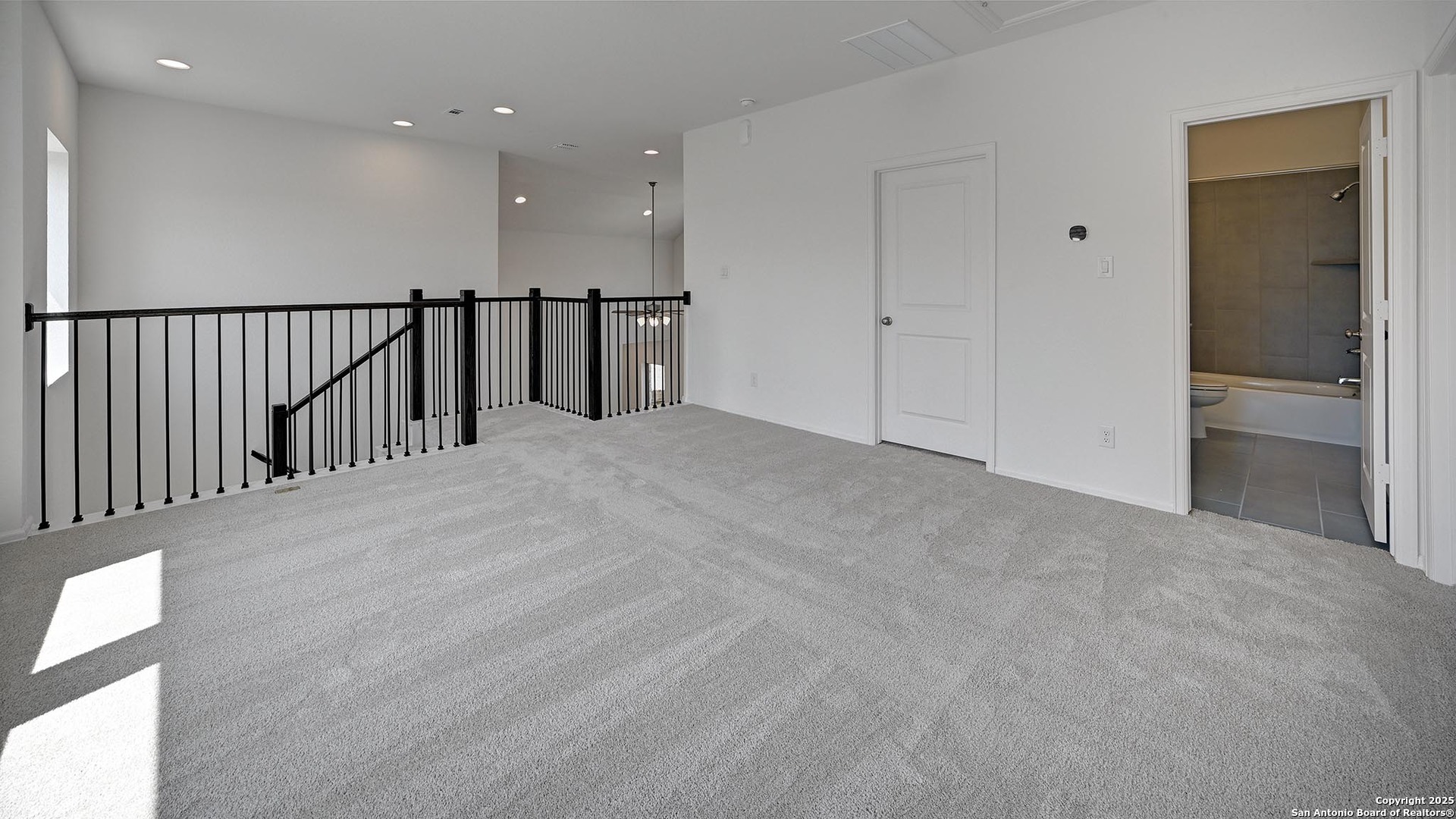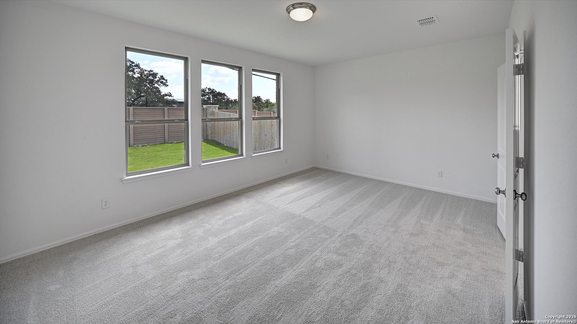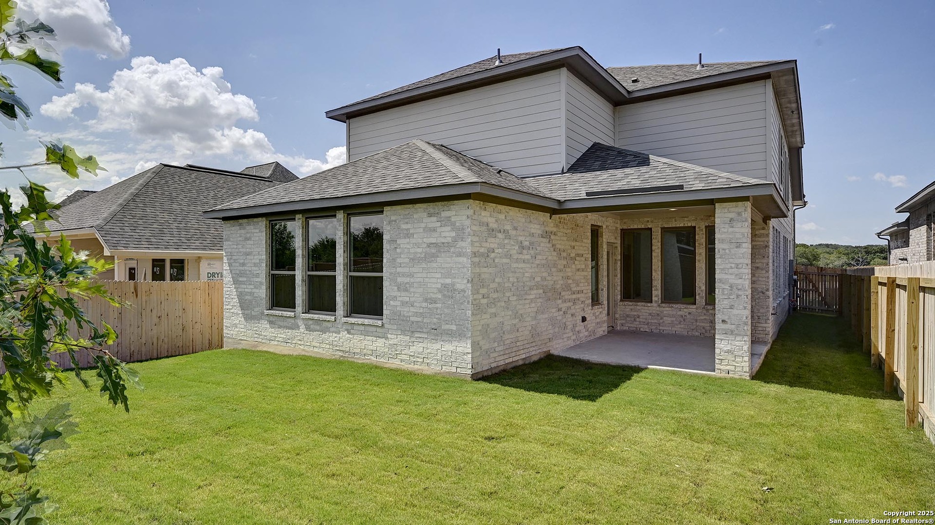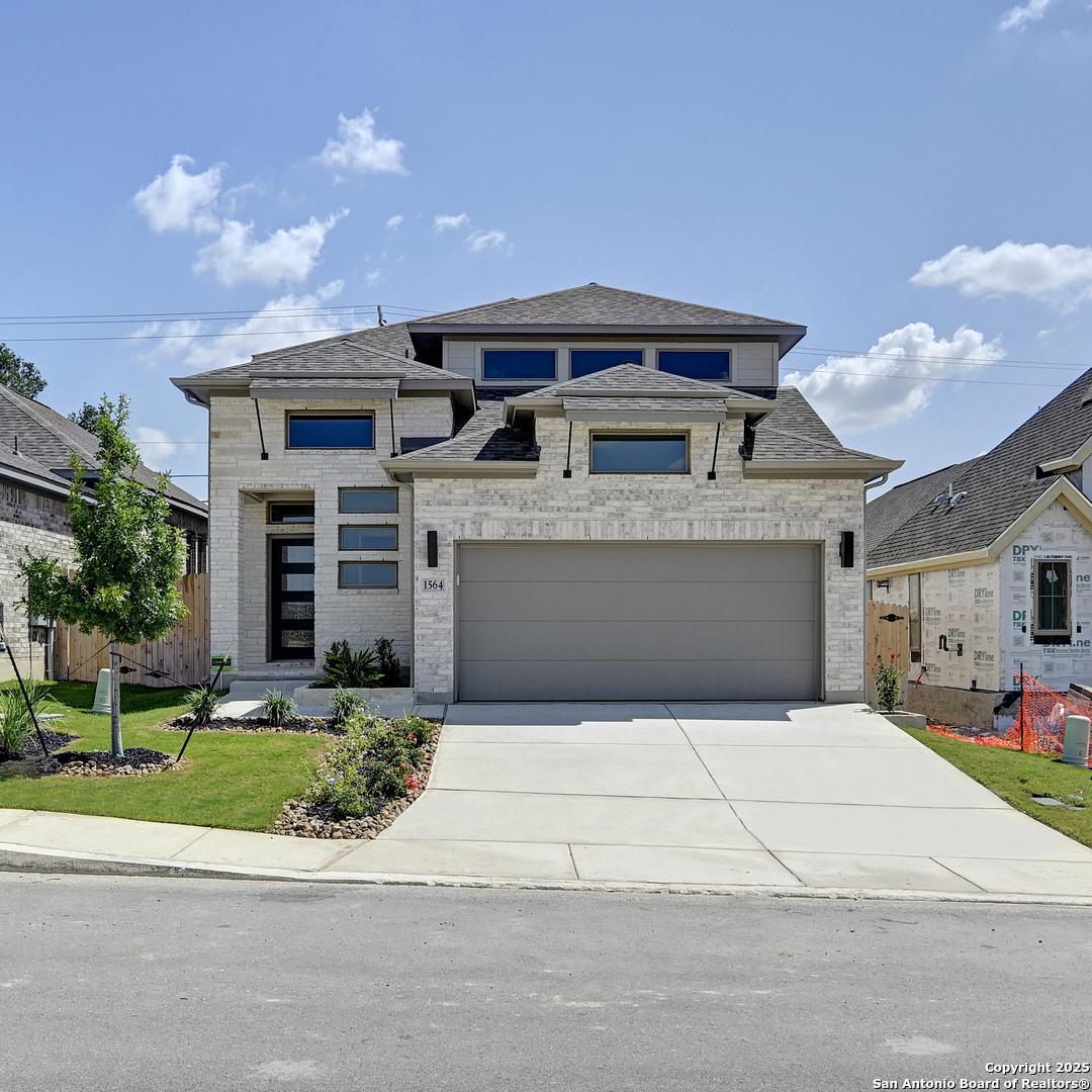 Welcoming front porch. Home office with French doors off of the family room. Two-story family room. Kitchen features an island, 5-burner gas cooktop and a large walk-in pantry. Private primary suite with three large windows that look out to the back yard. Double doors lead to the primary bath with two vanities, a large corner glass-enclosed shower and a large walk-in closet. Second level features two secondary bedrooms and a game room. Covered backyard patio and multi-zone sprinkler system. Mud room and half bath off of the two-car garage.