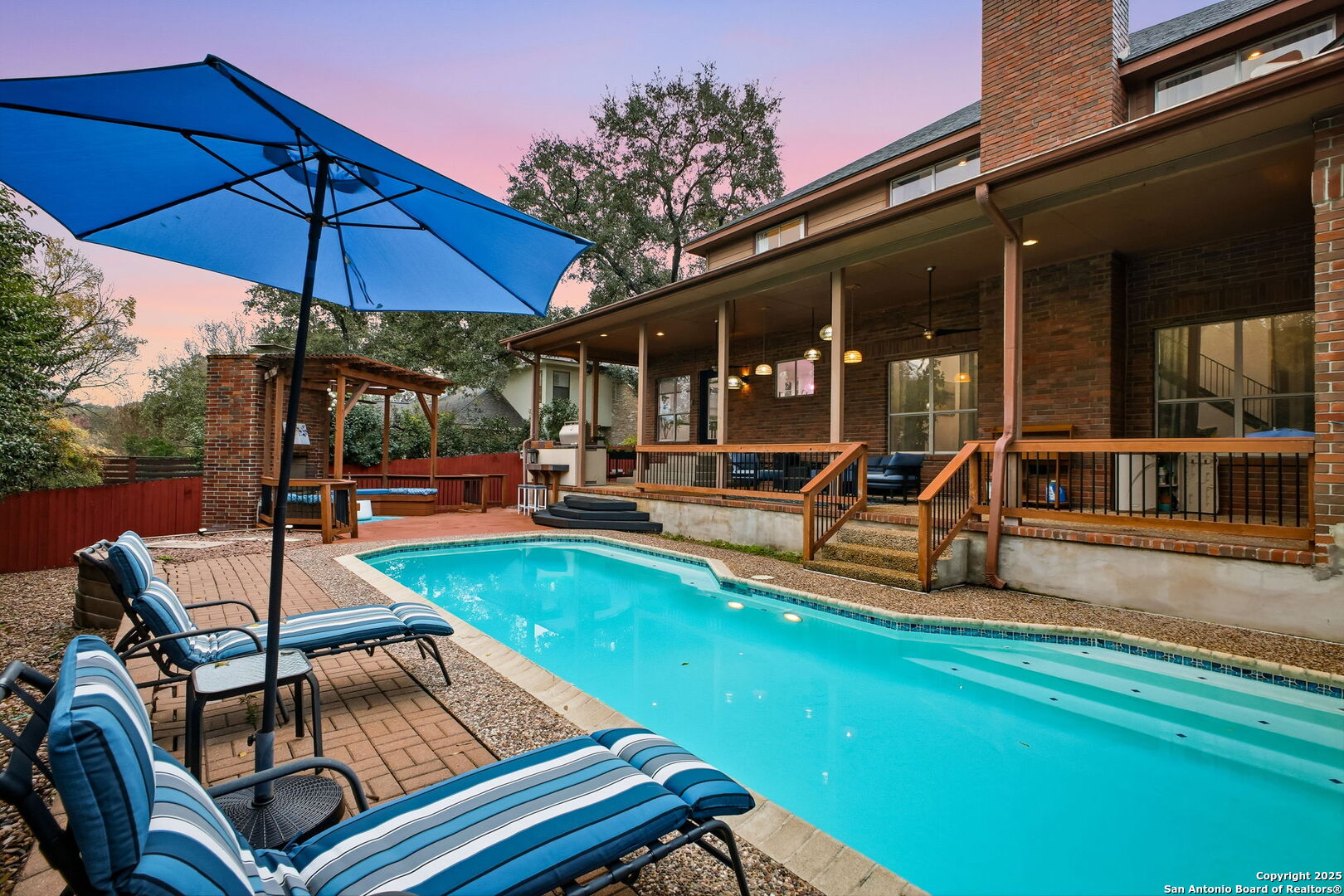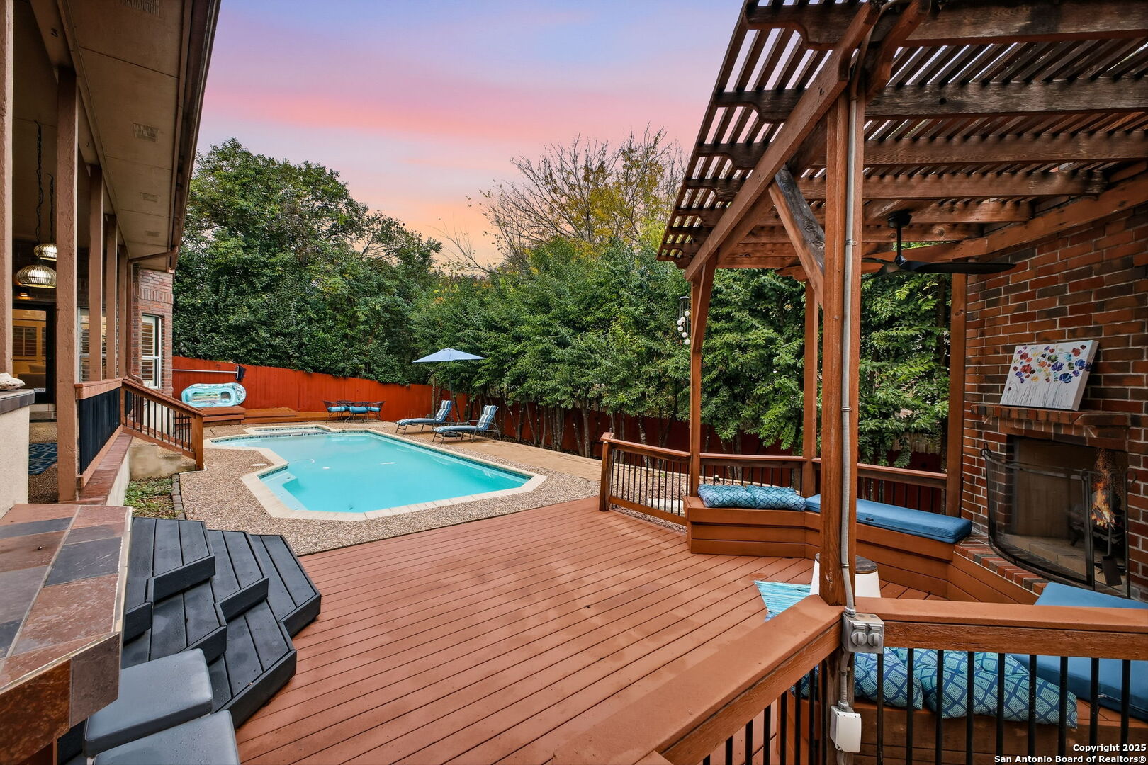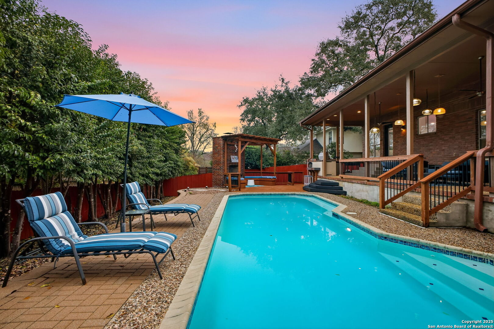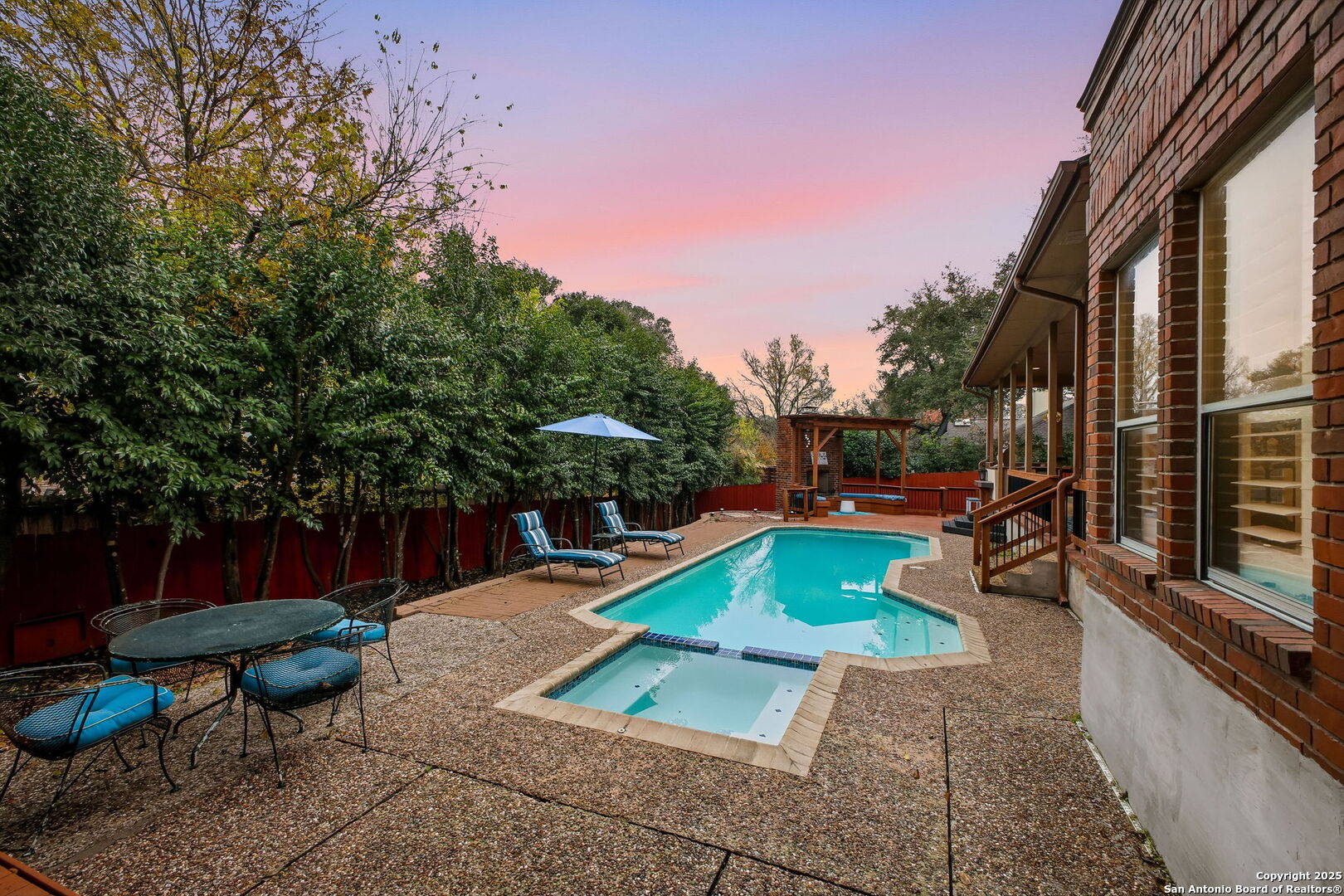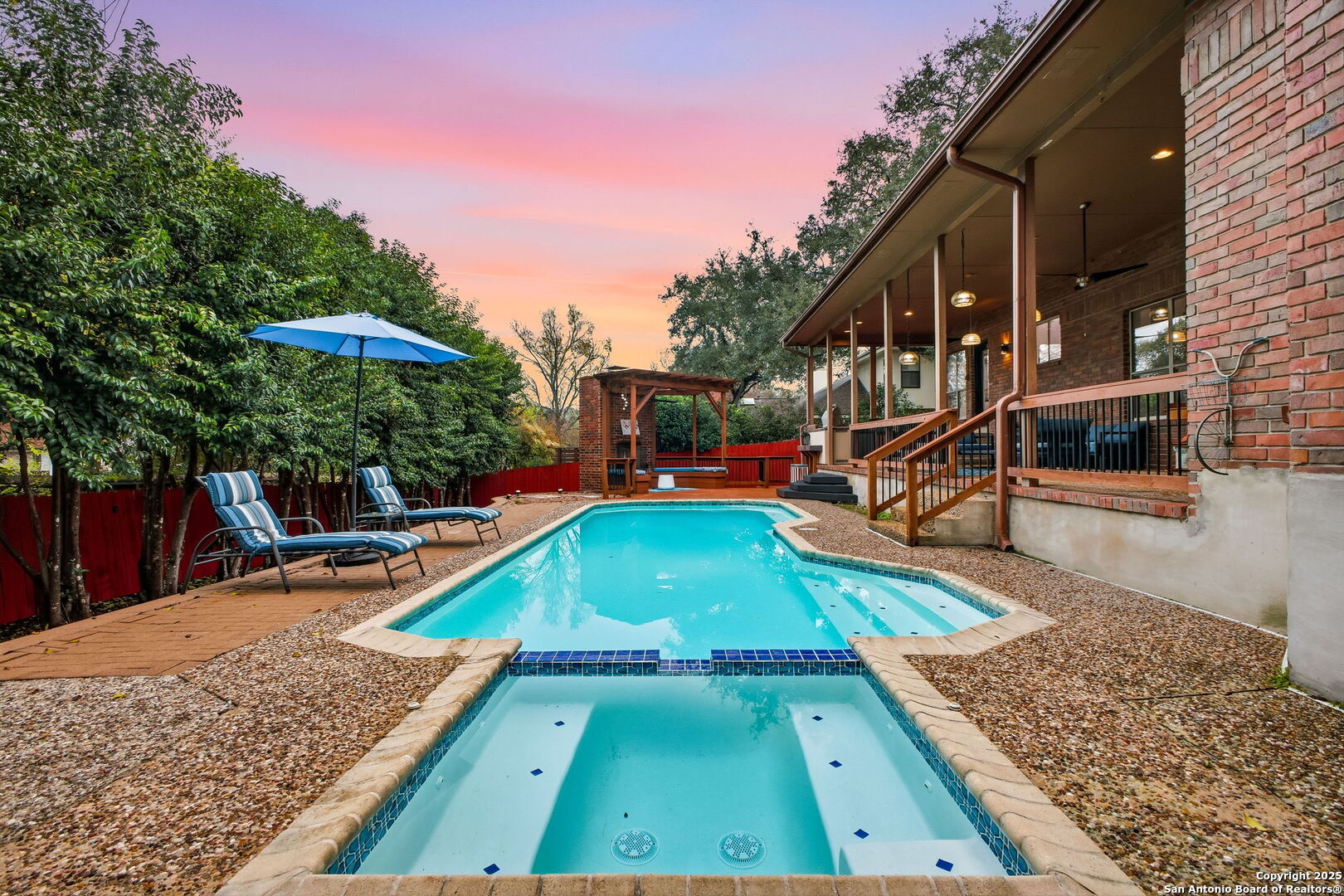 Price Improvement on this Stunning Masterpiece!! Priced to Sell and Designed for gathering, entertaining, and unwinding - this impeccably remodeled Deerfield home captures the best of San Antonio living! Step inside to soaring ceilings, abundant natural light, and an open-concept floor plan. Fresh paint, new flooring, and statement wallpaper elevate this home with a curated, high-end aesthetic. The completely updated kitchen (2023) is a showstopper - featuring brand new cabinetry, a wine fridge, striking marble countertops, all-new stainless appliances, and an oversized island with seating. Plus, the coffee bar adds the perfect touch for your morning routine. The spacious living room impresses with floor-to-ceiling windows and a dramatic fireplace centerpiece, while the downstairs master suite offers a private retreat filled with sunlight and a cozy sitting area. The primary bathroom has been fully redesigned with a large walk-in shower with dual shower heads, dual vessel sinks, and modern finishes. Downstairs also includes a flexible second living area, game room (or could be used as the study or office space) complete with a wet bar - perfect for movie nights or entertaining guests. Upstairs, find additional spacious bedrooms and beautifully updated bathrooms. Step outside to your private backyard paradise - complete with a sparkling inground pool and hot tub, lush mature landscaping, a covered patio, and a full outdoor kitchen ideal for BBQs and gatherings. Tall trees surround the back fence for complete privacy - the perfect setting for poolside relaxation or hosting friends and family. The custom pergola and built-in seating area create the ultimate spot for relaxing or entertaining under the Texas sky. With new garage doors, an updated front walkway and driveway, and meticulous landscaping, this home offers true curb appeal and move-in-ready luxury in one of San Antonio's most desirable neighborhoods. Located in the amenity-rich Deerfield community near top-rated NEISD schools, shopping, and dining - this home is the perfect combination of elegance, comfort, and convenience.