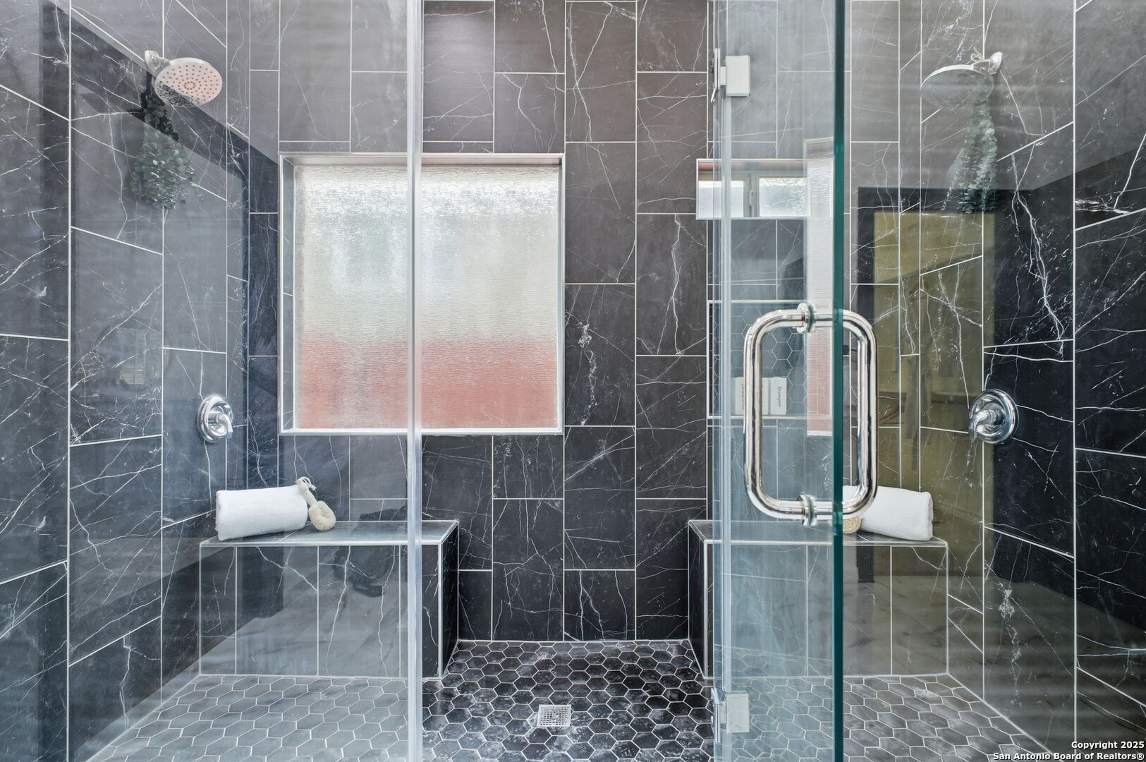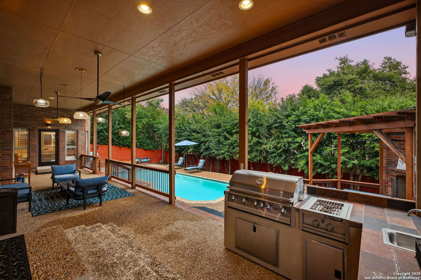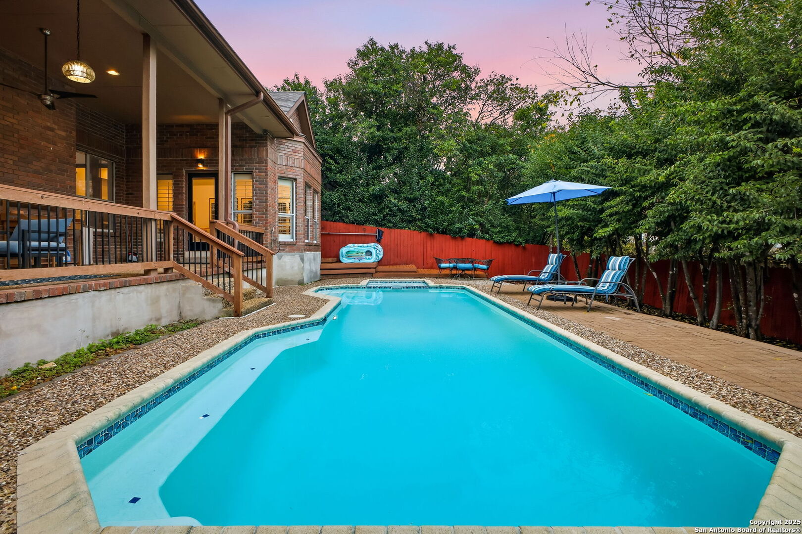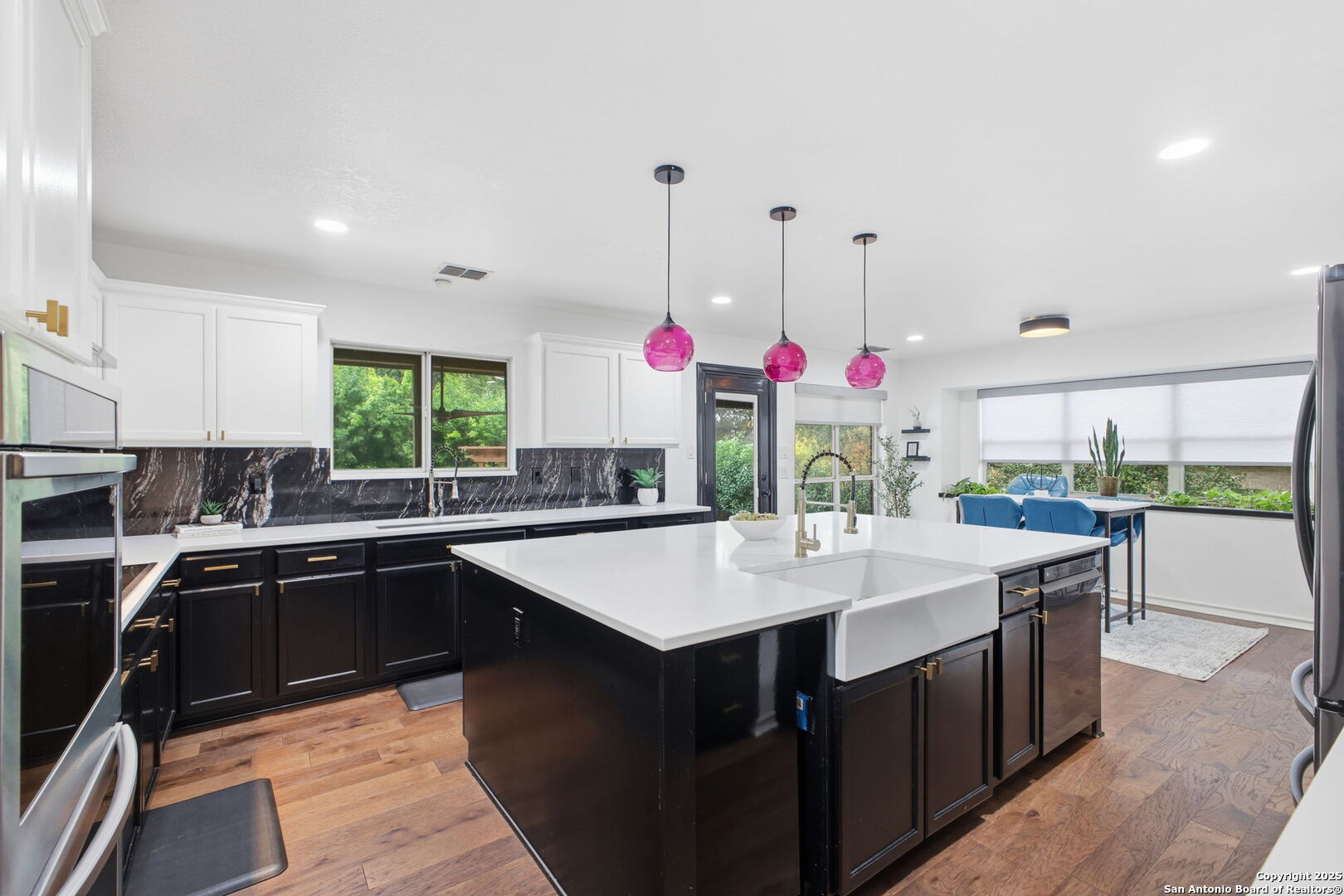Price Improvement on this Stunning Masterpiece!! Priced to Sell and Designed for gathering, entertaining, and unwinding - this impeccably remodeled Deerfield home captures the best of San Antonio living! Step inside to soaring ceilings, abundant natural light, and an open-concept floor plan. Fresh paint, new flooring, and statement wallpaper elevate this home with a curated, high-end aesthetic. The completely updated kitchen (2023) is a showstopper - featuring brand new cabinetry, a wine fridge, striking marble countertops, all-new stainless appliances, and an oversized island with seating. Plus, the coffee bar adds the perfect touch for your morning routine. The spacious living room impresses with floor-to-ceiling windows and a dramatic fireplace centerpiece, while the downstairs master suite offers a private retreat filled with sunlight and a cozy sitting area. The primary bathroom has been fully redesigned with a large walk-in shower with dual shower heads, dual vessel sinks, and modern finishes. Downstairs also includes a flexible second living area, game room (or could be used as the study or office space) complete with a wet bar - perfect for movie nights or entertaining guests. Upstairs, find additional spacious bedrooms and beautifully updated bathrooms. Step outside to your private backyard paradise - complete with a sparkling inground pool and hot tub, lush mature landscaping, a covered patio, and a full outdoor kitchen ideal for BBQs and gatherings. Tall trees surround the back fence for complete privacy - the perfect setting for poolside relaxation or hosting friends and family. The custom pergola and built-in seating area create the ultimate spot for relaxing or entertaining under the Texas sky. With new garage doors, an updated front walkway and driveway, and meticulous landscaping, this home offers true curb appeal and move-in-ready luxury in one of San Antonio's most desirable neighborhoods. Located in the amenity-rich Deerfield community near top-rated NEISD schools, shopping, and dining - this home is the perfect combination of elegance, comfort, and convenience.