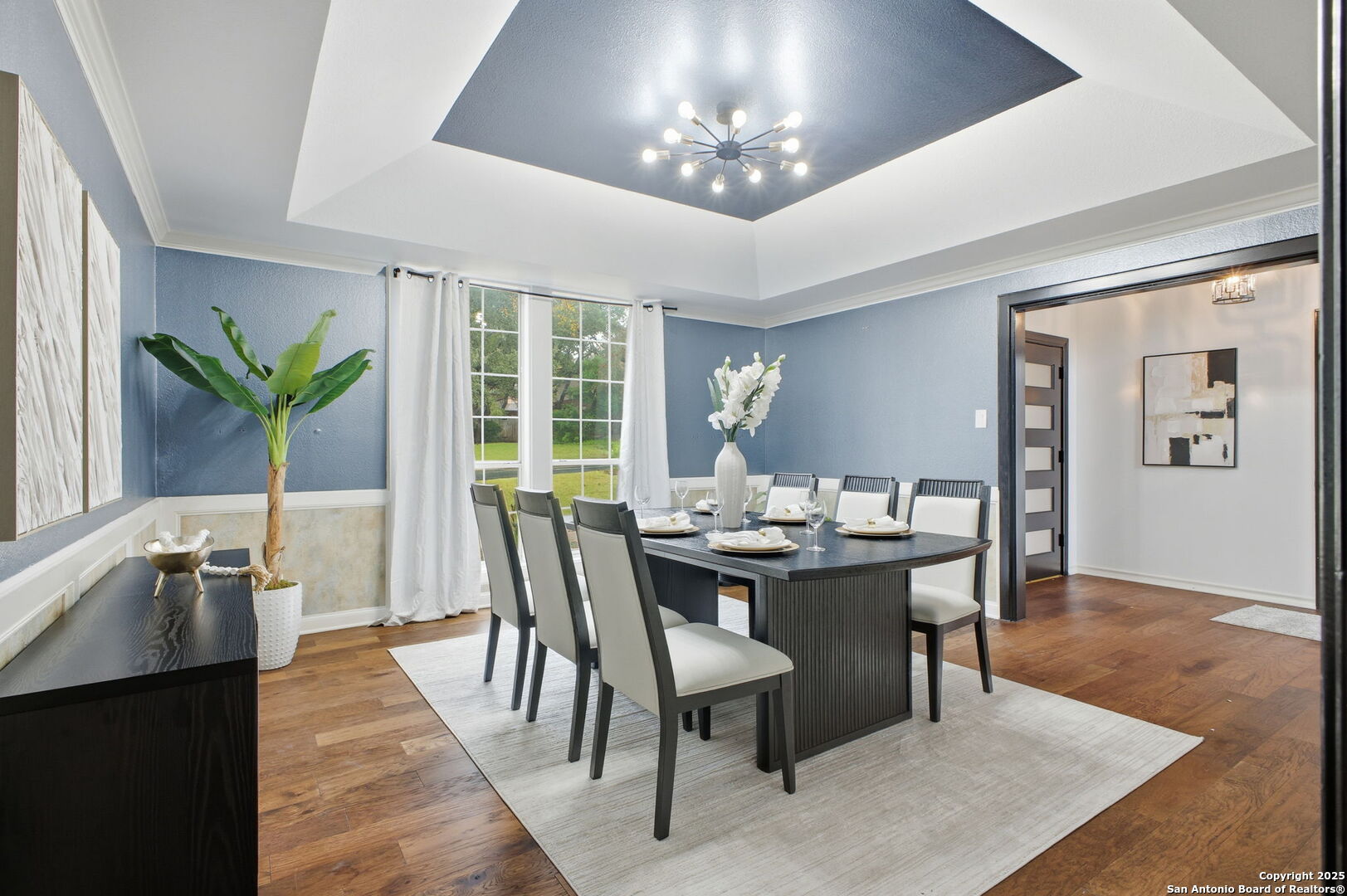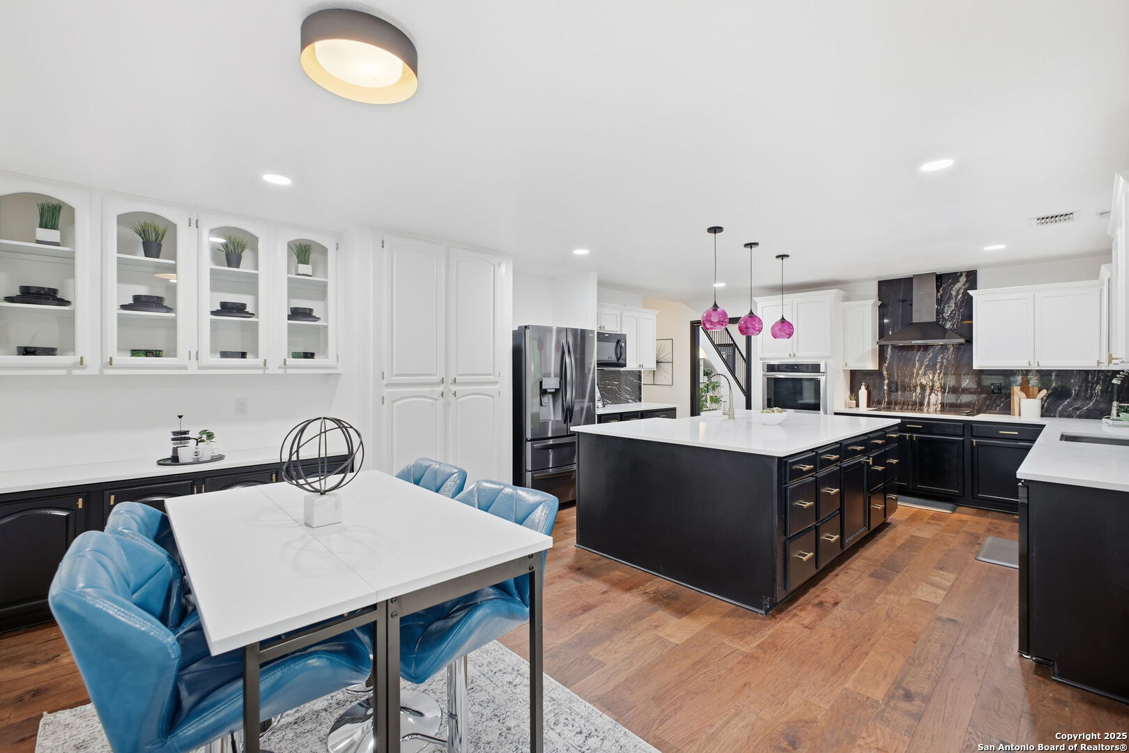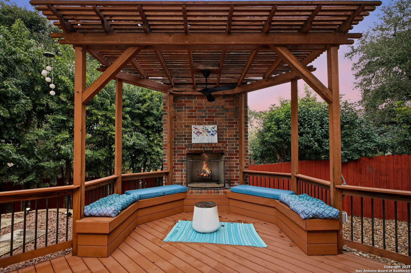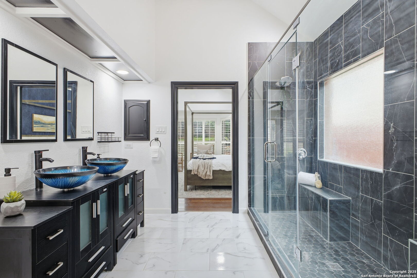 Price Improvement on this Stunning Masterpiece!! Priced to Sell and Designed for gathering, entertaining, and unwinding - this impeccably remodeled Deerfield home captures the best of San Antonio living! Step inside to soaring ceilings, abundant natural light, and an open-concept floor plan. Fresh paint, new flooring, and statement wallpaper elevate this home with a curated, high-end aesthetic. The completely updated kitchen (2023) is a showstopper - featuring brand new cabinetry, a wine fridge, striking marble countertops, all-new stainless appliances, and an oversized island with seating. Plus, the coffee bar adds the perfect touch for your morning routine. The spacious living room impresses with floor-to-ceiling windows and a dramatic fireplace centerpiece, while the downstairs master suite offers a private retreat filled with sunlight and a cozy sitting area. The primary bathroom has been fully redesigned with a large walk-in shower with dual shower heads, dual vessel sinks, and modern finishes. Downstairs also includes a flexible second living area, game room (or could be used as the study or office space) complete with a wet bar - perfect for movie nights or entertaining guests. Upstairs, find additional spacious bedrooms and beautifully updated bathrooms. Step outside to your private backyard paradise - complete with a sparkling inground pool and hot tub, lush mature landscaping, a covered patio, and a full outdoor kitchen ideal for BBQs and gatherings. Tall trees surround the back fence for complete privacy - the perfect setting for poolside relaxation or hosting friends and family. The custom pergola and built-in seating area create the ultimate spot for relaxing or entertaining under the Texas sky. With new garage doors, an updated front walkway and driveway, and meticulous landscaping, this home offers true curb appeal and move-in-ready luxury in one of San Antonio's most desirable neighborhoods. Located in the amenity-rich Deerfield community near top-rated NEISD schools, shopping, and dining - this home is the perfect combination of elegance, comfort, and convenience.
